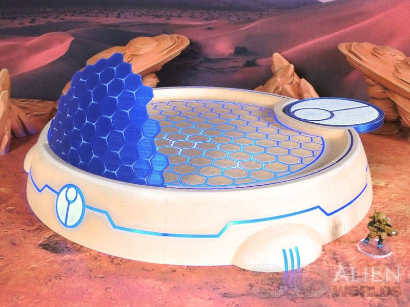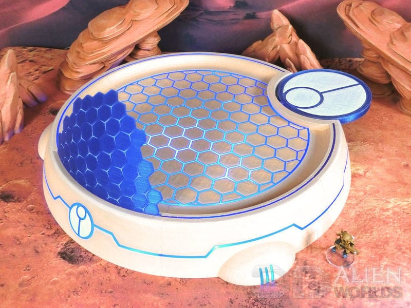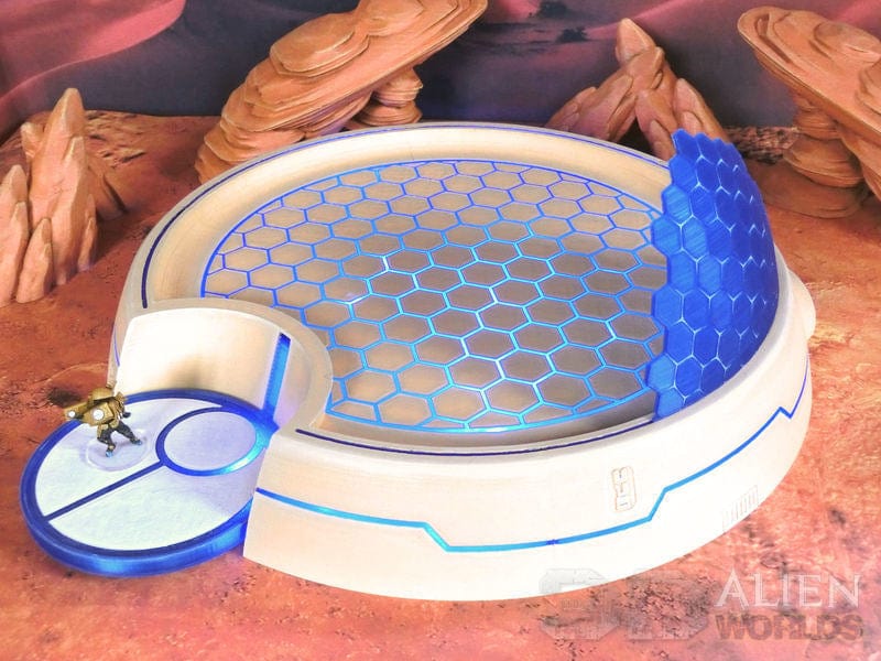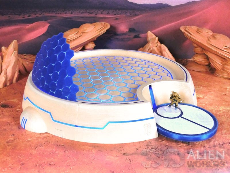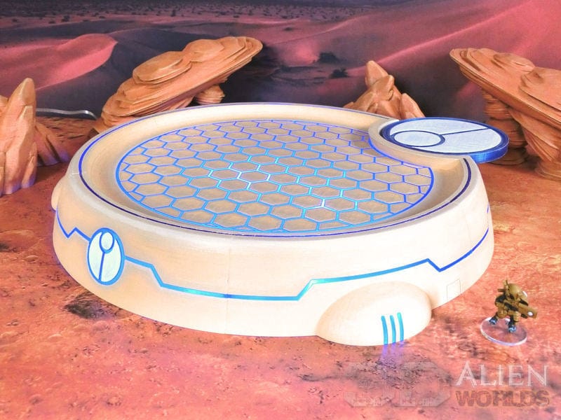 Styled in distinctive rounded shapes, this landing pad is perfect for hi-tech and advanced sci-fi alien settings. This landing pad is designed with several unique features - a removable force shield can be swiveled around during play to provide protection against incoming fire, and the energy lift can be lowered to ground level or raised to the height of the landing pad surface.