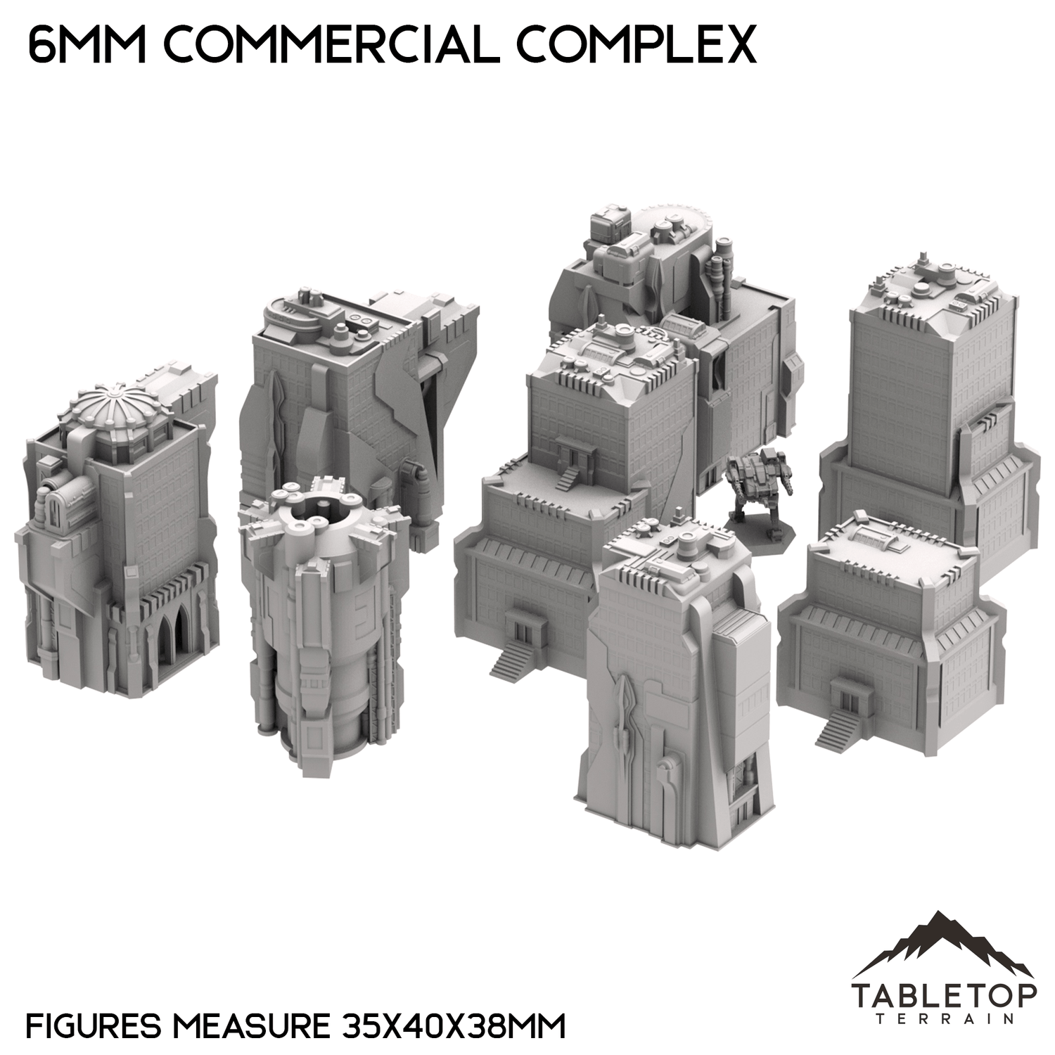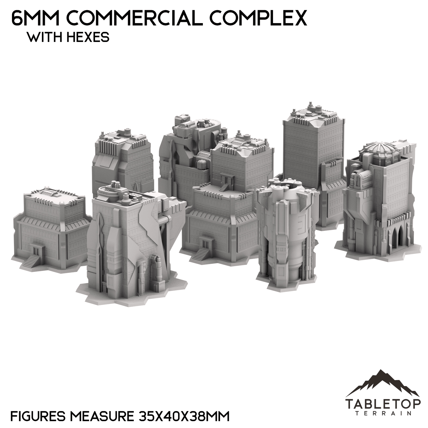 A set of 8 6mm Sci-Fi Commercial Complex buildings. You can choose to have them come with or without hexes. It would work great in any 6mm mech scale tabletop wargame.