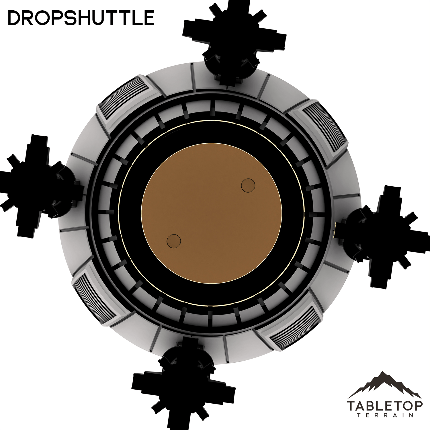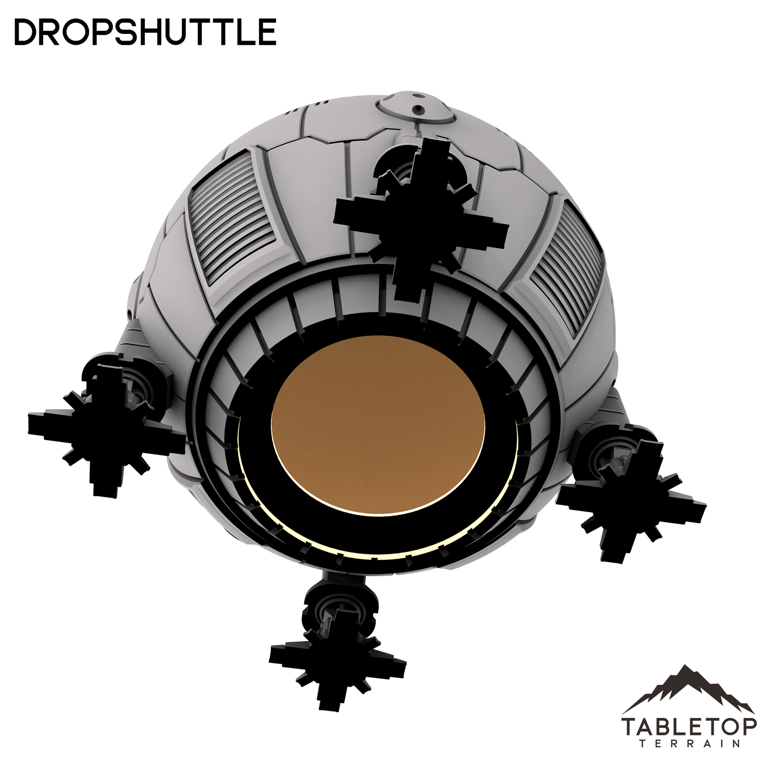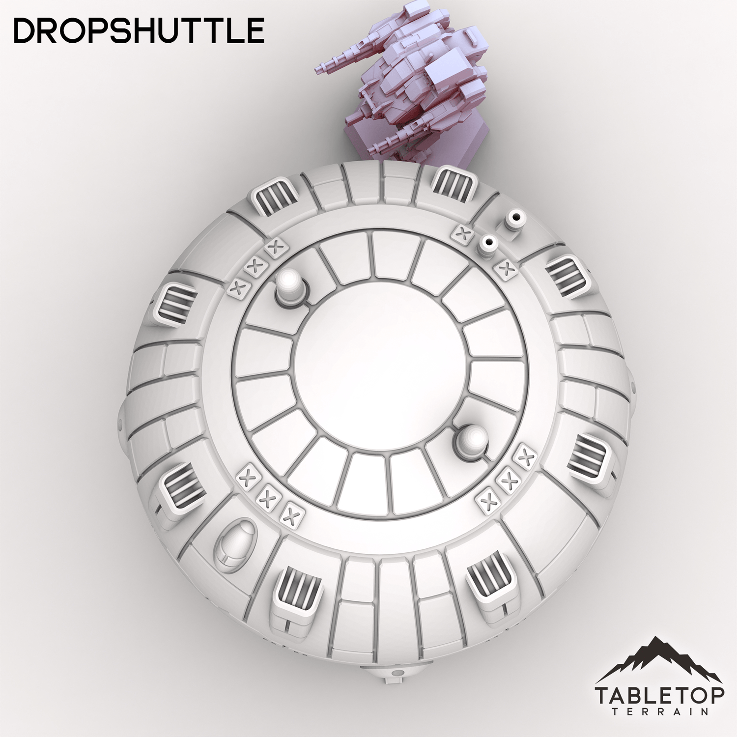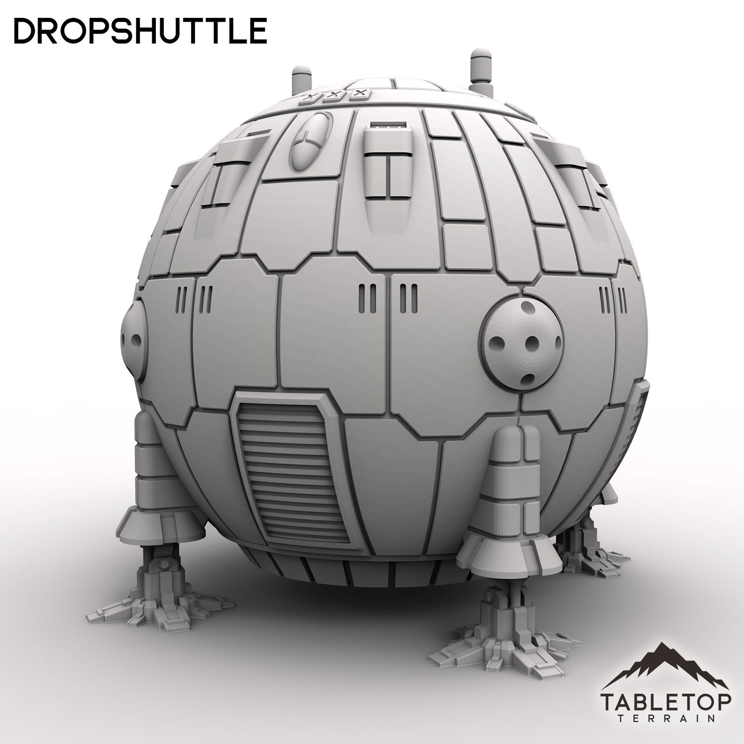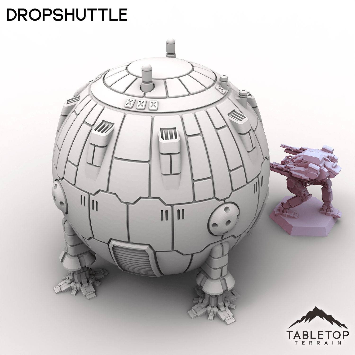 The Dropshuttle is a simple design, made for getting a single mech onto the field. The design is straight-forward with a hollow interior, because sometimes the classics are all that you need. This set is scaled for mech games and 6mm games, but could be used for a variety of sci-fi or cyber punk tabletop games if you'd prefer.