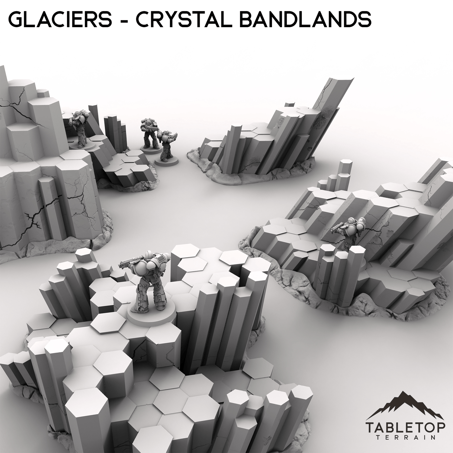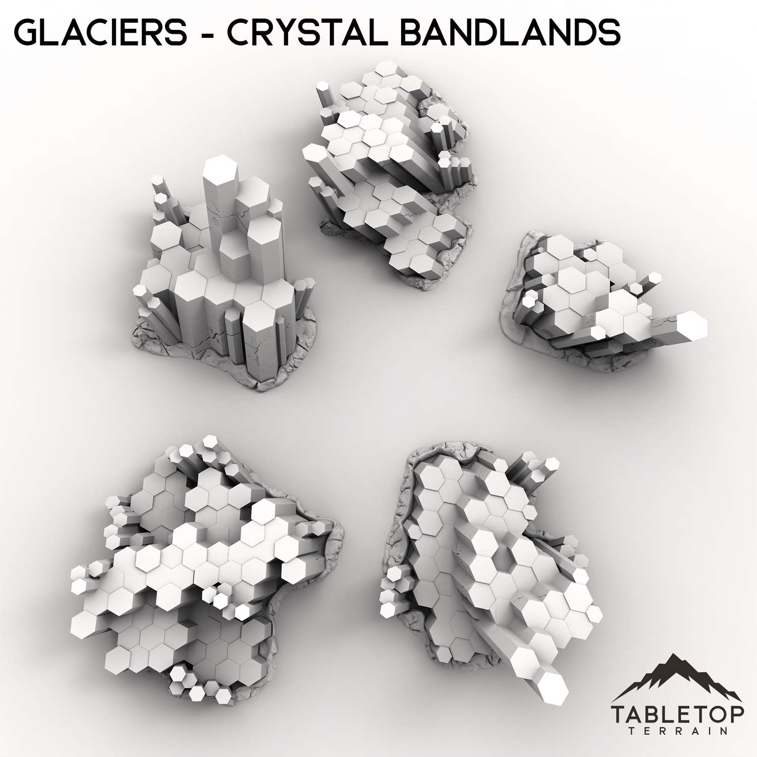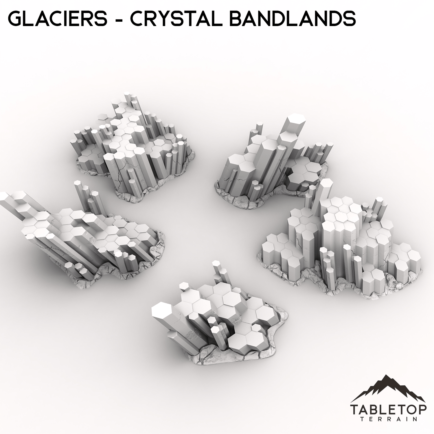 Glaciers is a set of large, chunky crystals growing out of the ground. They are sized to allow minis to be set on the platforms, or to work as large pieces of cover. They are designed for sci-fi games, but can be used for any genre of tabletop game. Consider combing them with other sets from the Crystal Badlands collection to fill out your tabletop!