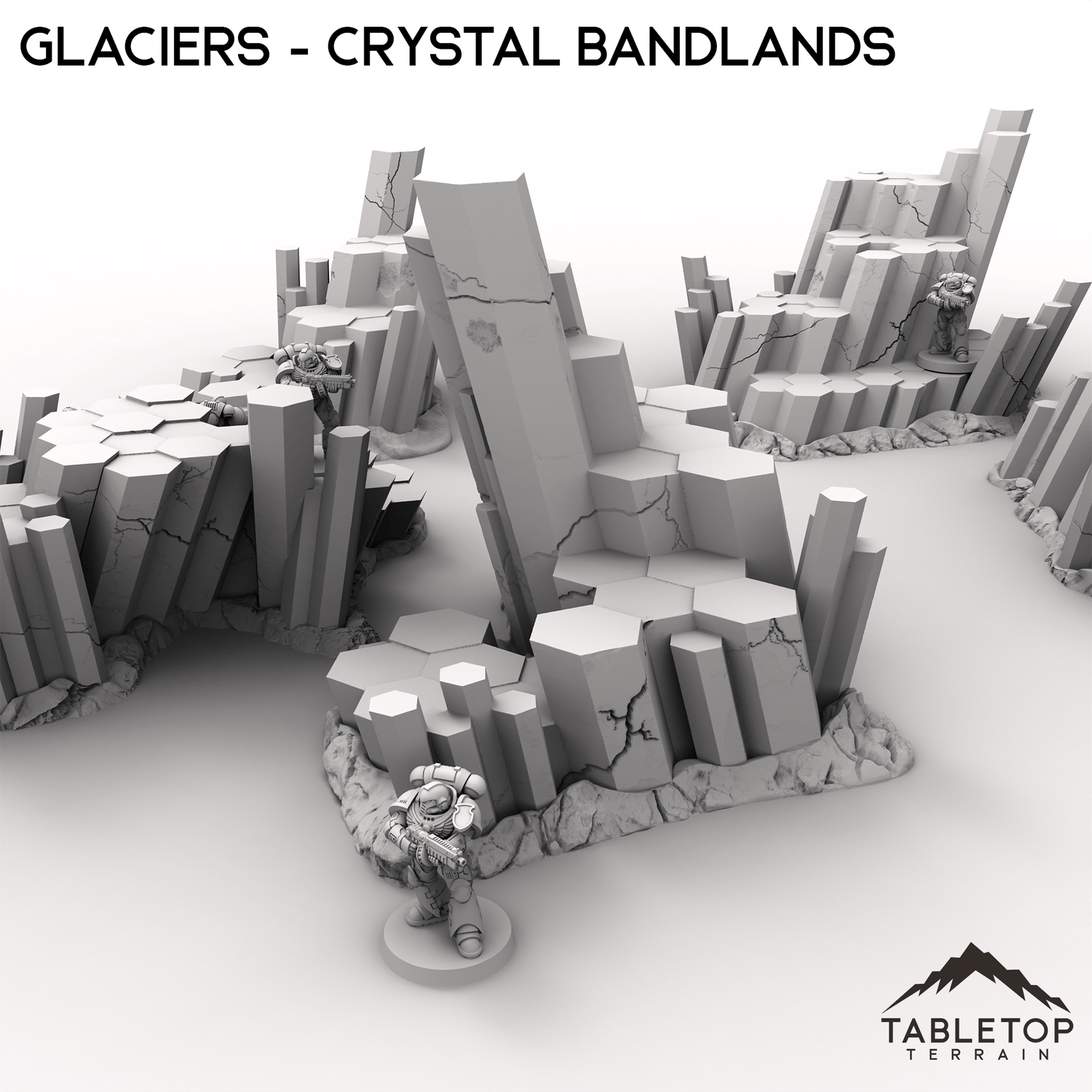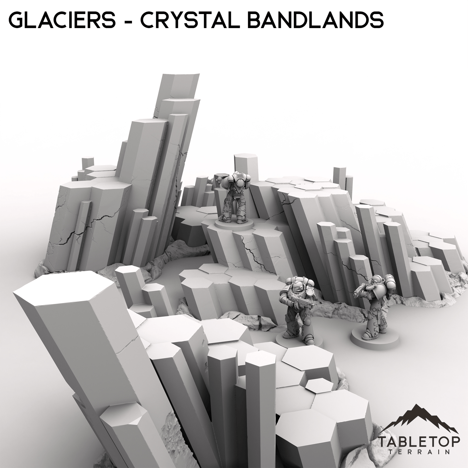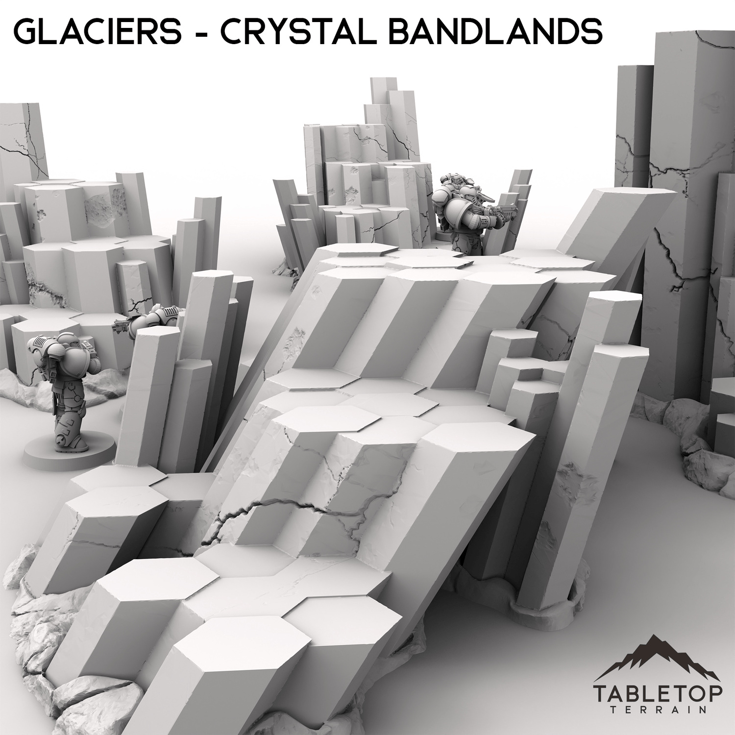 Glaciers is a set of large, chunky crystals growing out of the ground. They are sized to allow minis to be set on the platforms, or to work as large pieces of cover. They are designed for sci-fi games, but can be used for any genre of tabletop game. Consider combing them with other sets from the Crystal Badlands collection to fill out your tabletop!