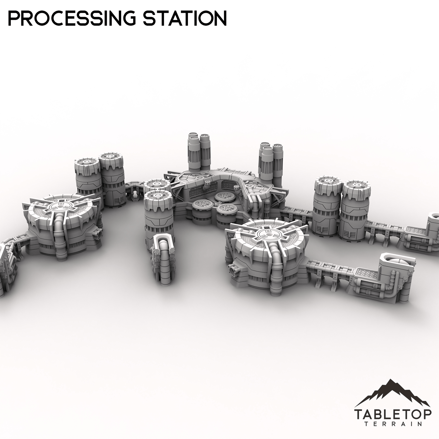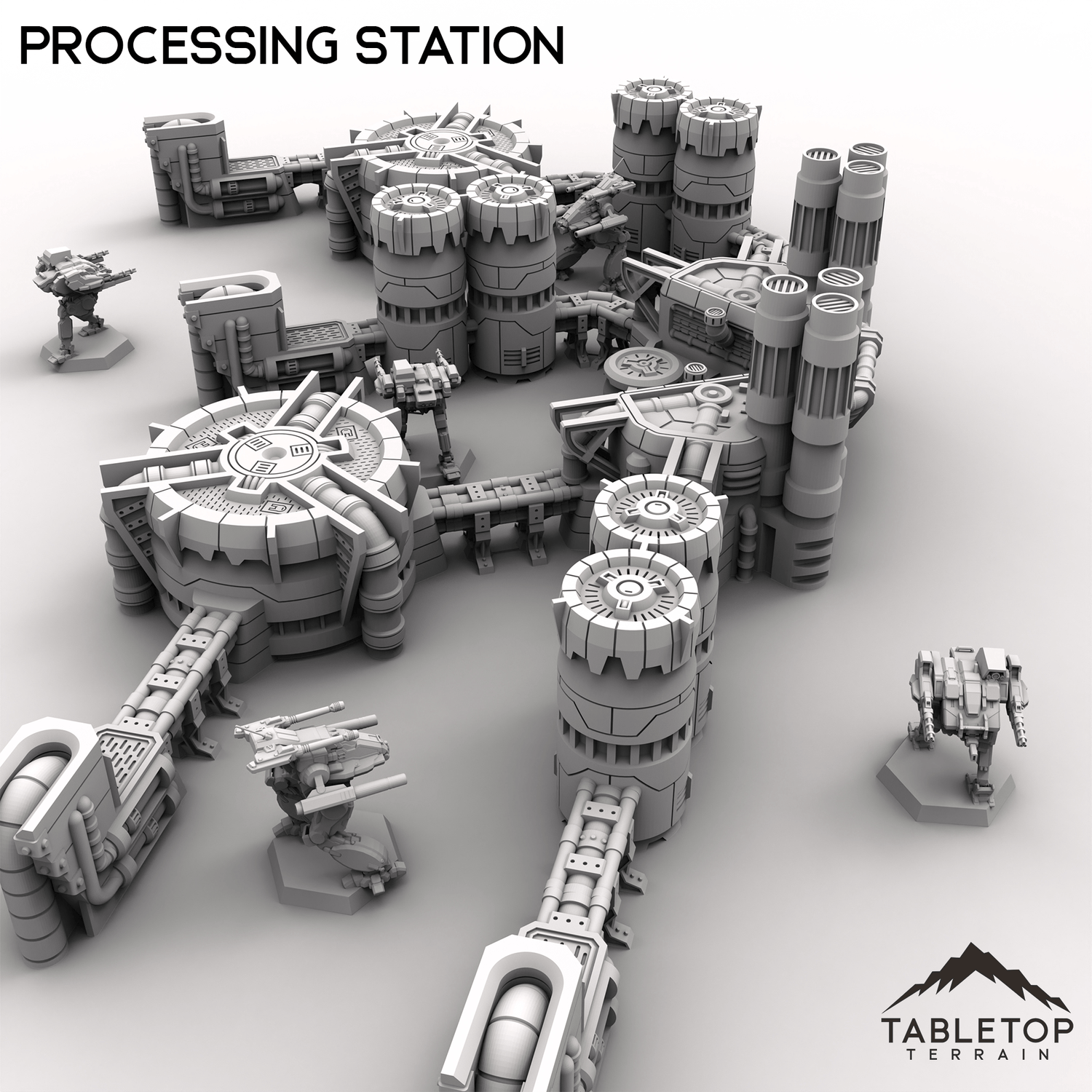 HEXTECH Industrial Fluidworks is a modular set of processing and storage plants, complete with a full set of pipes and connectors. The connections in the Fluidworks set are all fully compatible with the Power Complex sets. The Fluidworks can be used piece by piece as terrain scatter, or arranged into whatever type of layout you need. The styling of the Fluidworks set is made to match the look and feel of the Trinity City collection as well.