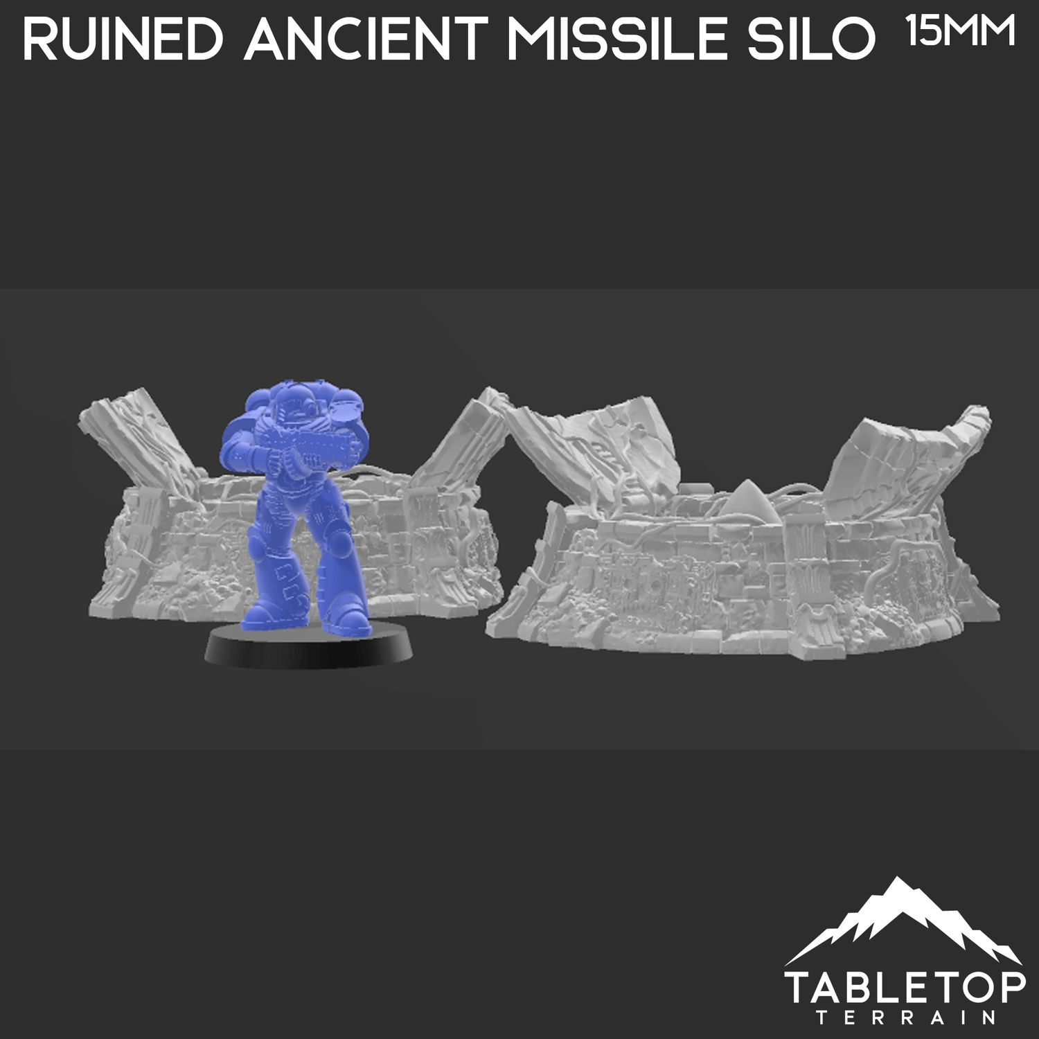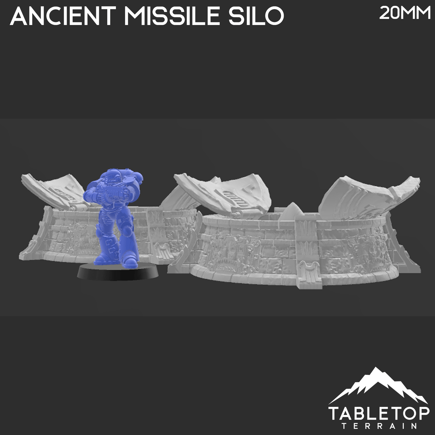 The Ancient Missile Silo are scatter terrain for fantasy or sci-fi tabletop and role-playing games. Available as a forgotten relic or as a working silo, each set comes with a silo that has the top of a missile and one that is empty. It is 3D printed in 32mm,  28mm, 20mm or 15mm scale in .2mm resolution.