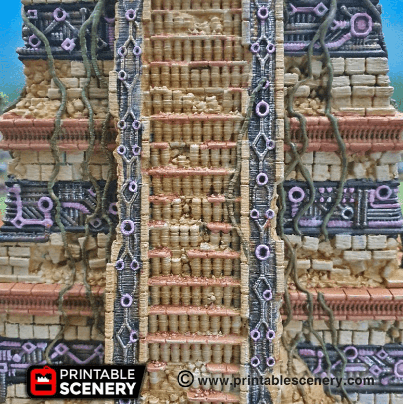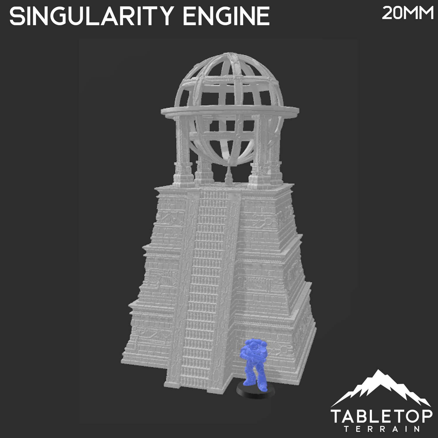 The Singularity Engine is a steep pyramid structure suitable for fantasy or sci-fi tabletop and role-playing games. An Ancient Alien engine attached to the top of the pyramid it can serve as an excellent central feature for any gaming table. Utilizing Printable Scenery's Openlock design, it can be combined with other Openlock pieces to create different designs if you get tired of this configuration. It is 3D printed in 32mm,  28mm, 20mm or 15mm scale in .2mm resolution.