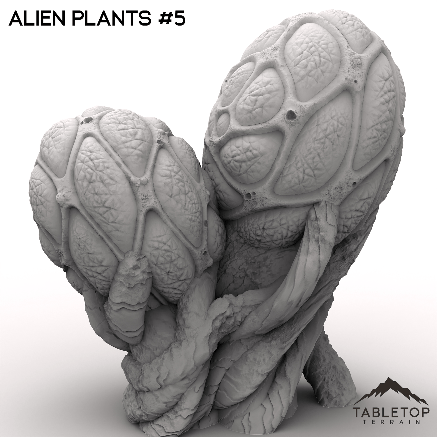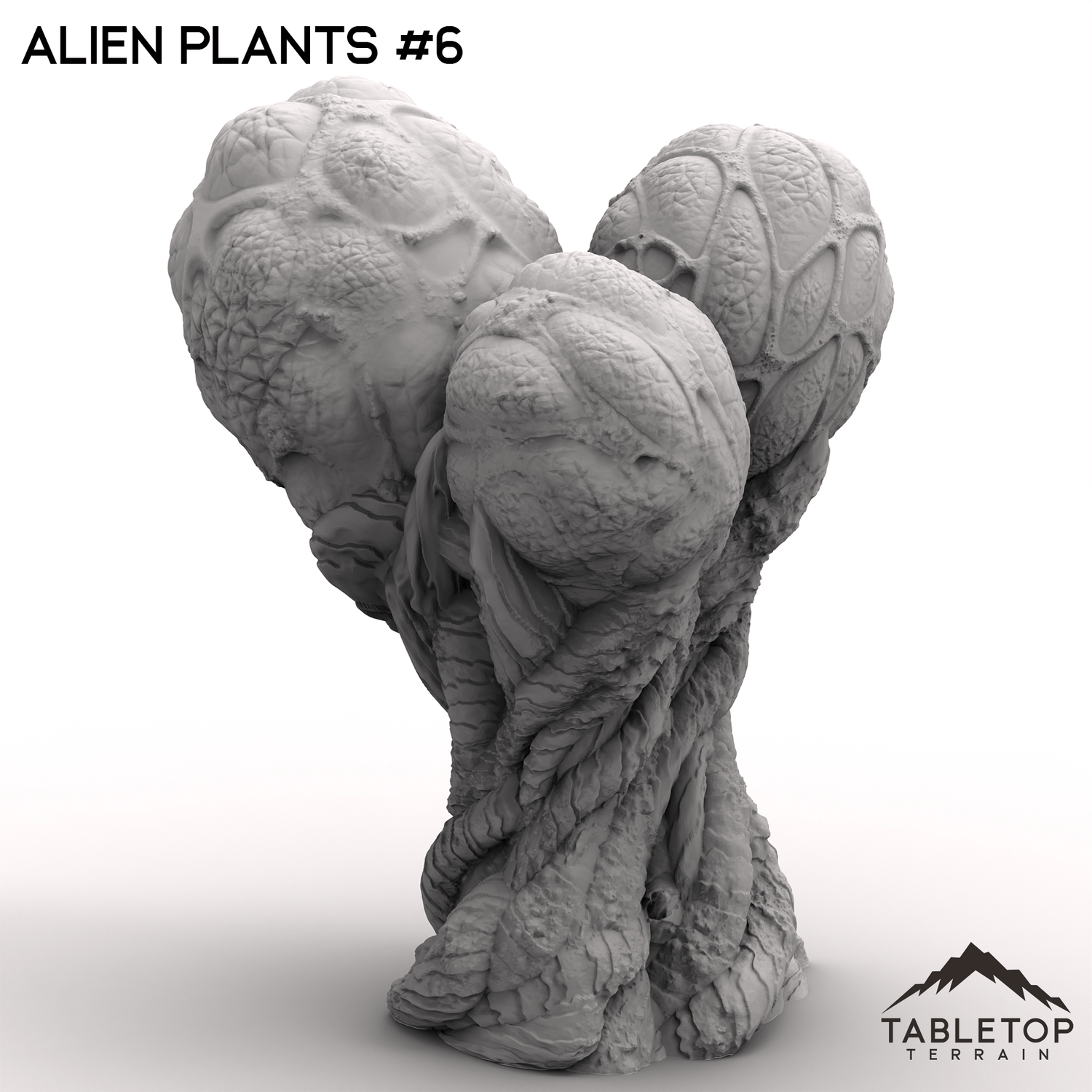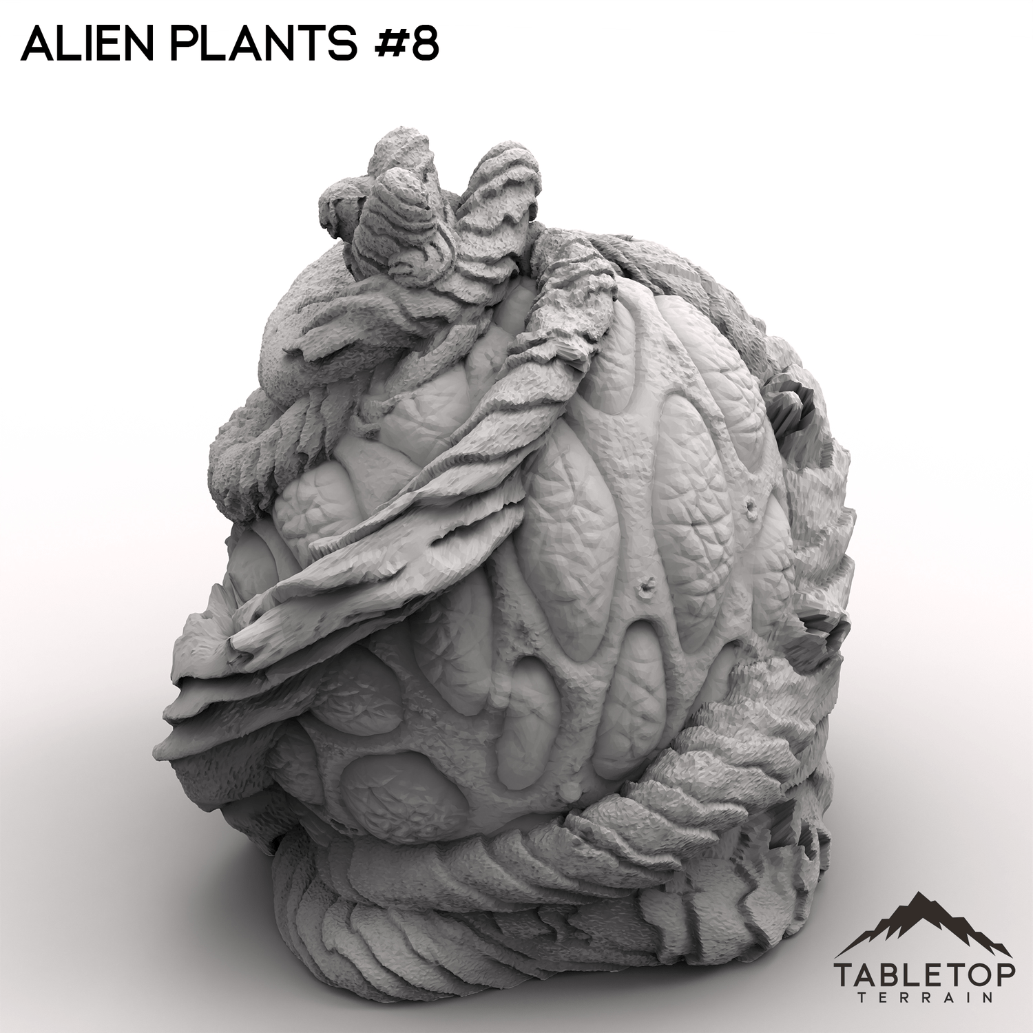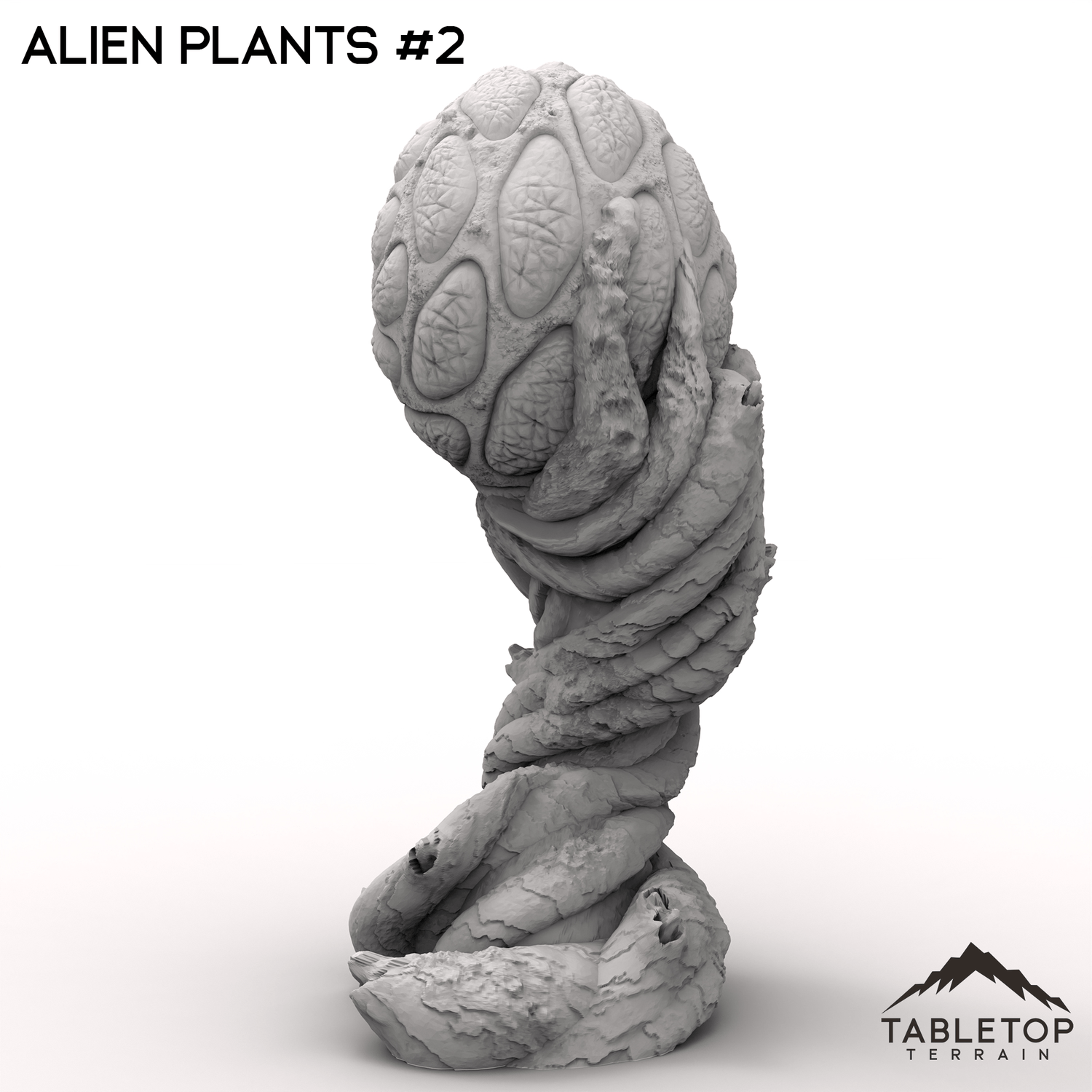 The alien plants tower in a strange and ominous formation, their bulbous pods glowing and ready to burst. Each vine twists and coils, seemingly alive, ready to react to any disturbances in the air around them. Amid the dense alien flora, explorers tread carefully, knowing the plants could hold either valuable resources or hidden dangers.