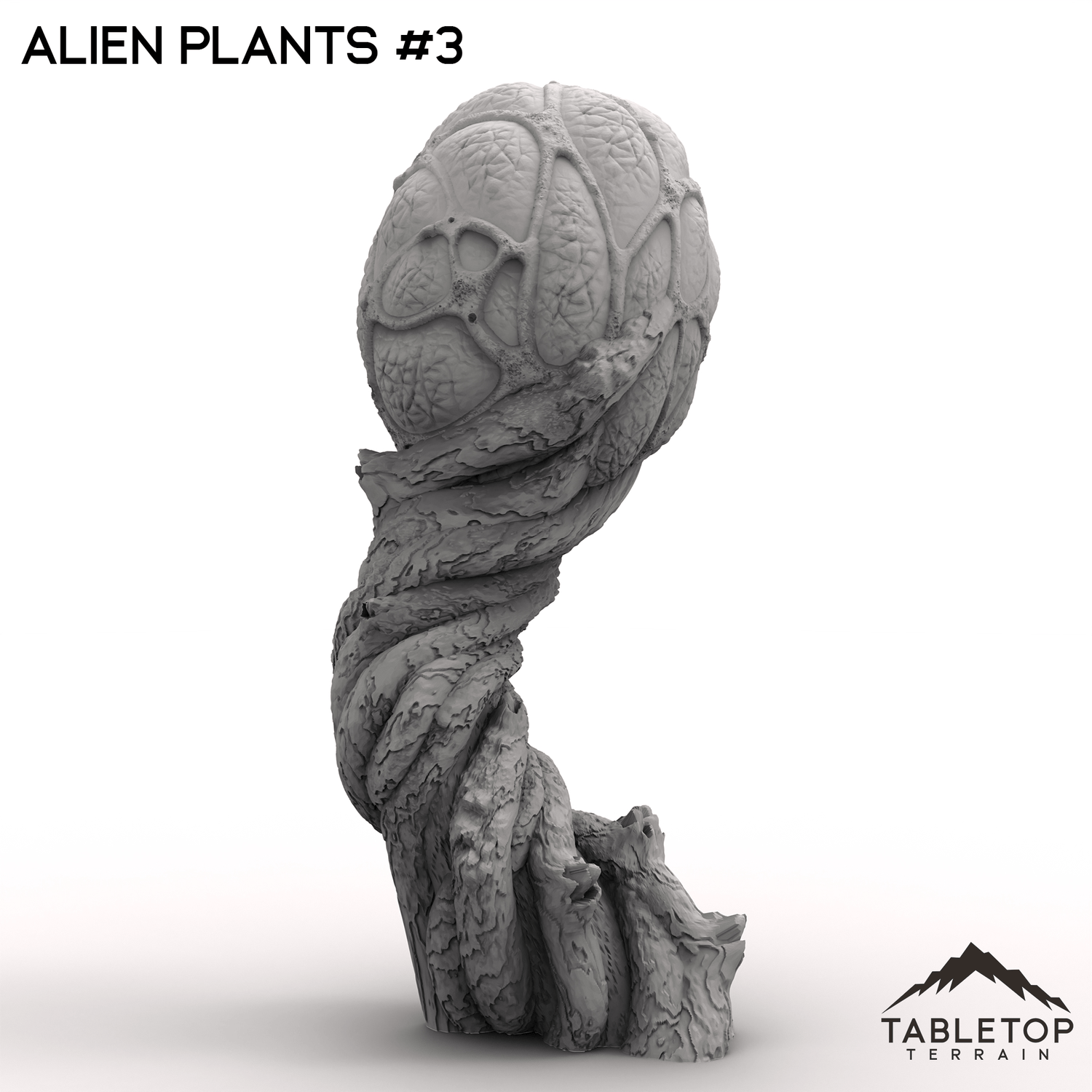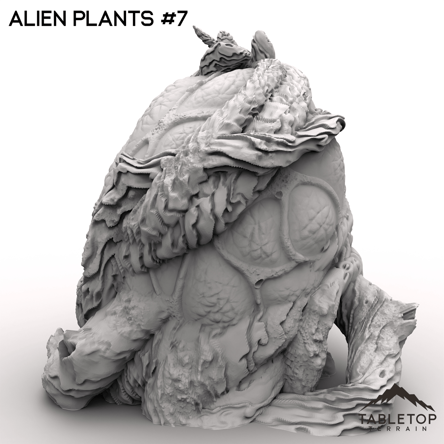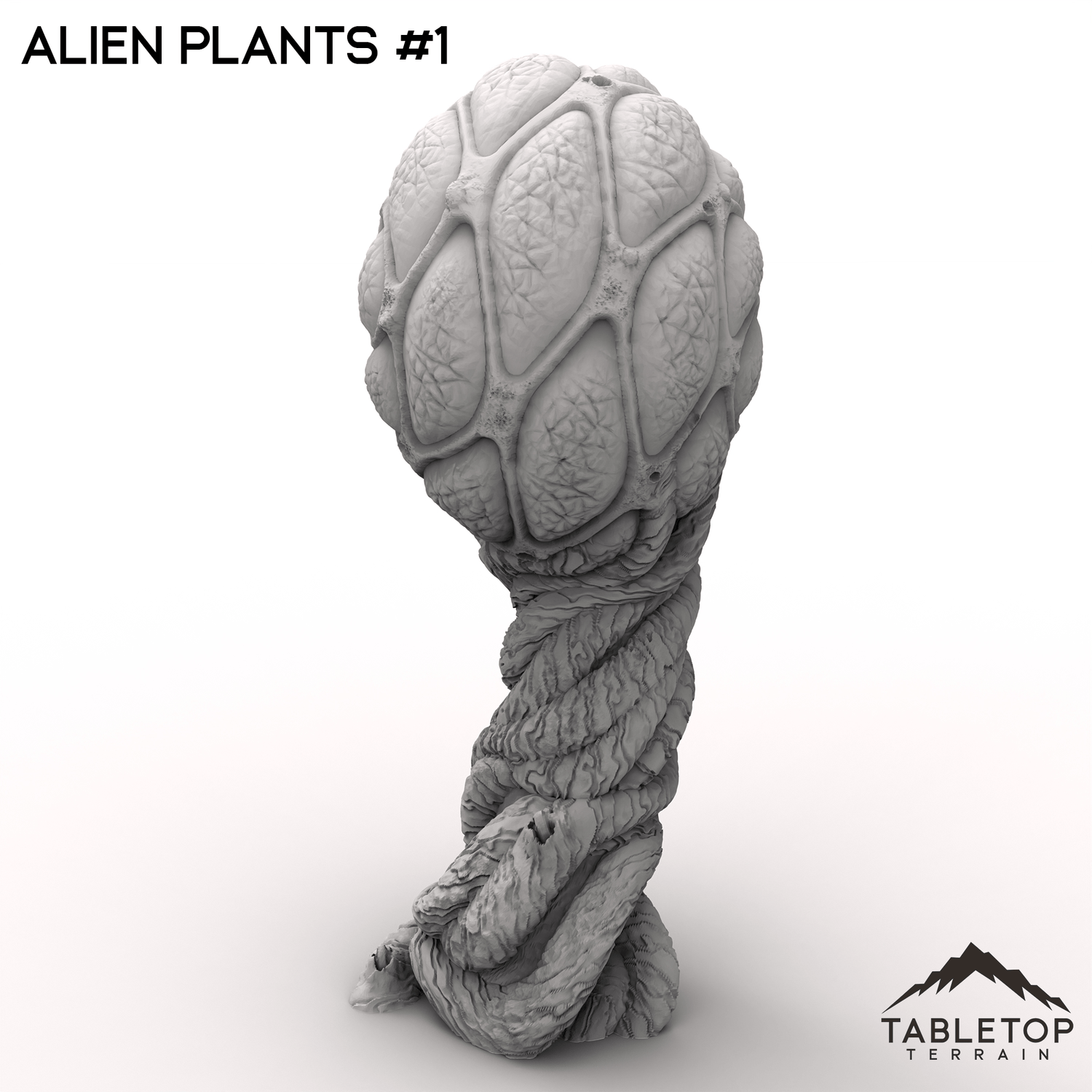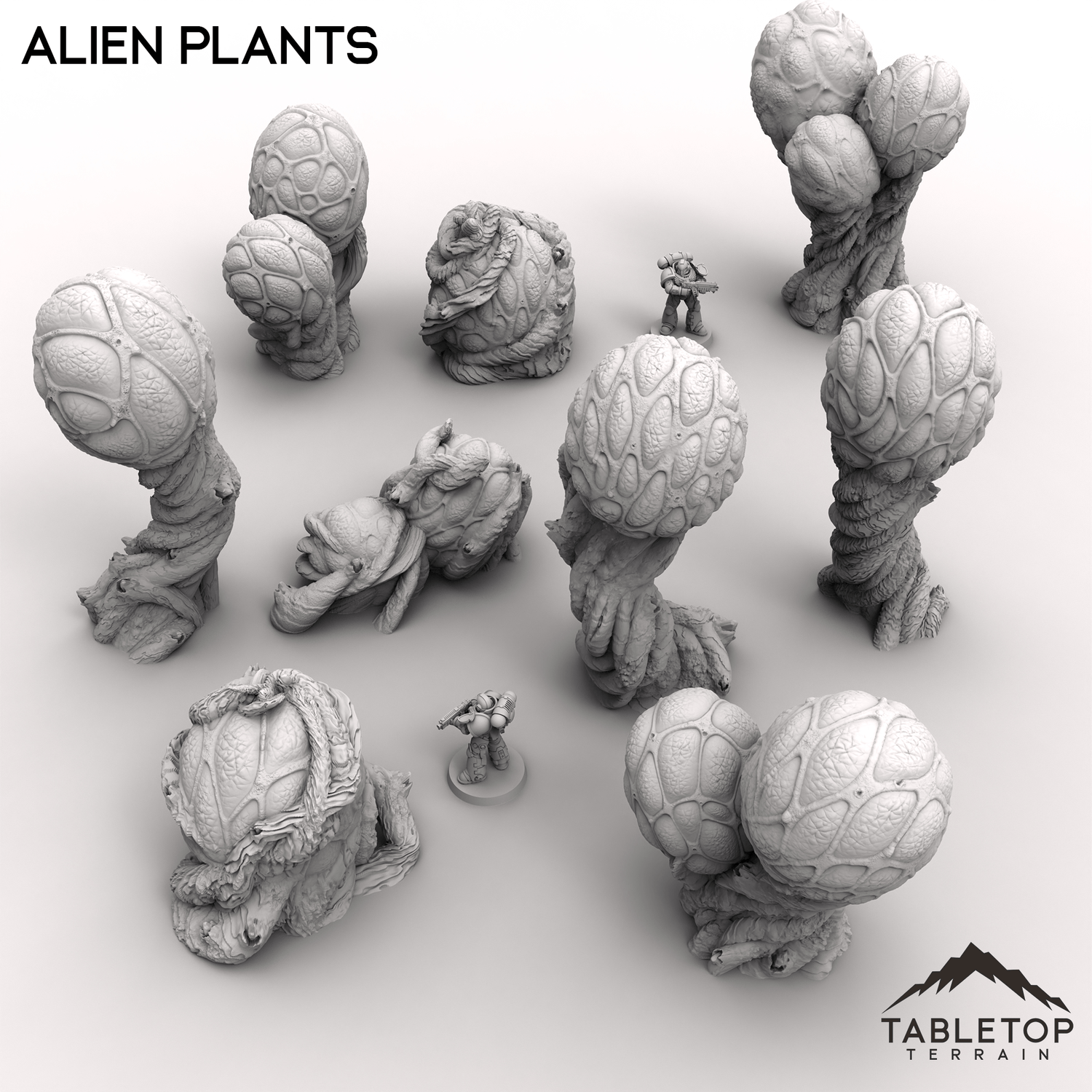 The alien plants tower in a strange and ominous formation, their bulbous pods glowing and ready to burst. Each vine twists and coils, seemingly alive, ready to react to any disturbances in the air around them. Amid the dense alien flora, explorers tread carefully, knowing the plants could hold either valuable resources or hidden dangers.