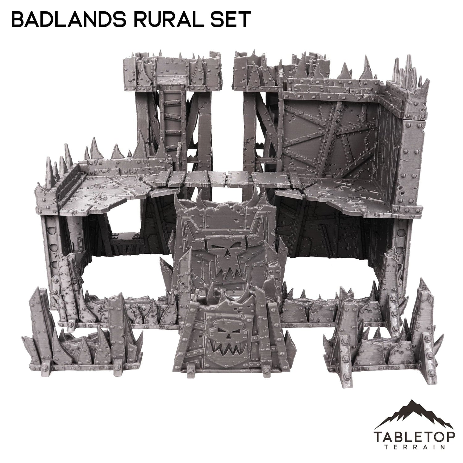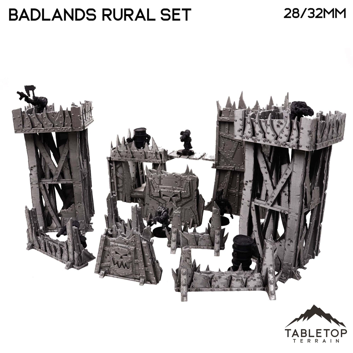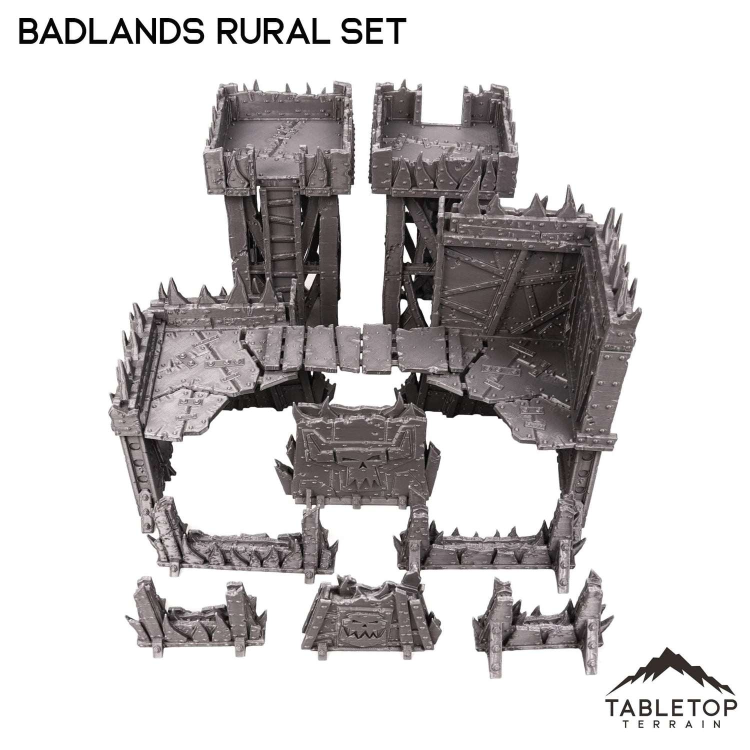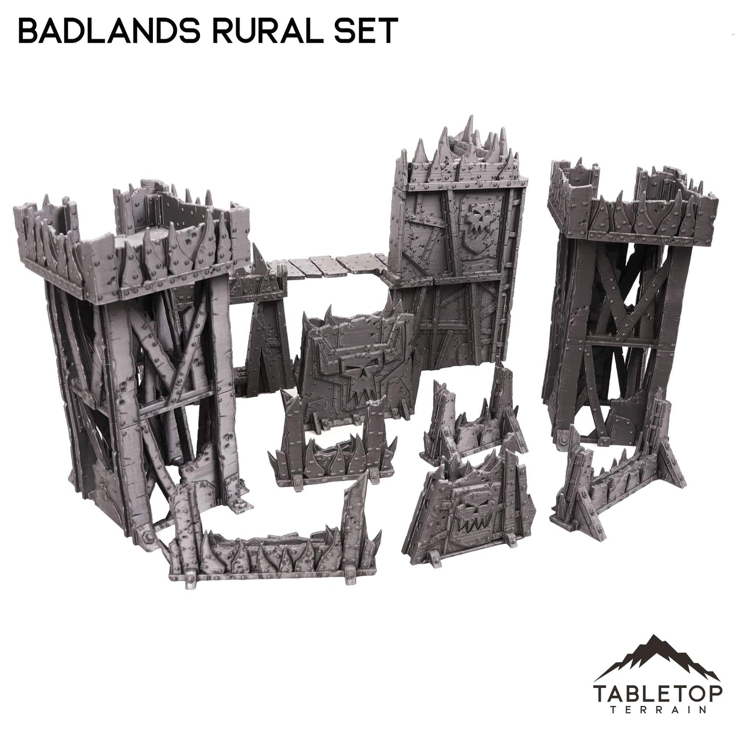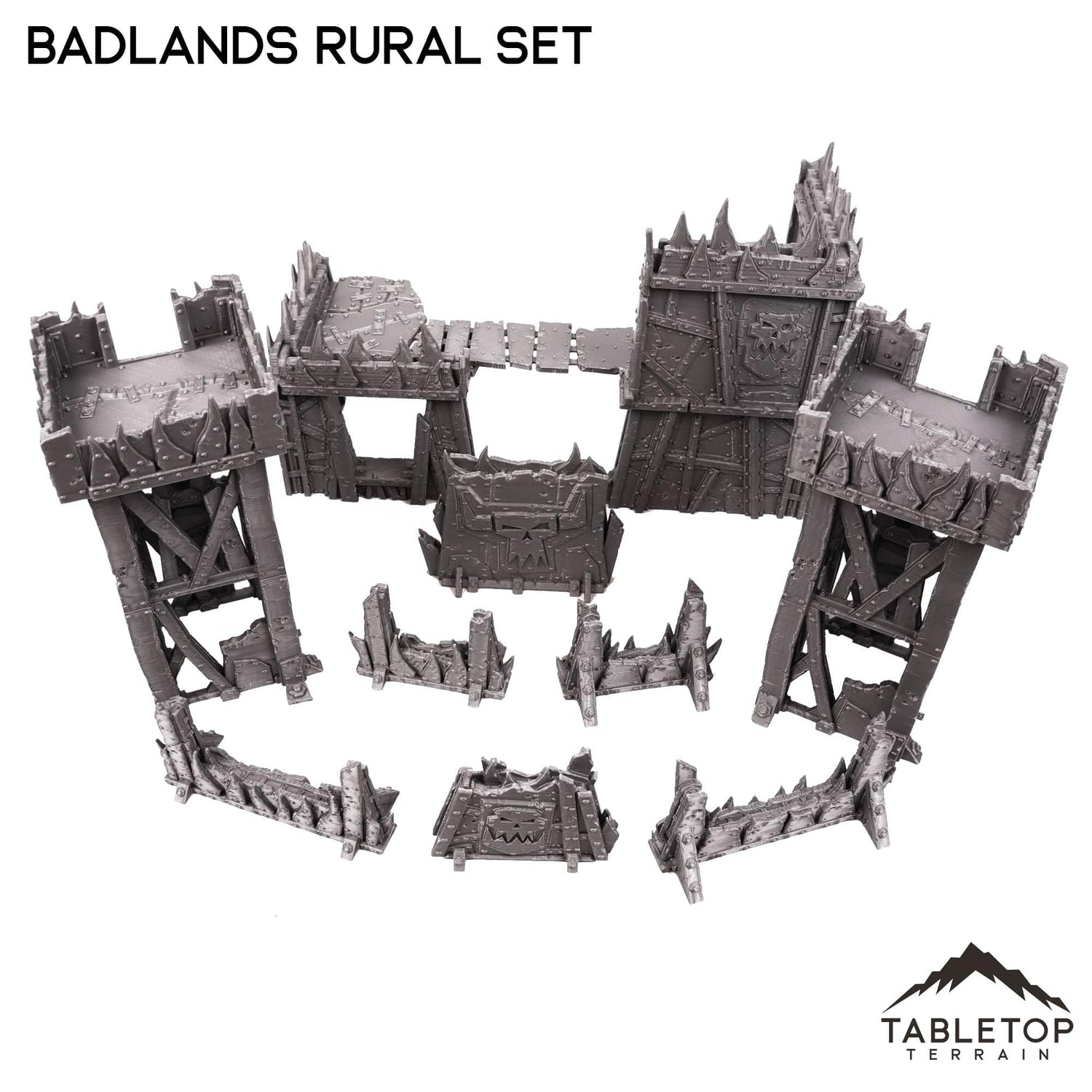 This set includes a multilevel badlands ruins complete with two towers and barricade walls, perfect for apocalyptic or sci fi tabletops. The crumbling walls enhance the sense of a battle-scarred landscape.