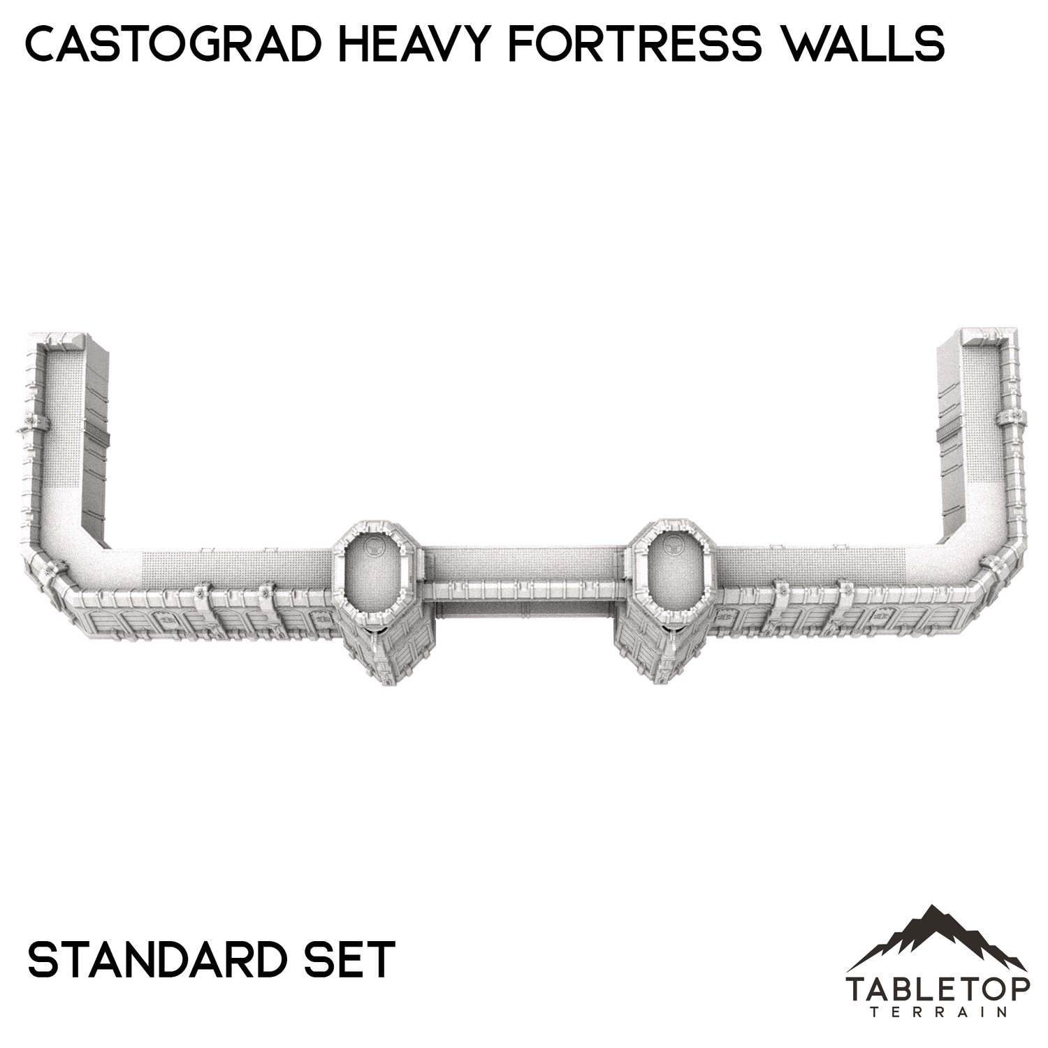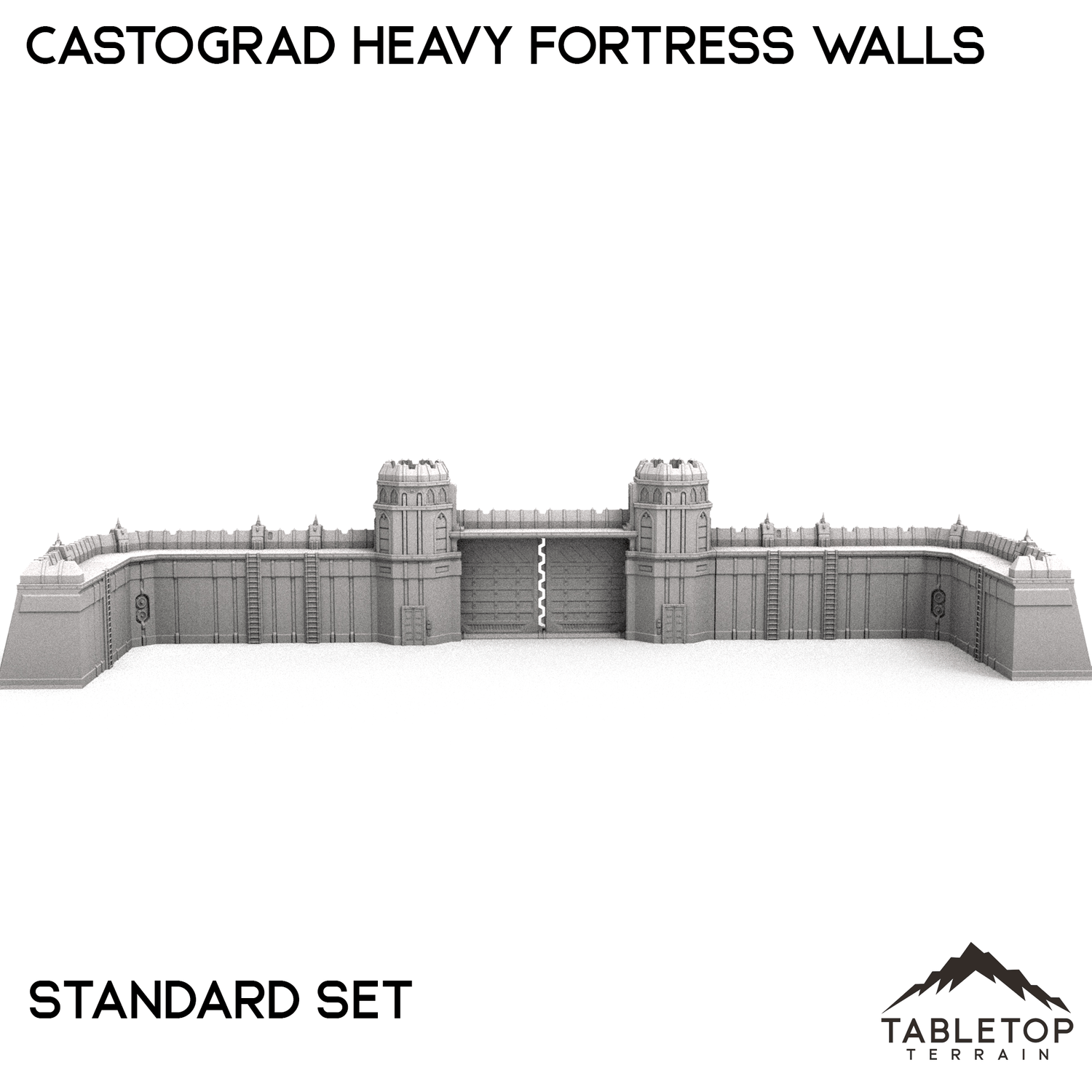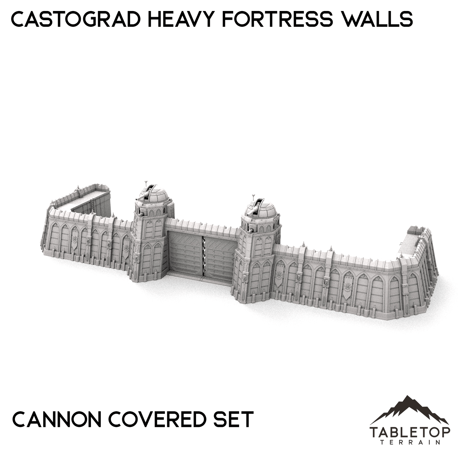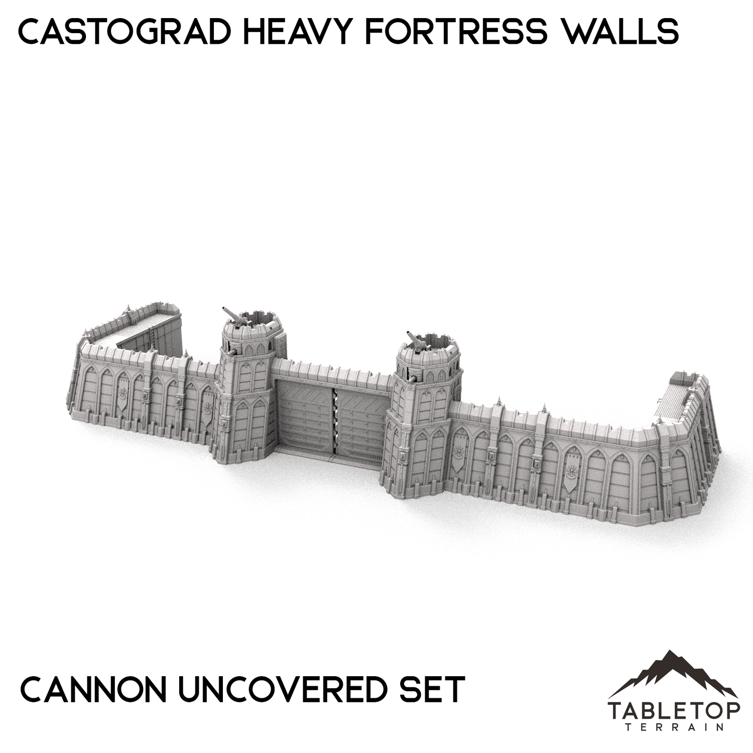 The Castograd Heavy Fortress Walls are a large, fully modular wall system. The walls, towers, and all pieces can be used in any configuration you'd like for whatever need you have. We sell each piece of the system separately, as well as 5 different bundles with specific layouts in mind. There is a Standard set, a Ruined set with destroyed walls, a Spire set with tall towers in the place of turrets, a Cannon Covered set that features a large, enclosed cannon, and a Cannon Uncovered set with a different style of mounted cannon above the gatehouse. The Castograd Heavy Fortress Walls set is designed for sci-fi wargames, but can be used with any system.