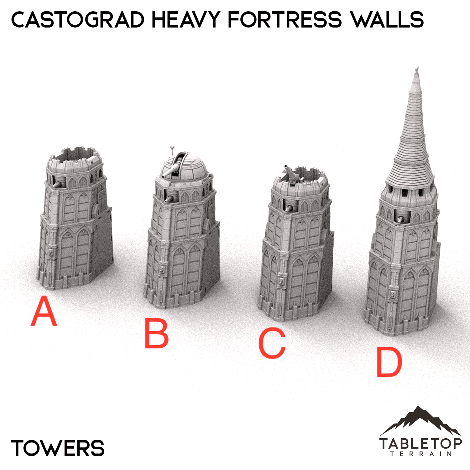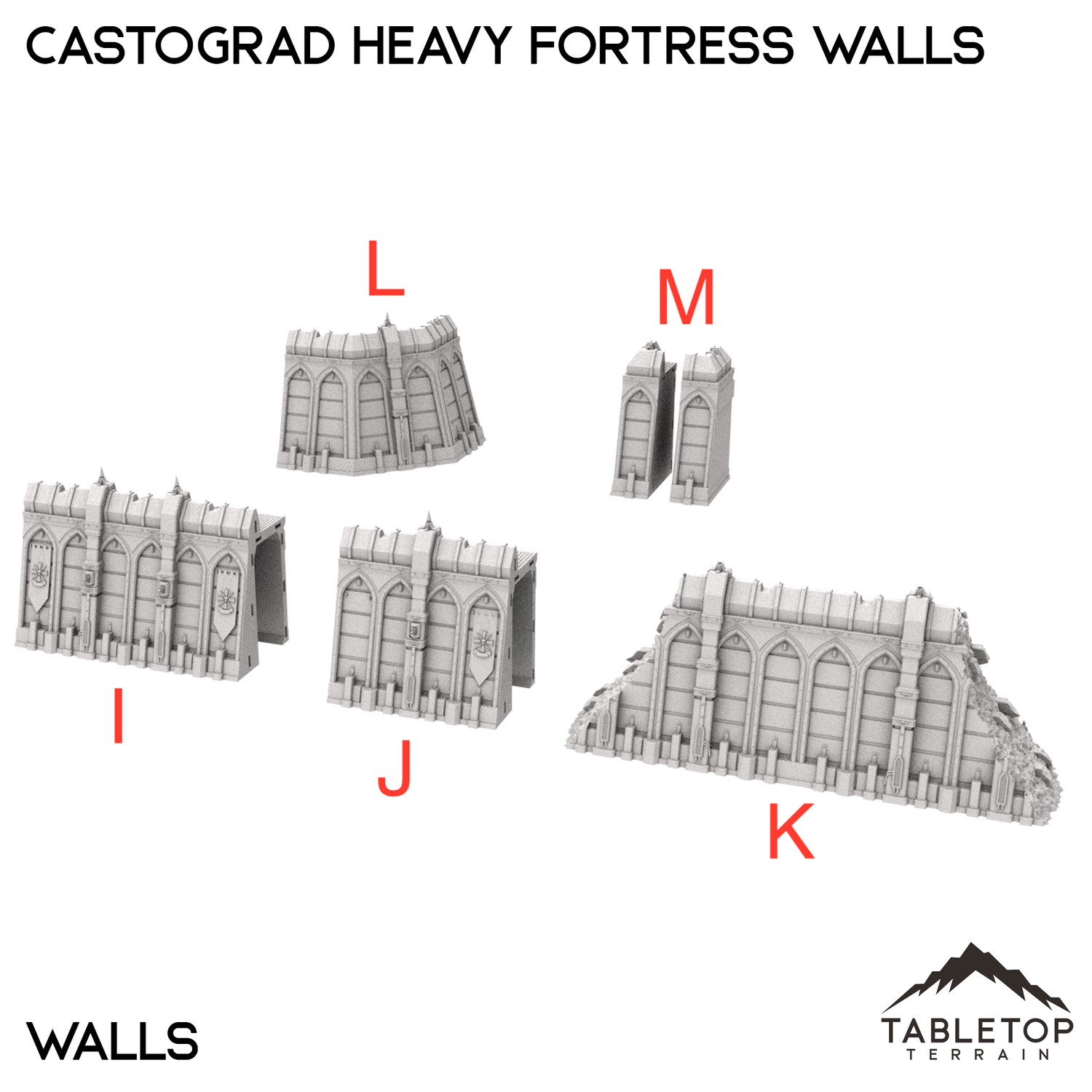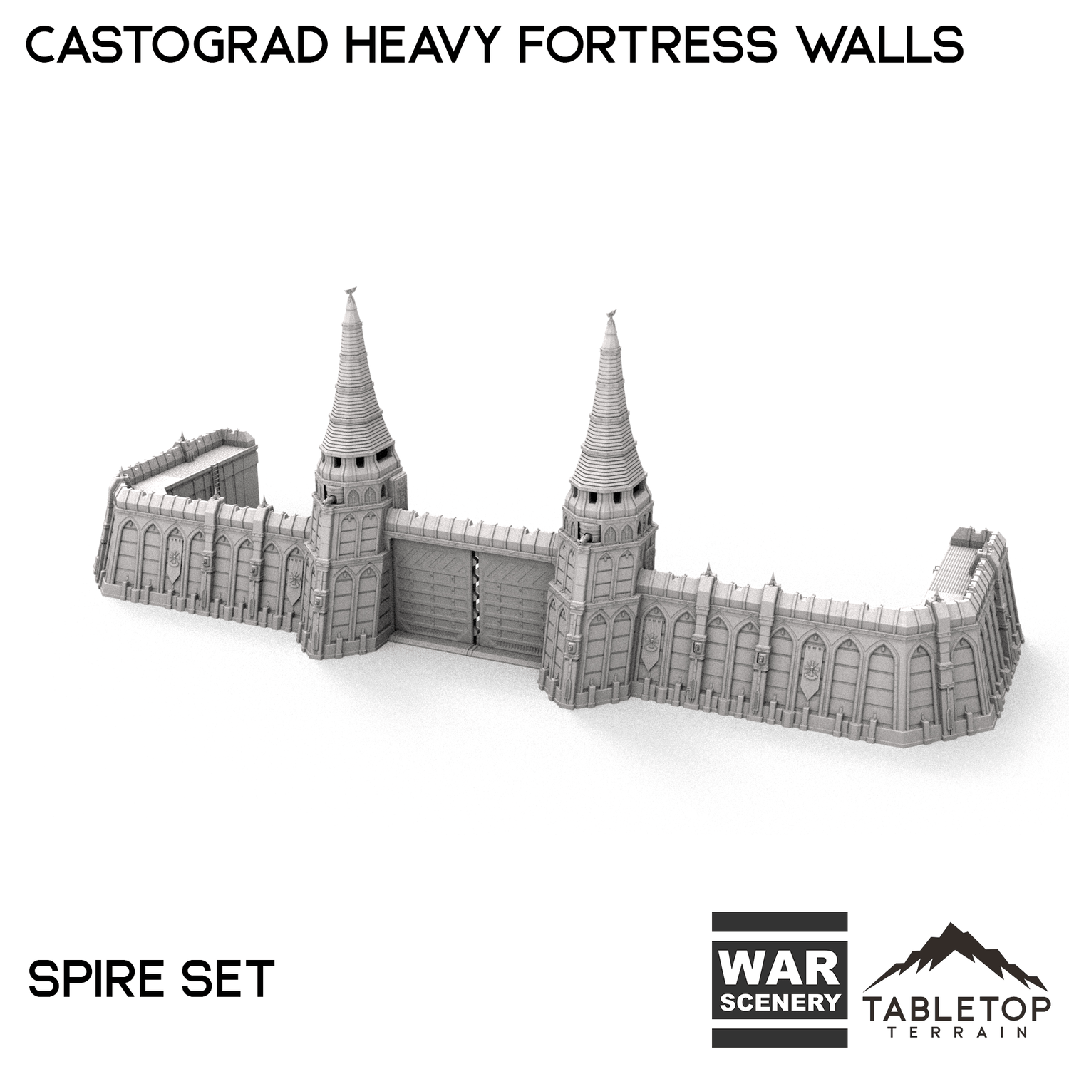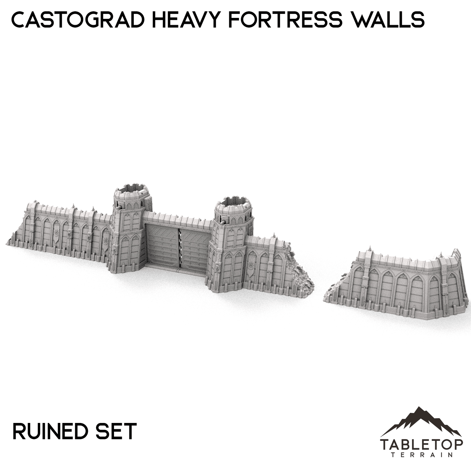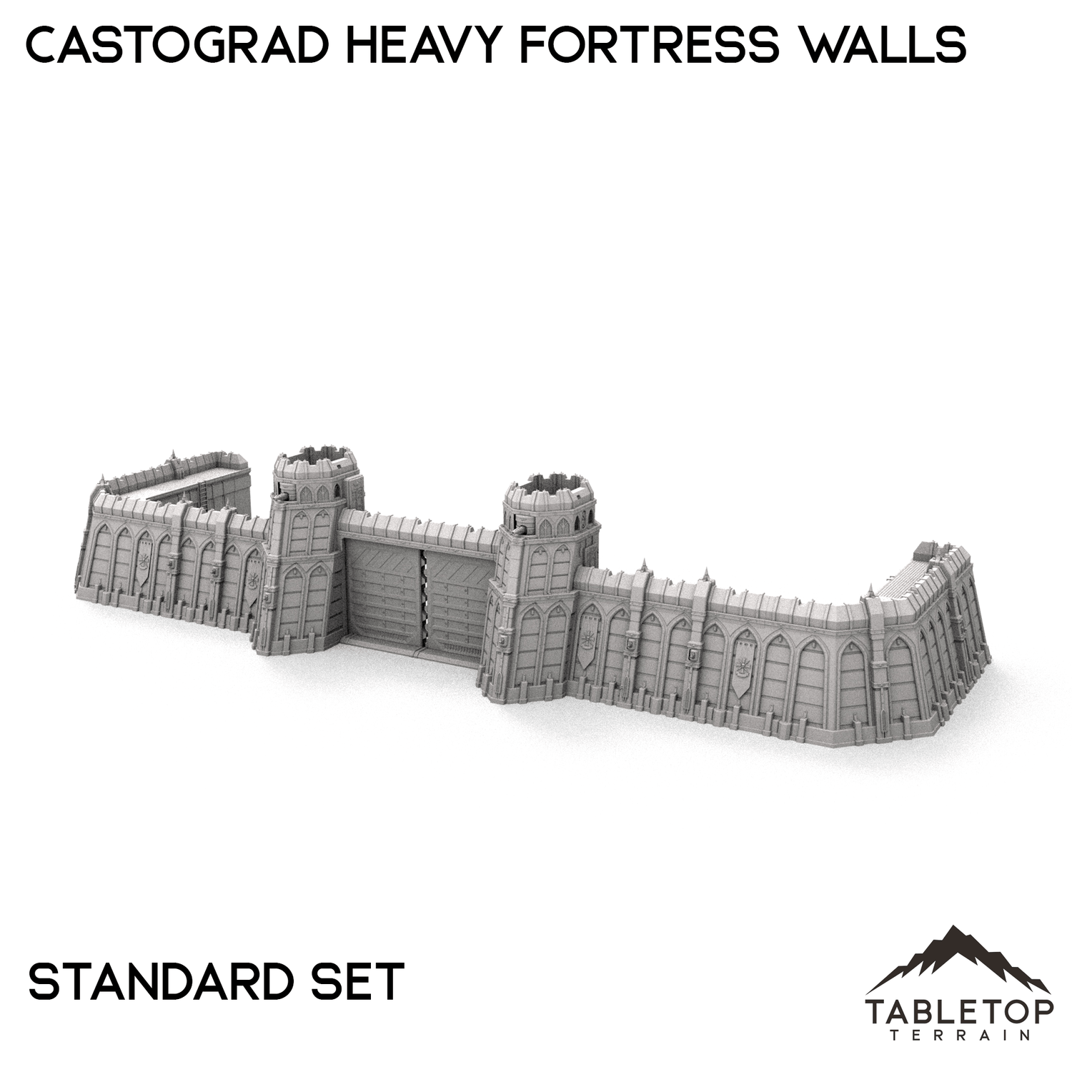 The Castograd Heavy Fortress Walls are a large, fully modular wall system. The walls, towers, and all pieces can be used in any configuration you'd like for whatever need you have. We sell each piece of the system separately, as well as 5 different bundles with specific layouts in mind. There is a Standard set, a Ruined set with destroyed walls, a Spire set with tall towers in the place of turrets, a Cannon Covered set that features a large, enclosed cannon, and a Cannon Uncovered set with a different style of mounted cannon above the gatehouse. The Castograd Heavy Fortress Walls set is designed for sci-fi wargames, but can be used with any system.