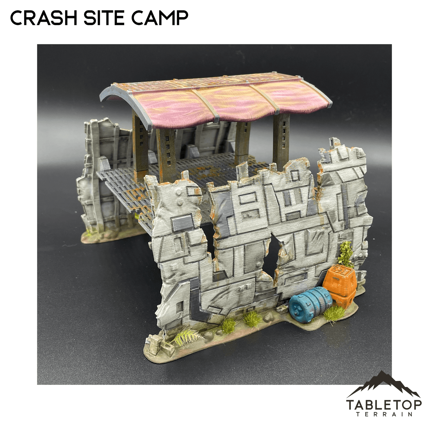 The Crash Site Camp gives you several options to create a base of operations for your fighting forces on your wargaming table or RPG session. This design allows for line-of-sight blocking terrain, cover, unique angles, and a thematic centerpiece for your next adventure.
