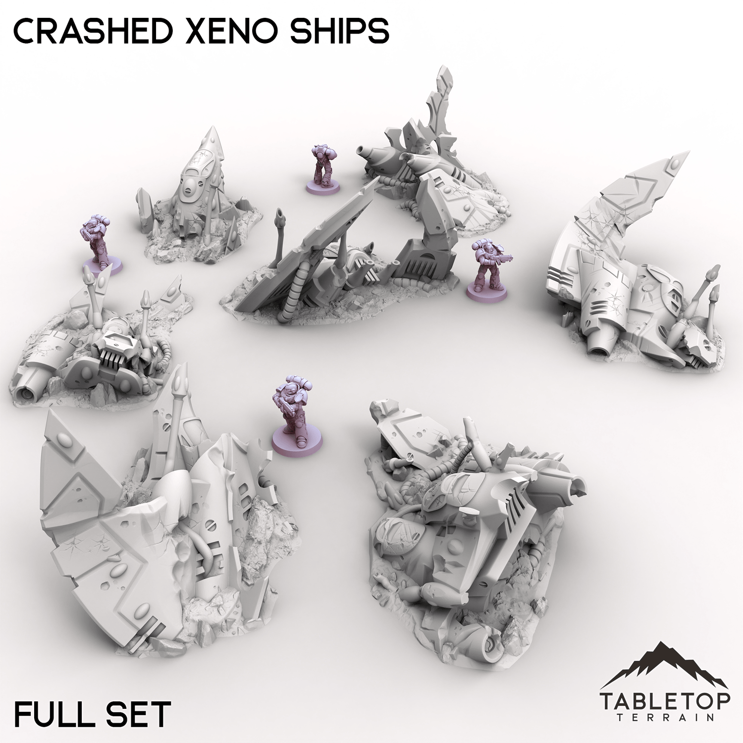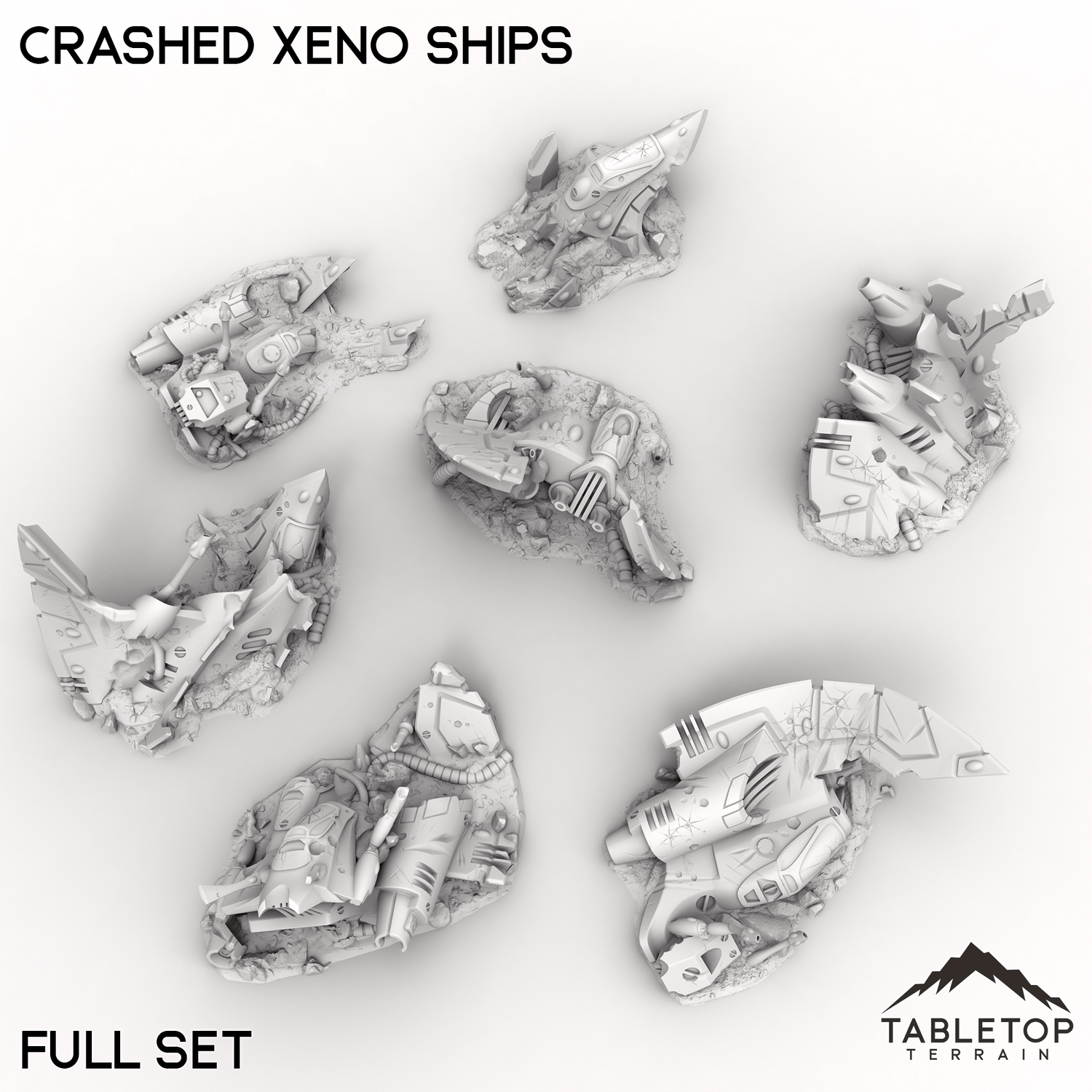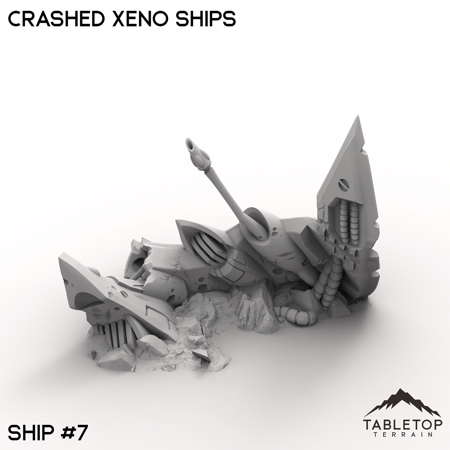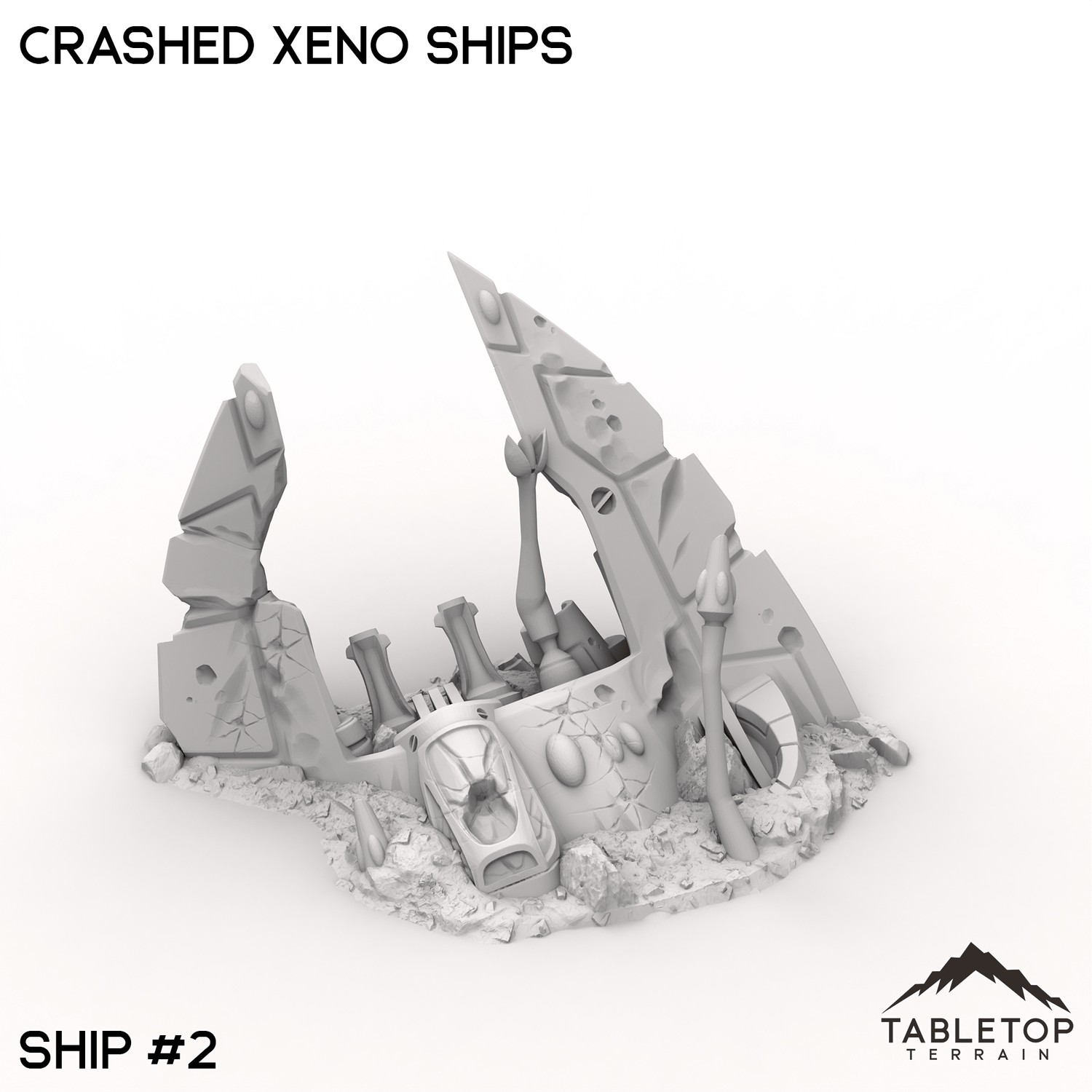 The Crashed Xenos Ships lie half-buried in the sand, their twisted metal hulls battered by a violent descent. Jagged fractures and ruptured plating expose the alien vessel’s mysterious inner workings, now entangled with the desert’s relentless grasp. Buy each piece individually or the whole set at a discount!