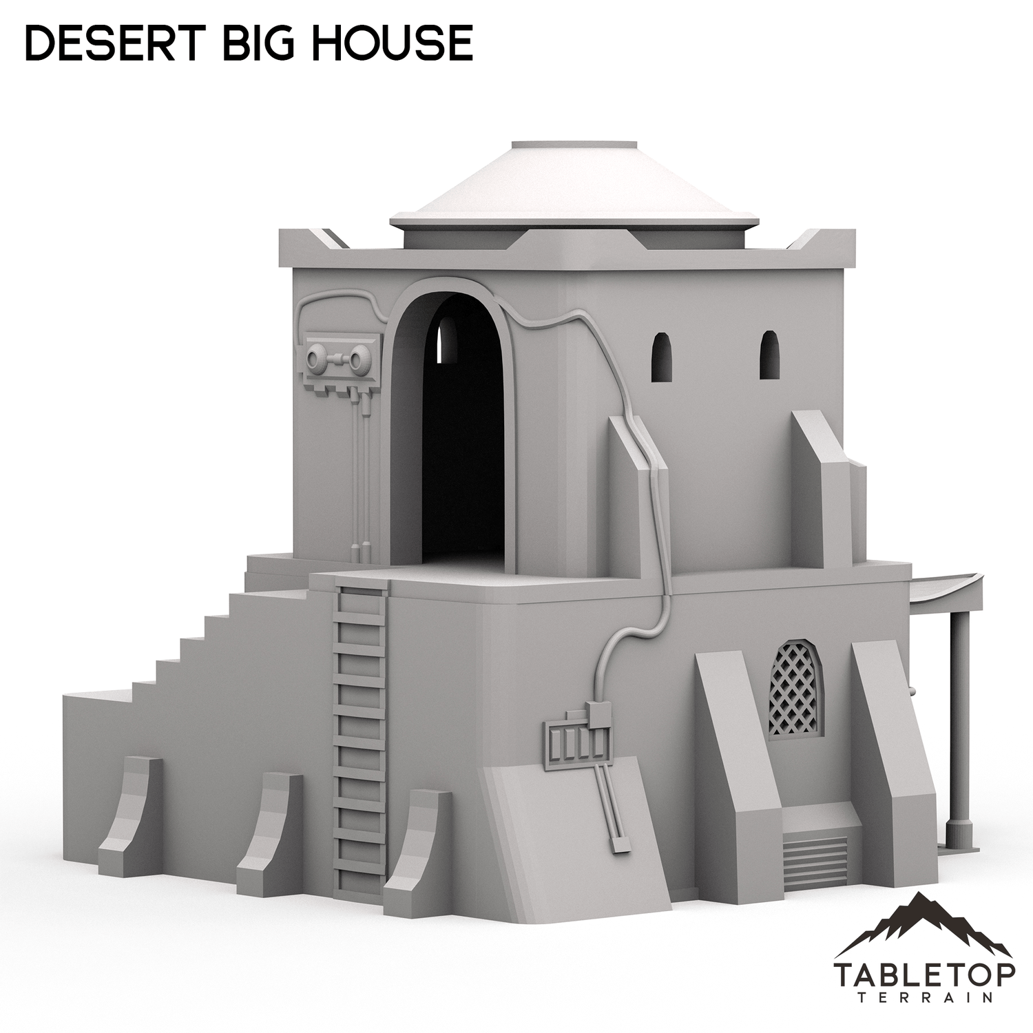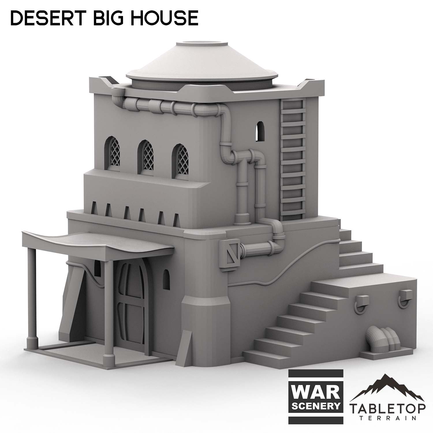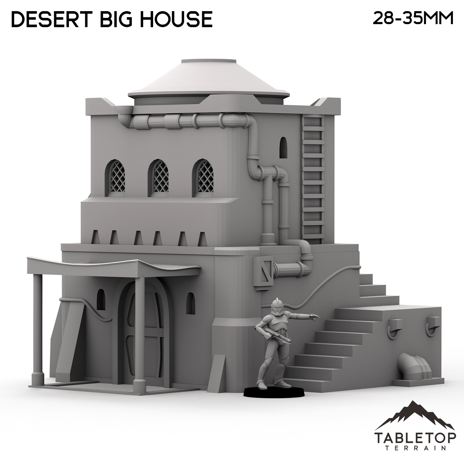 The Desert Big House is a two story building with exterior stairs and awning. The size is perfect for creating variety in a townscape, or holding a larger number of units inside. The house is printed in 40mm, 28-35mm (1:47), 20mm, and 15mm scale. We recommend the 40mm scale for Shatterpoint and the 28-35mm (1:47) scale for Legion.