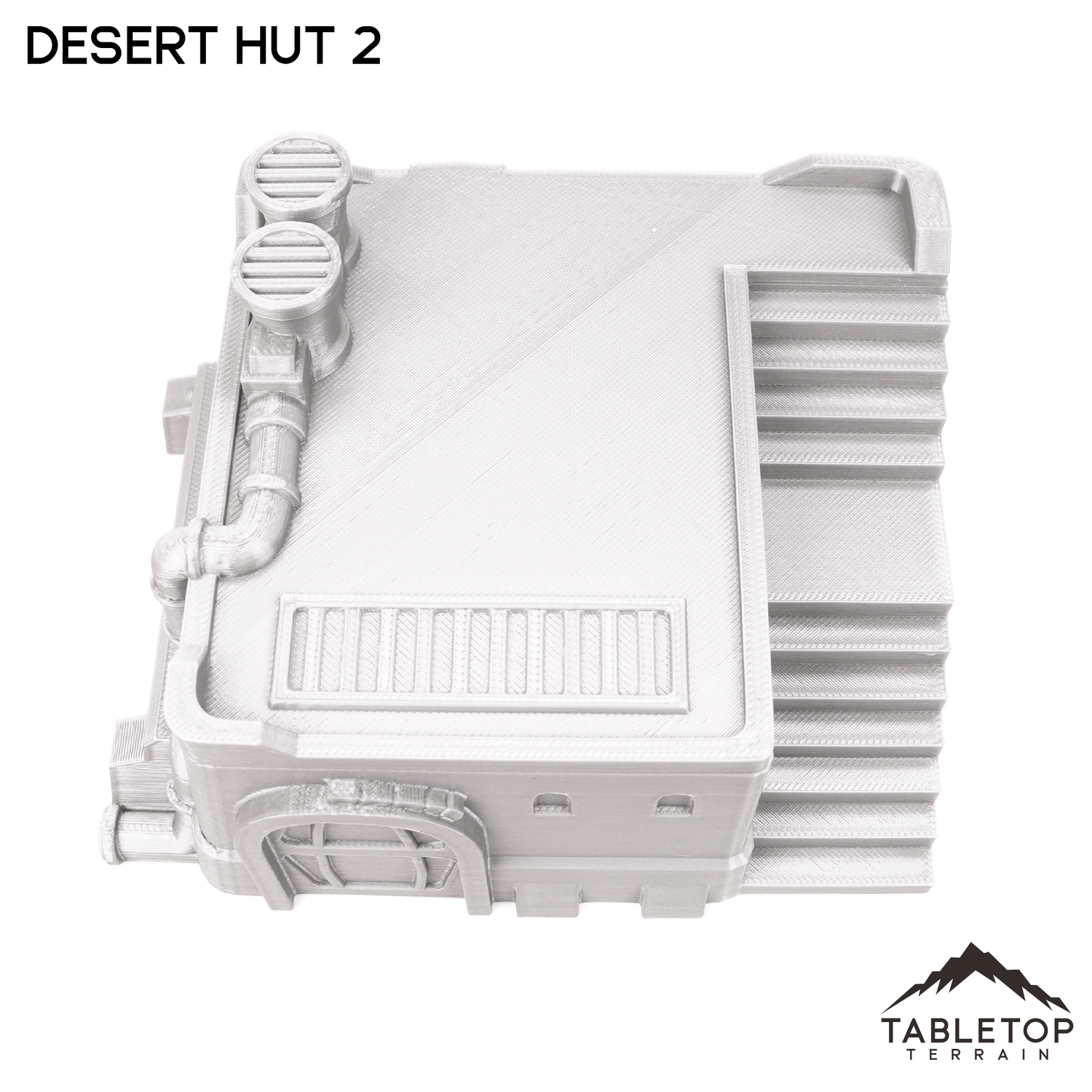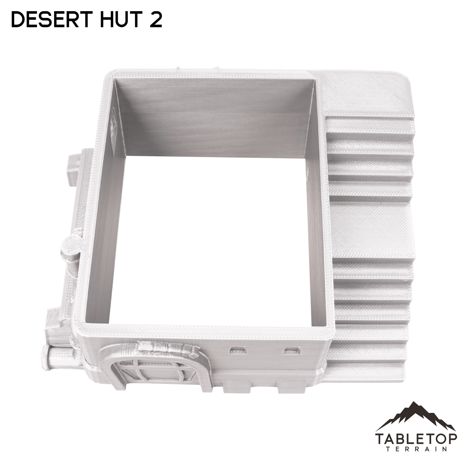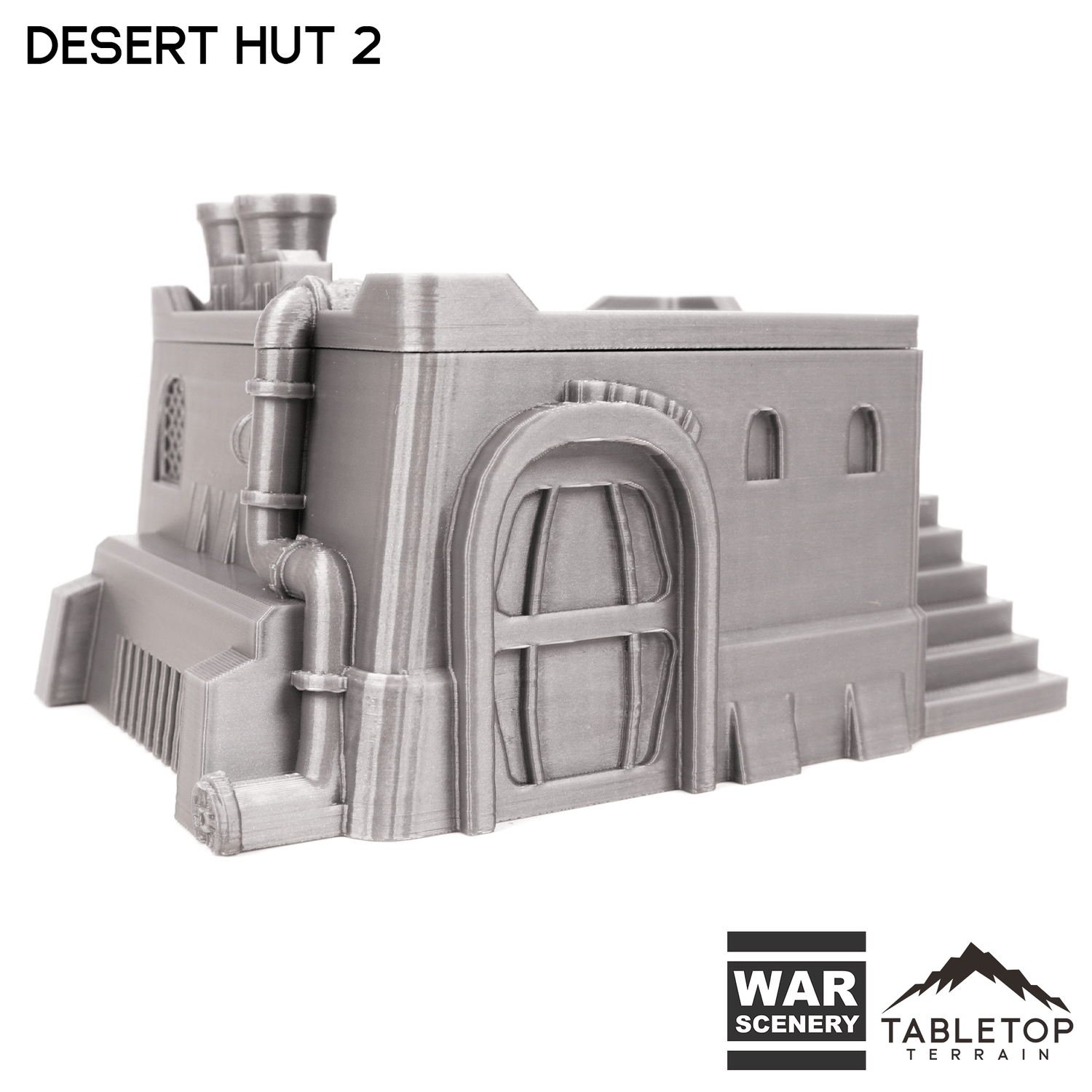 The Desert Hut 2 has an exterior staircase leading to the rooftop. These smaller buildings are a fantastic way to mix and match different houses and shops for your cityscape or town, adding a lived-in feel to the table's setup. The Hut is printed in 40mm, 28-35mm (1:47), 20mm, and 15mm scale. We recommend the 40mm scale for Shatterpoint and the 28-35mm (1:47) scale for Legion.