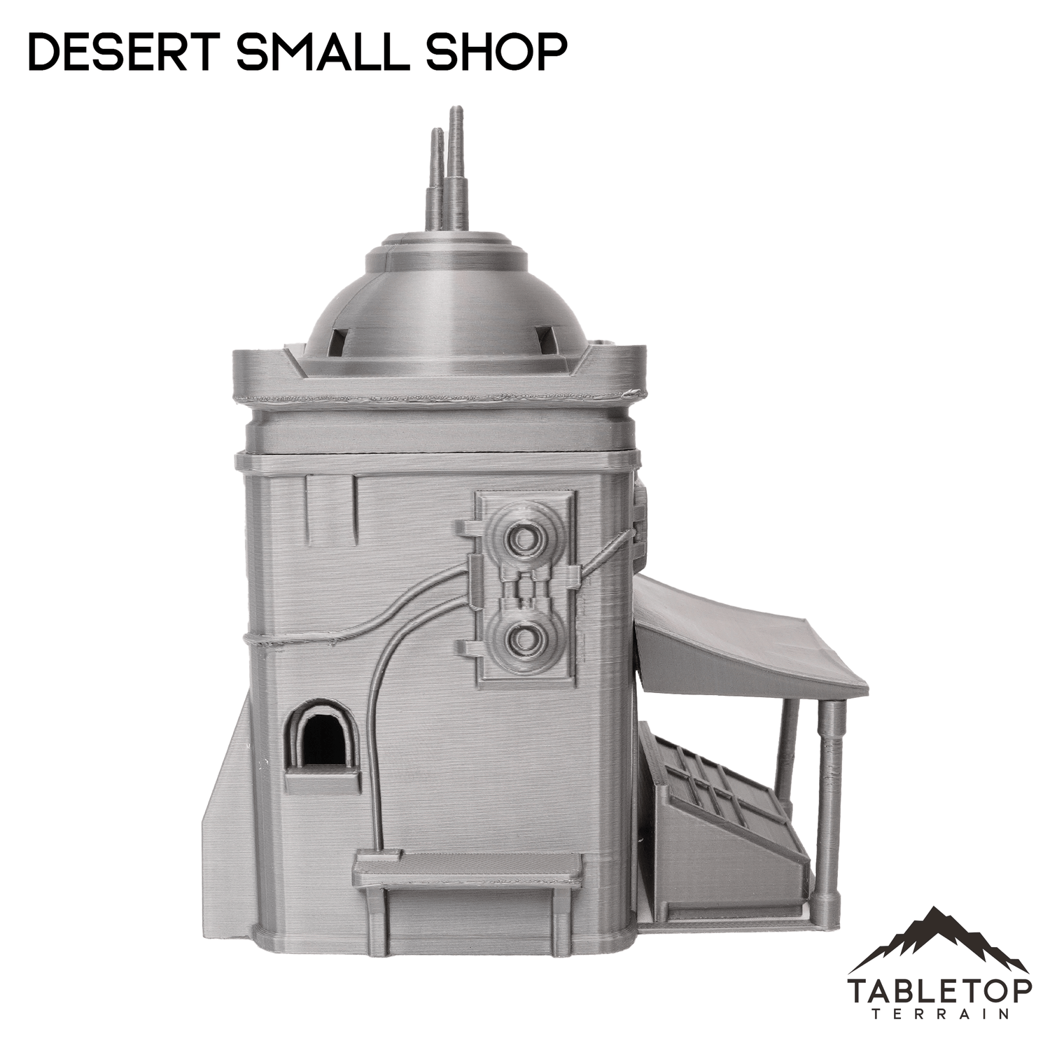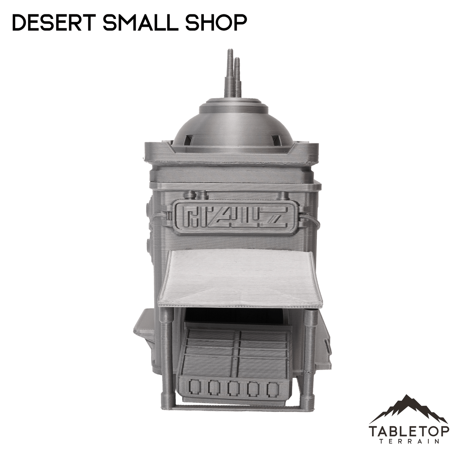 The Desert Small Shop is a building with an attached merchant tent. The Shop is printed in 40mm, 28-35mm (1:47), 20mm, and 15mm scale. We recommend the 40mm scale for Shatterpoint and the 28-35mm (1:47) scale for Legion.