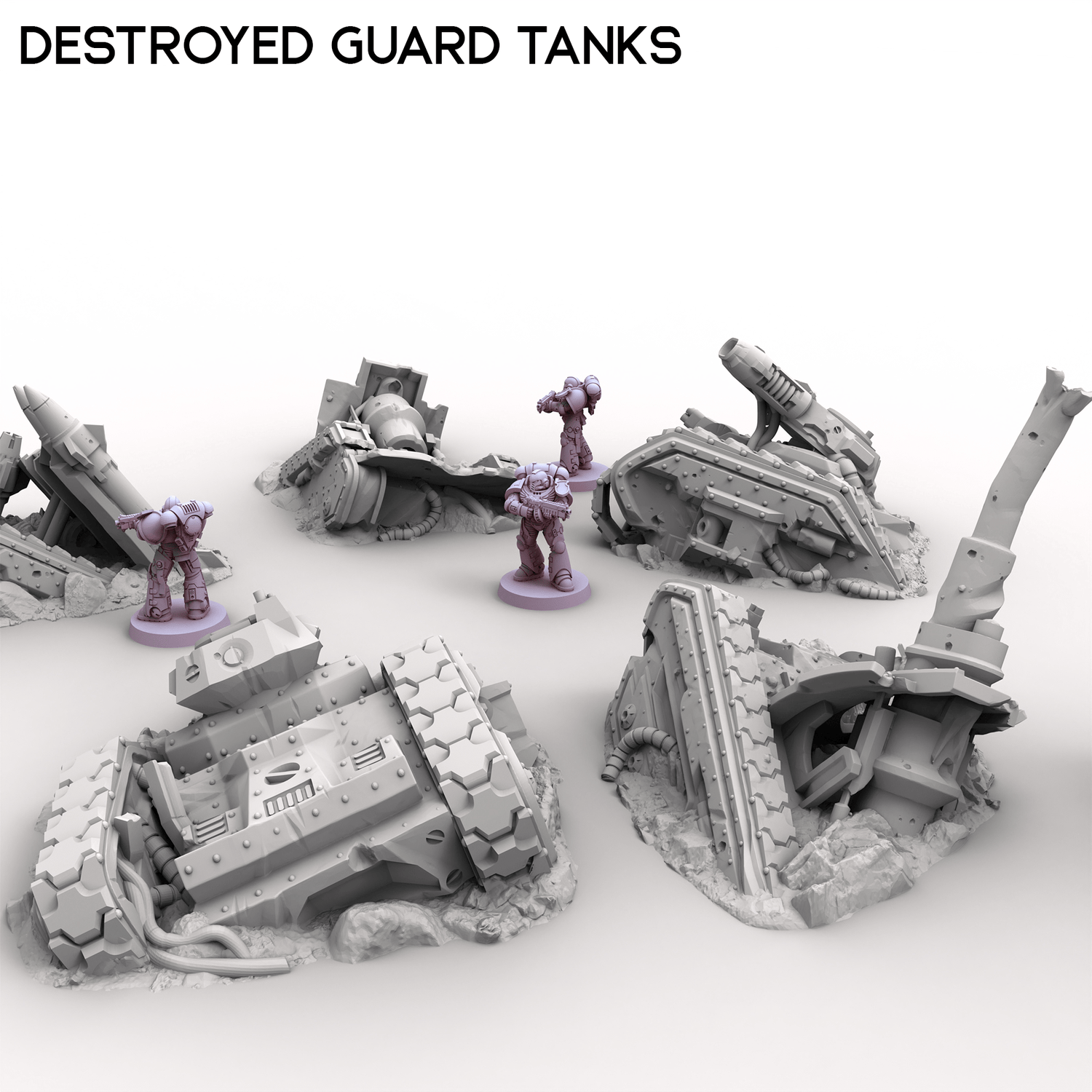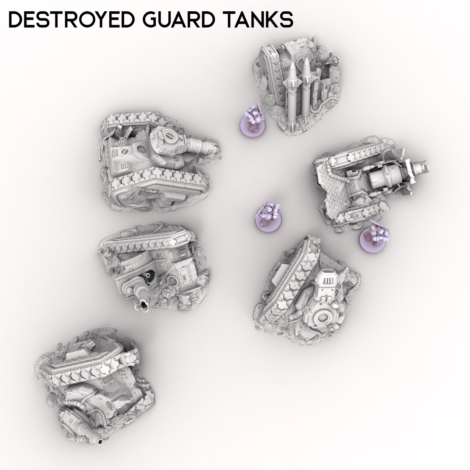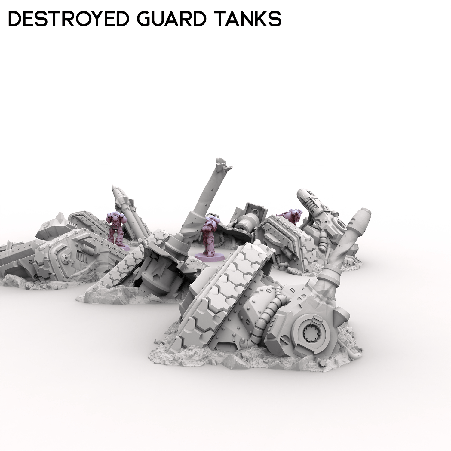 The Destroyed Guard Tanks set brings battlefield carnage to life with hulking wrecks of armored vehicles left smoldering in the dirt. Twisted treads, blown-out hulls, and bent barrels make these pieces perfect for cover, objectives, or storytelling elements in war-torn environments.
