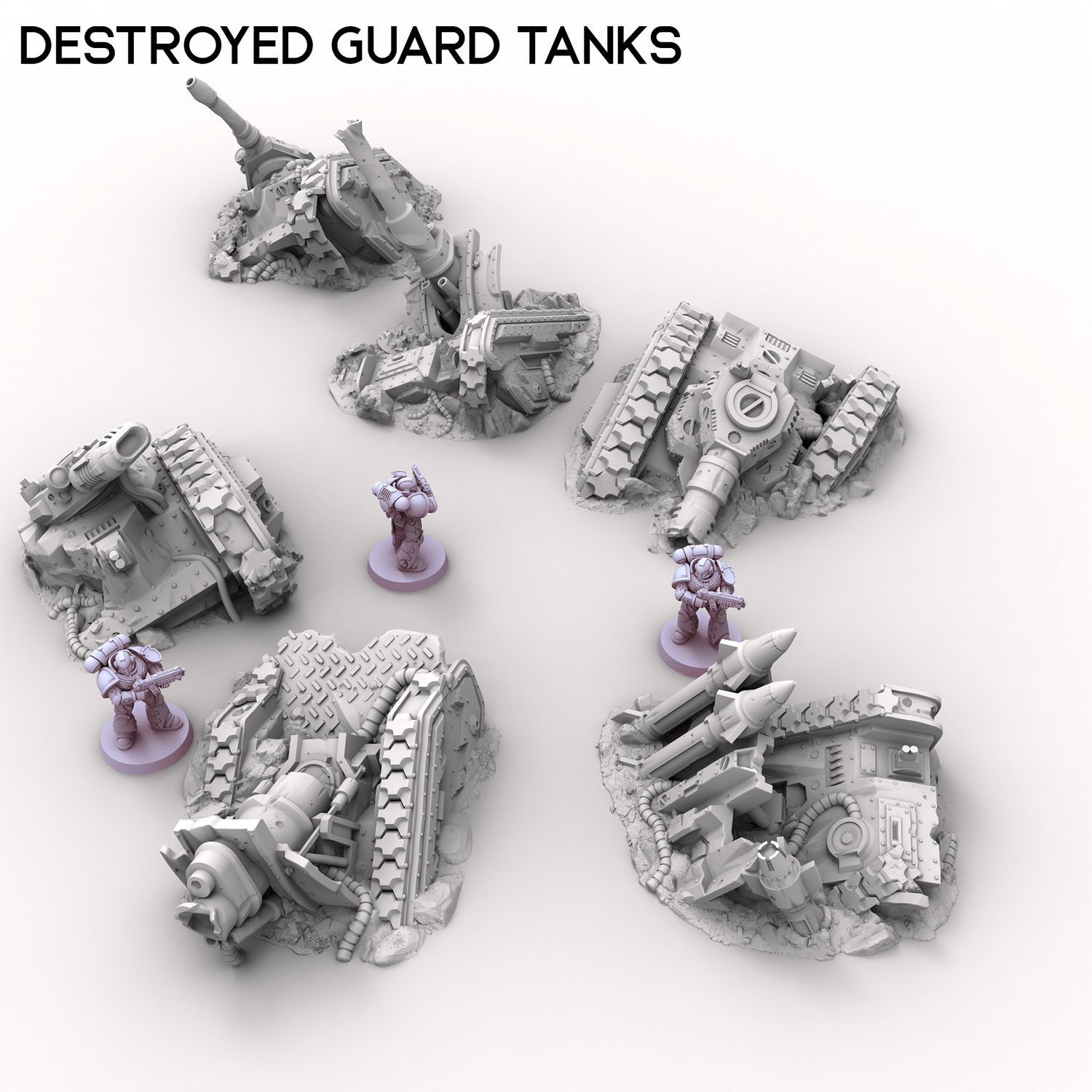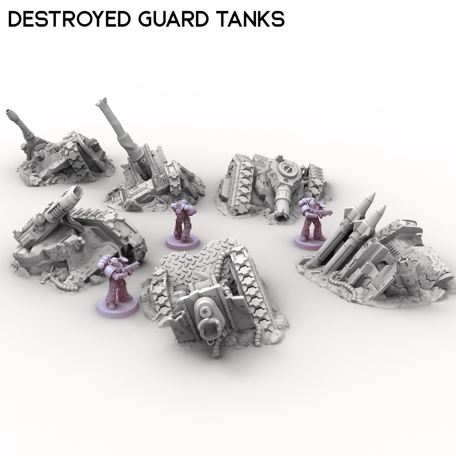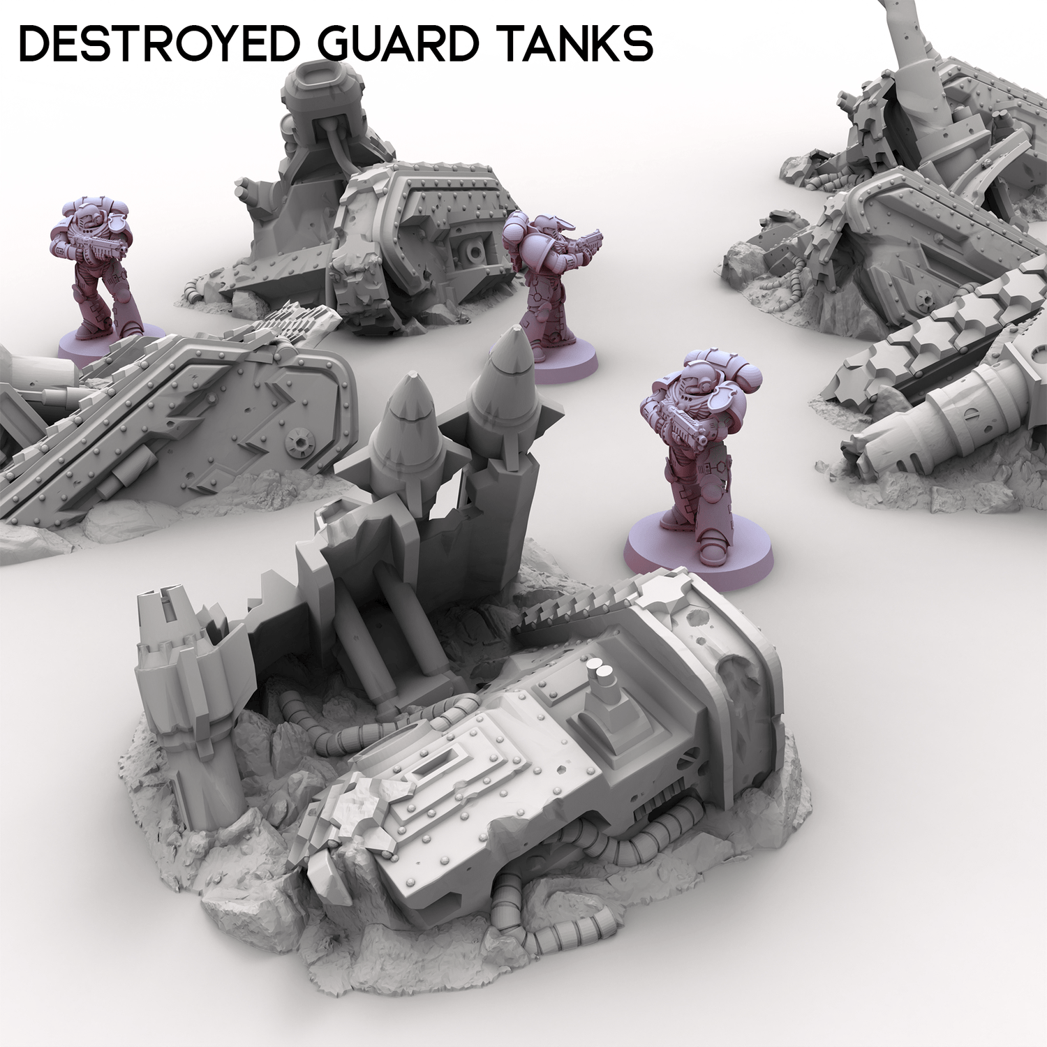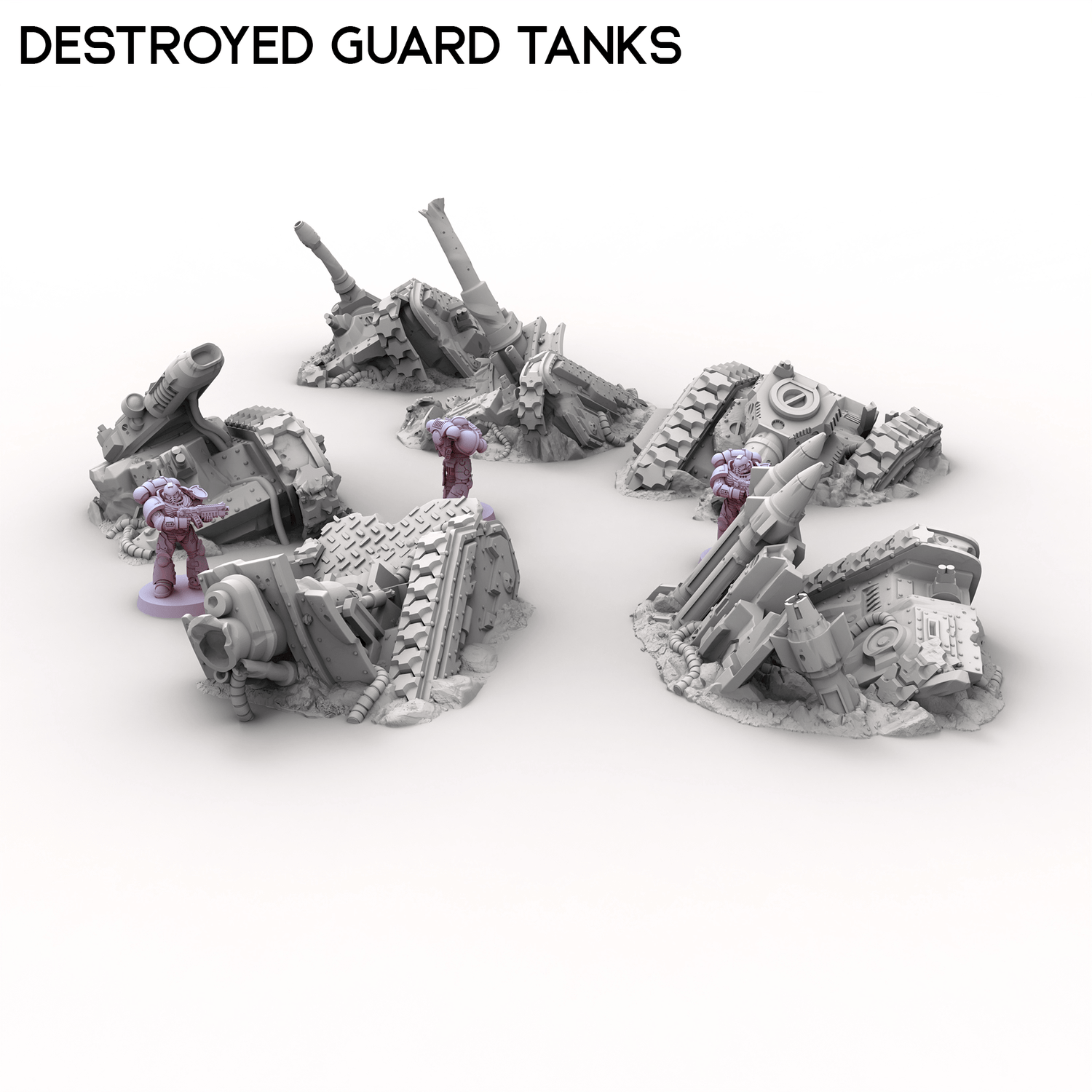 The Destroyed Guard Tanks set brings battlefield carnage to life with hulking wrecks of armored vehicles left smoldering in the dirt. Twisted treads, blown-out hulls, and bent barrels make these pieces perfect for cover, objectives, or storytelling elements in war-torn environments.