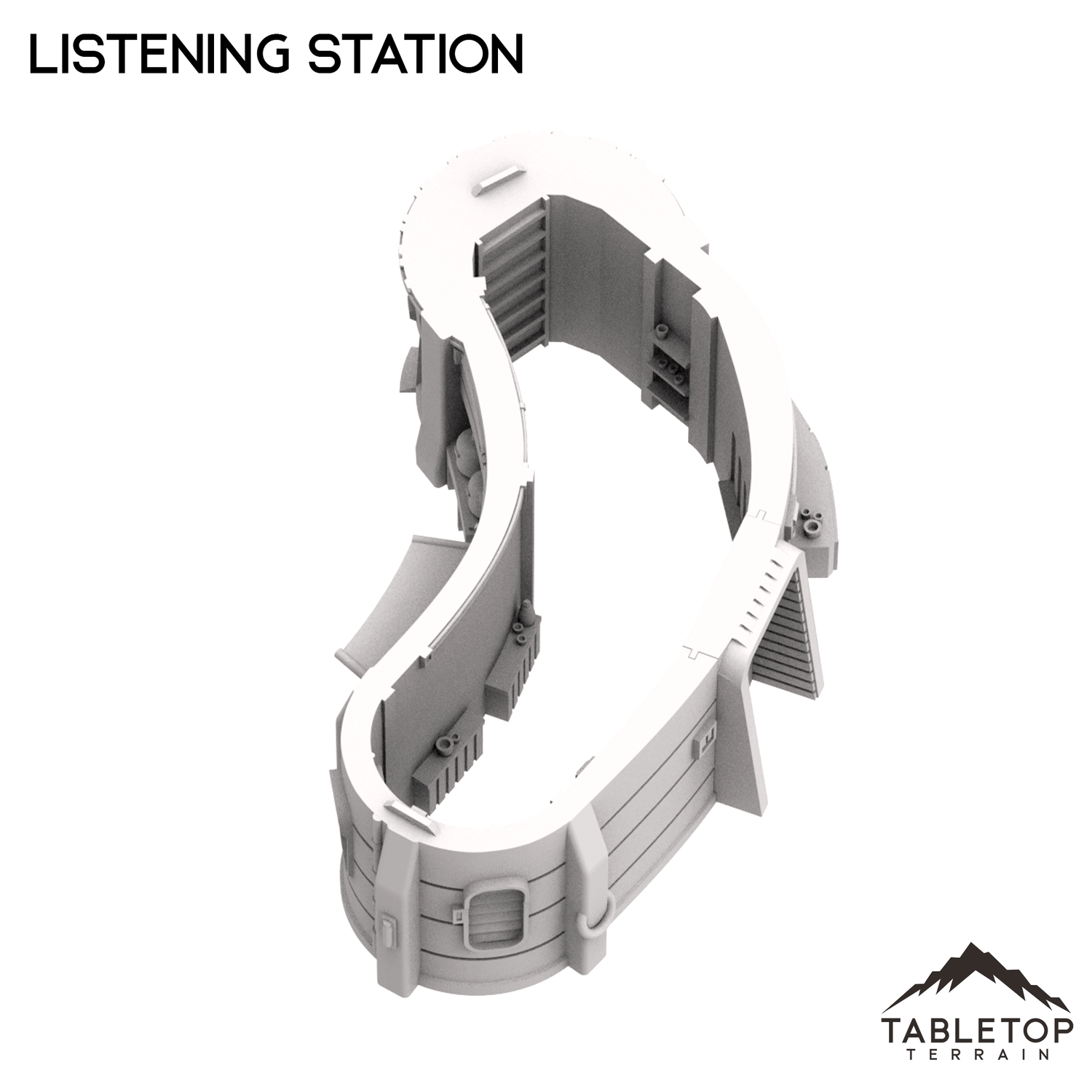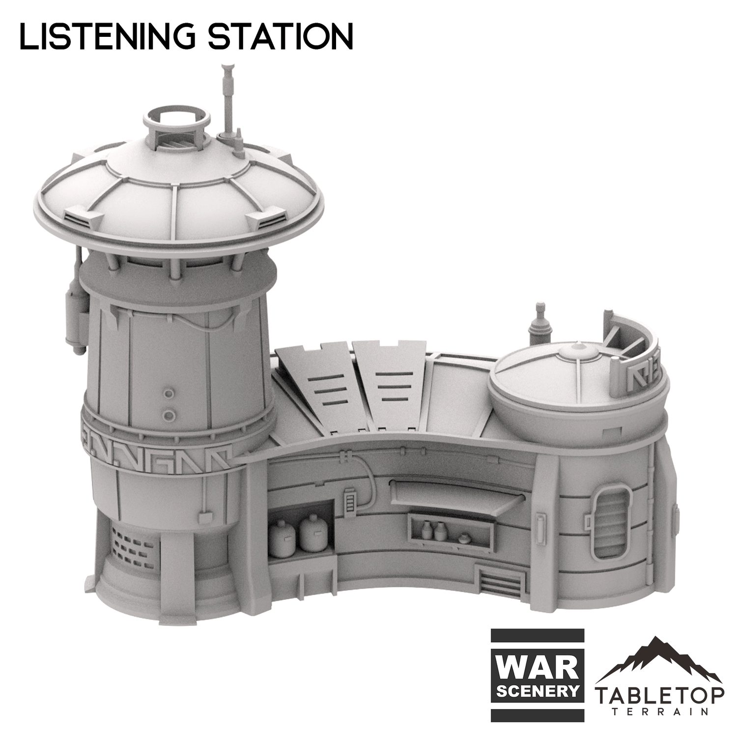 The Listening Station tabletop set is a curved structure with a tall radio tower on one side. The station can fill a variety of functions in a tabletop setup, such as surveillance, comm traffic, radio broadcast, or even act as a part of a larger setup when combined with other buildings. The Listening Station is printed in 40mm, 28-35mm (1:47), 20mm, and 15mm scale. We recommend the 40mm scale for Shatterpoint and the 28-35mm (1:47) scale for Legion.
