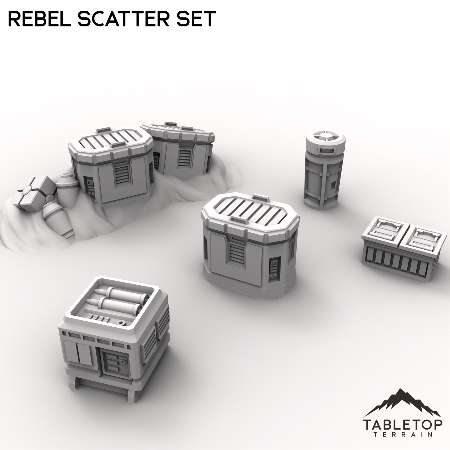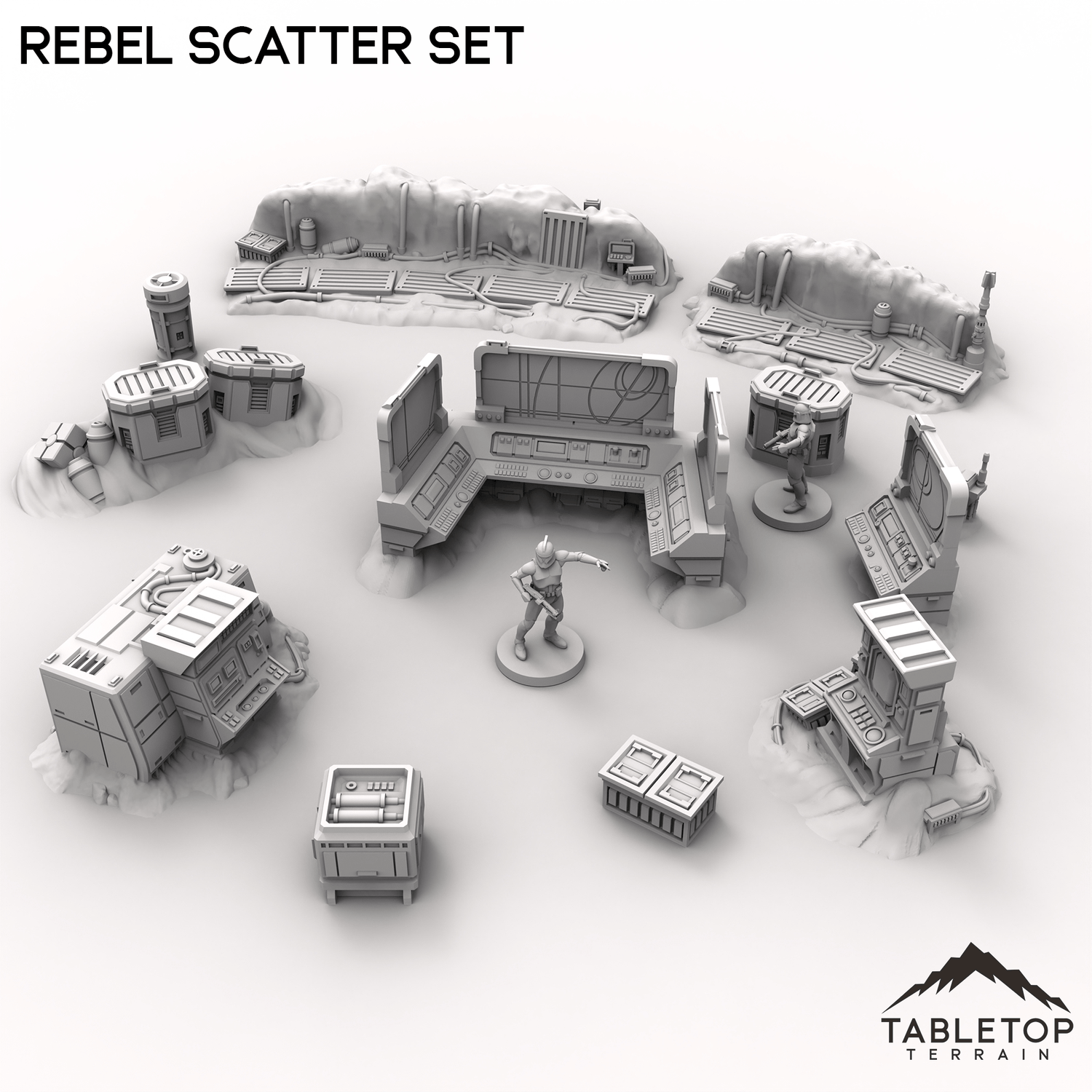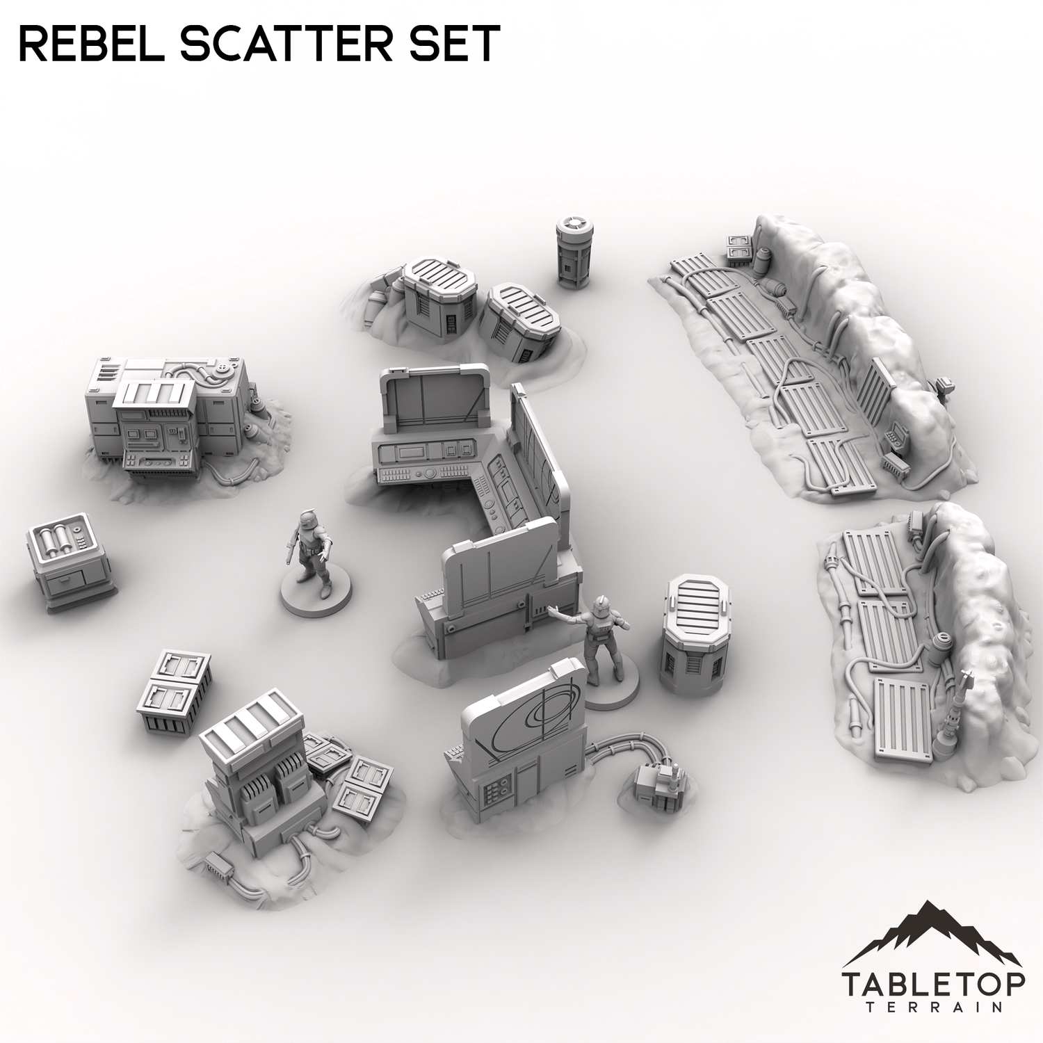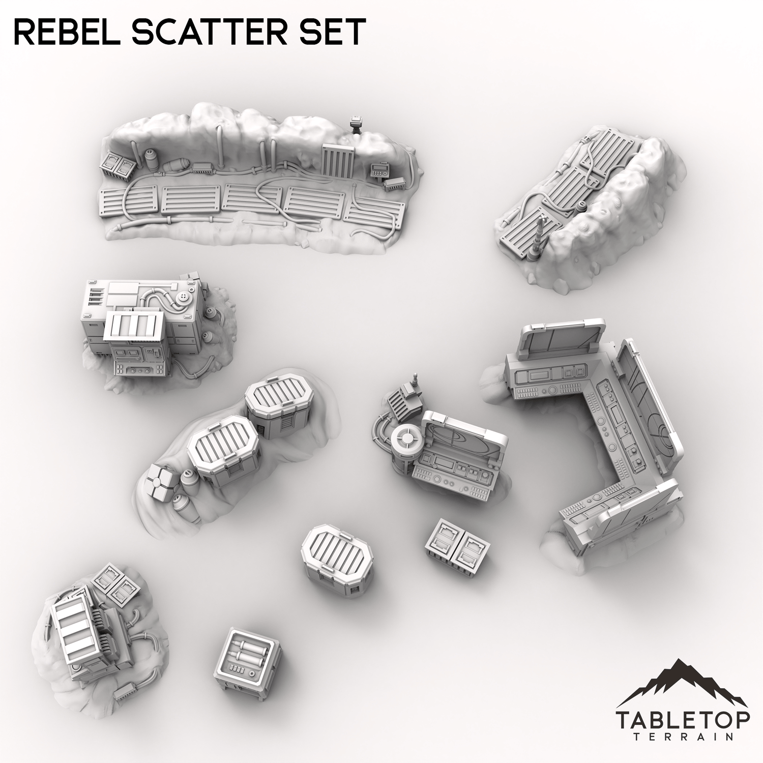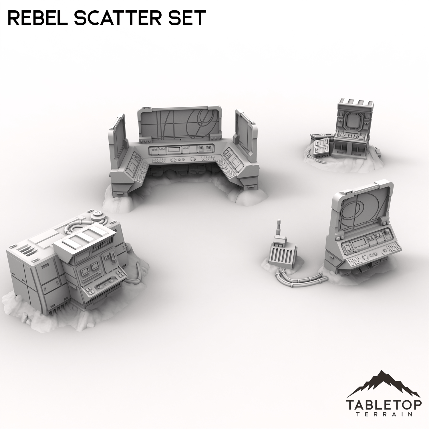 This Rebel Scatter Set is a collection of tables, chests, computers, and 2 trenches. The items are all highly detailed, matching the ionic look of the rebel's frozen base beneath the snow. The scatter is perfect for any sci-fi or cyberpunk tabletop.