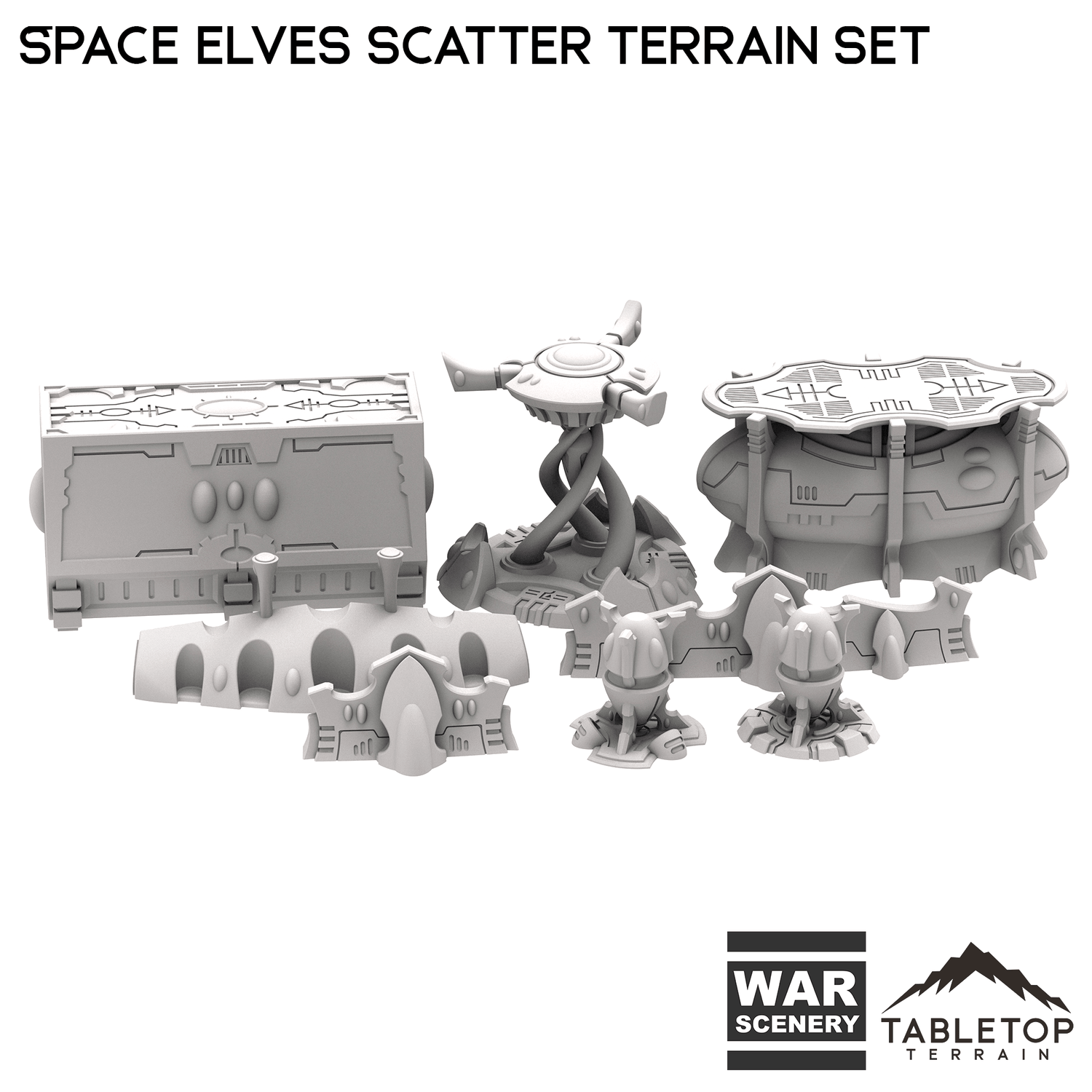 The scatter set is a mix of smaller items perfect for adding around a battle map. They can be used to add life to the map, making for a more detailed and interesting terrain set. The scatter is all stylized with Space Elves look and feel to match and Space Elves army's buildings and units.