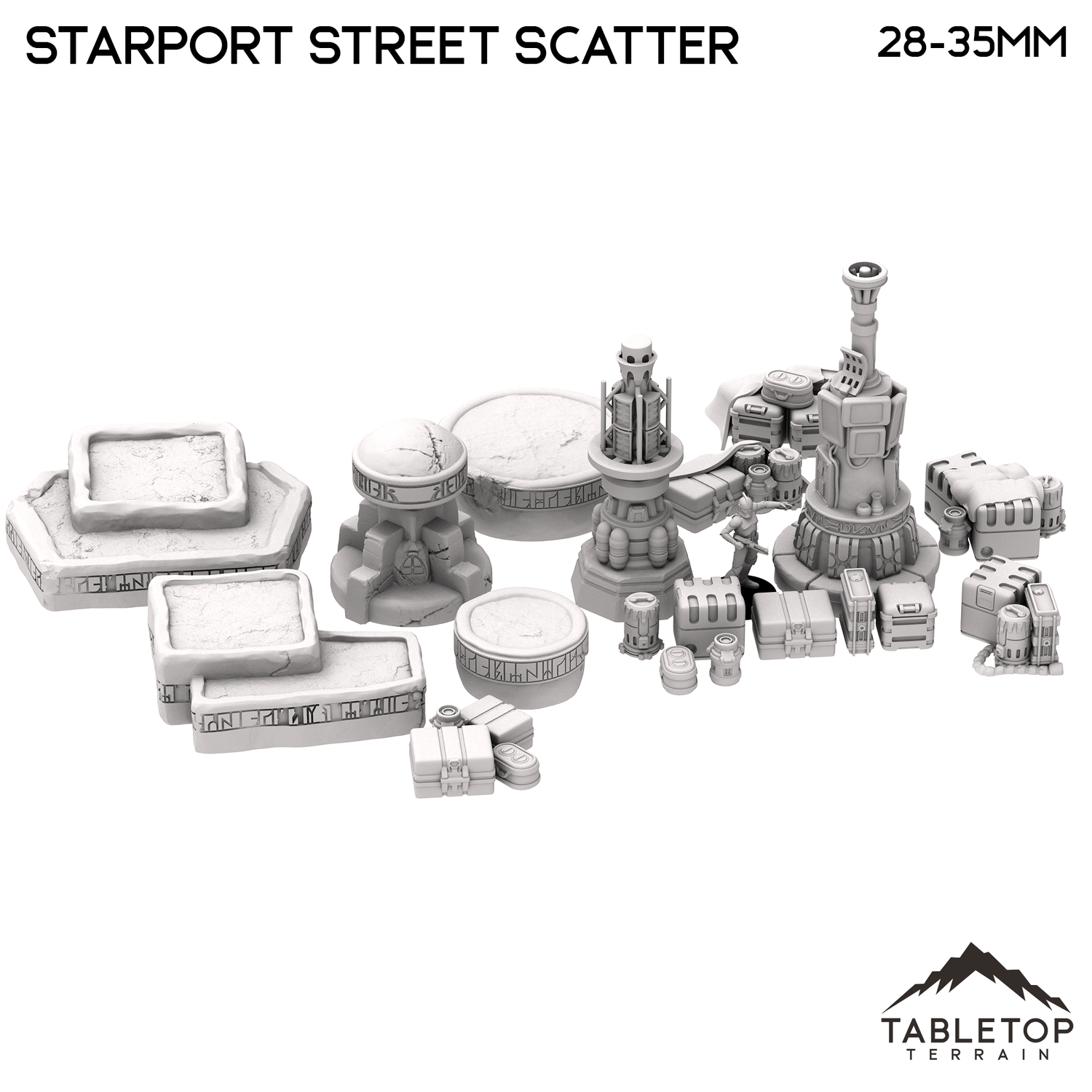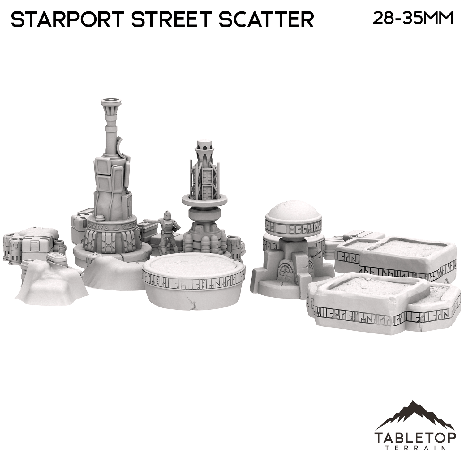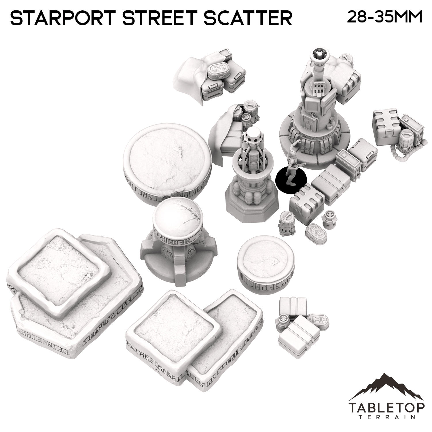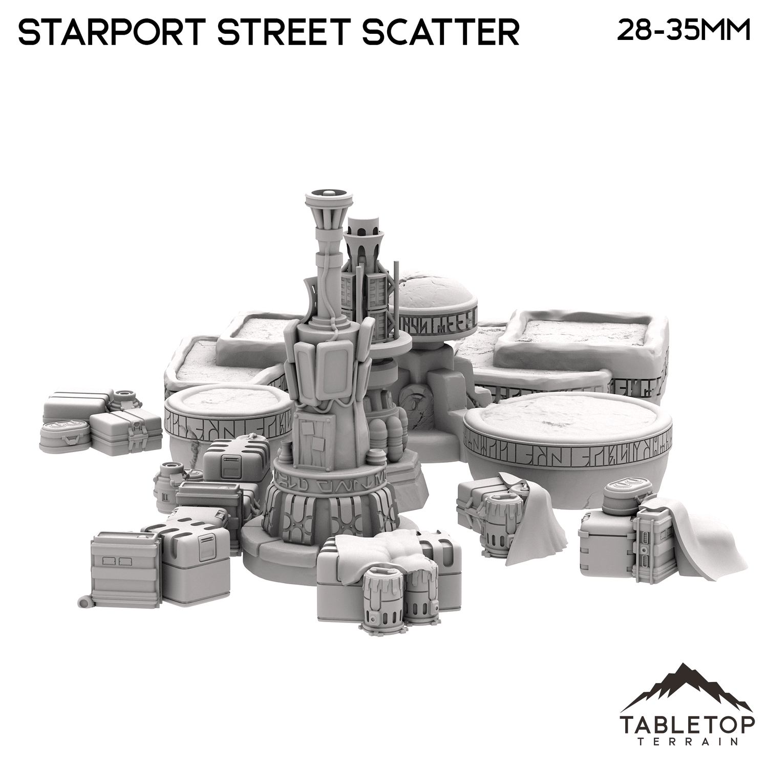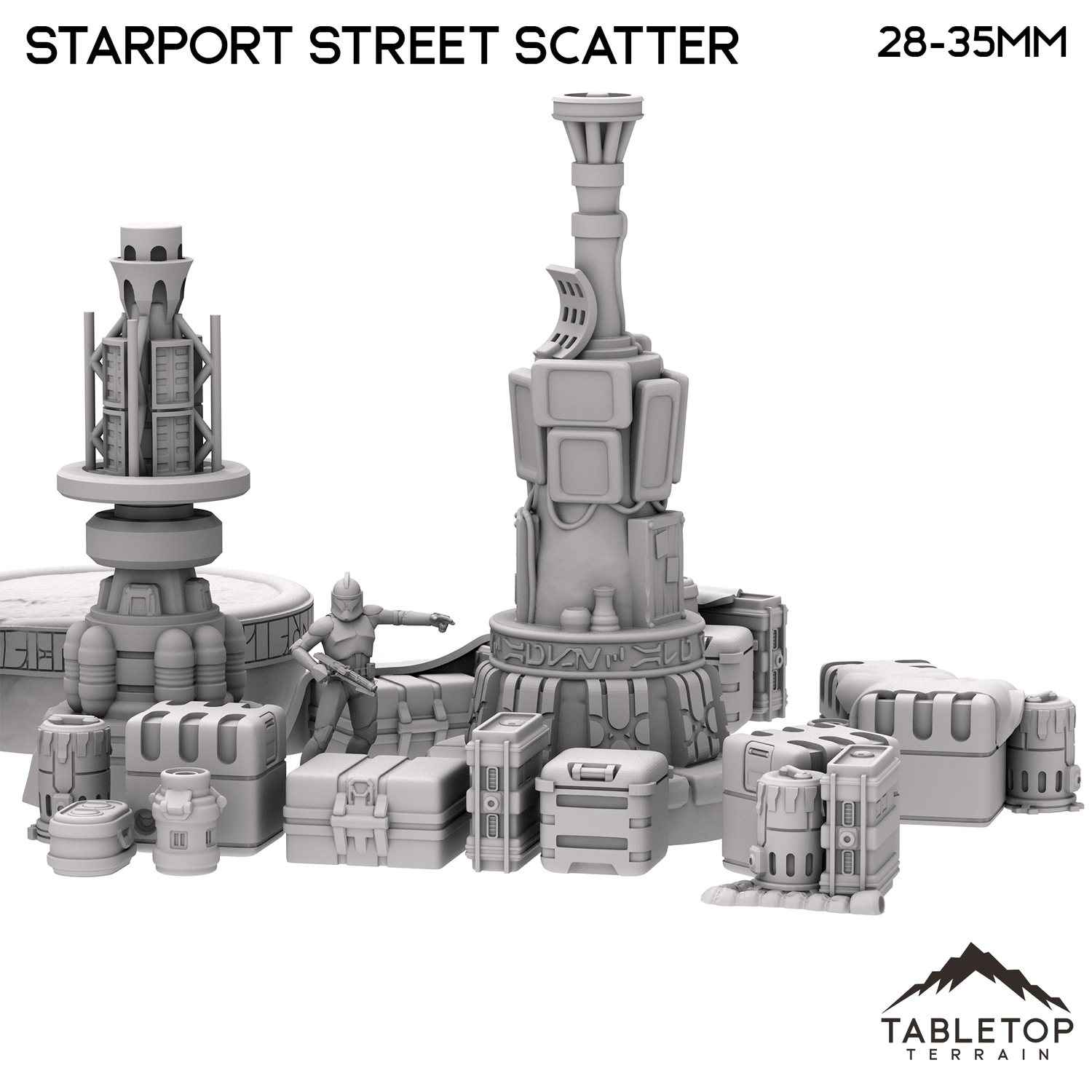 The Starport Street Scatter set includes three "meeting places" pylons for gathering points in city streets, four planters, as well as a set of 12 cargo stacks. The cargo stacks have an assortment of single, double, and combo piles of scatter.