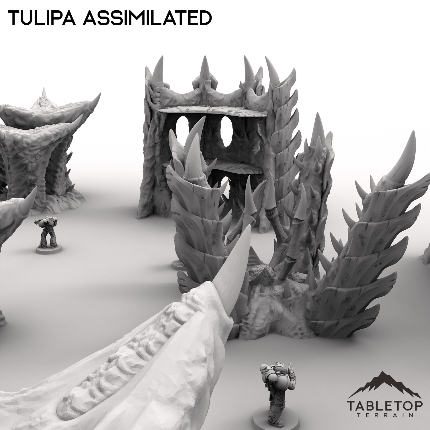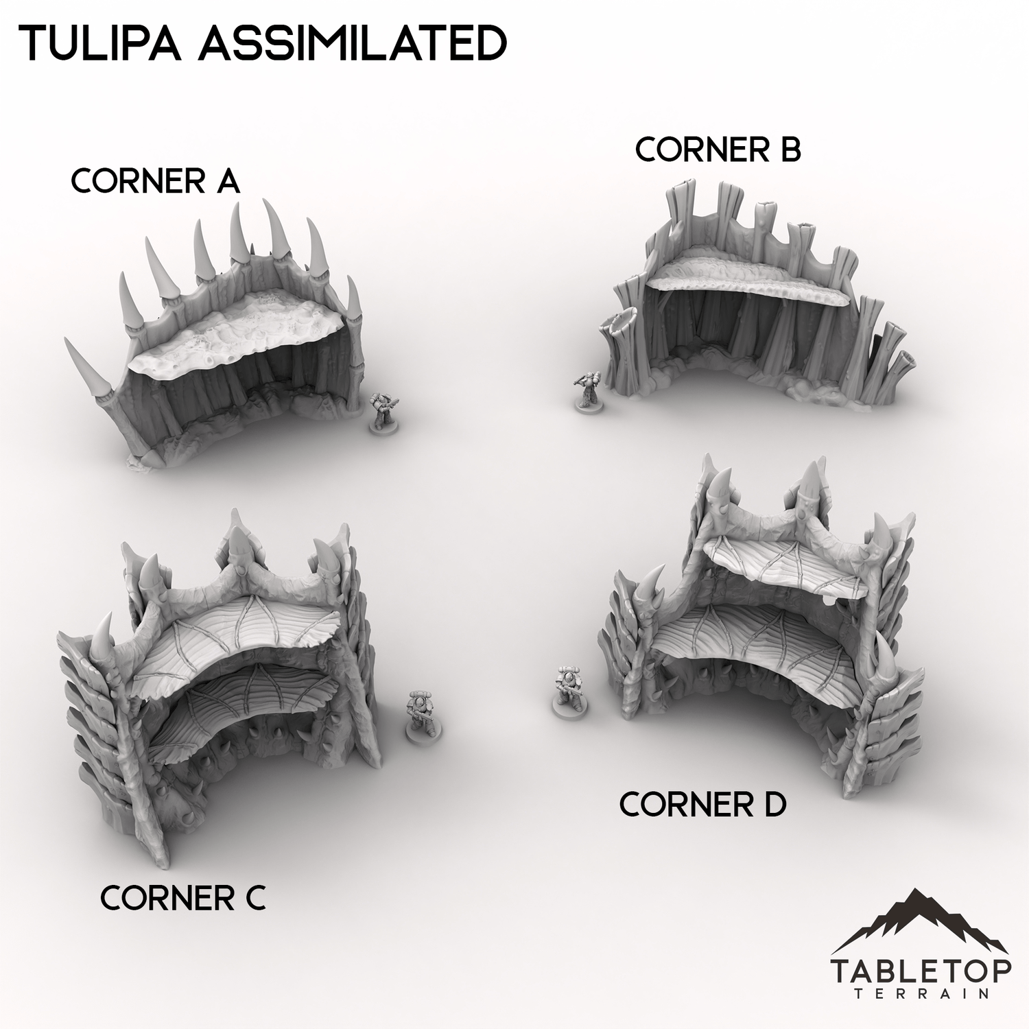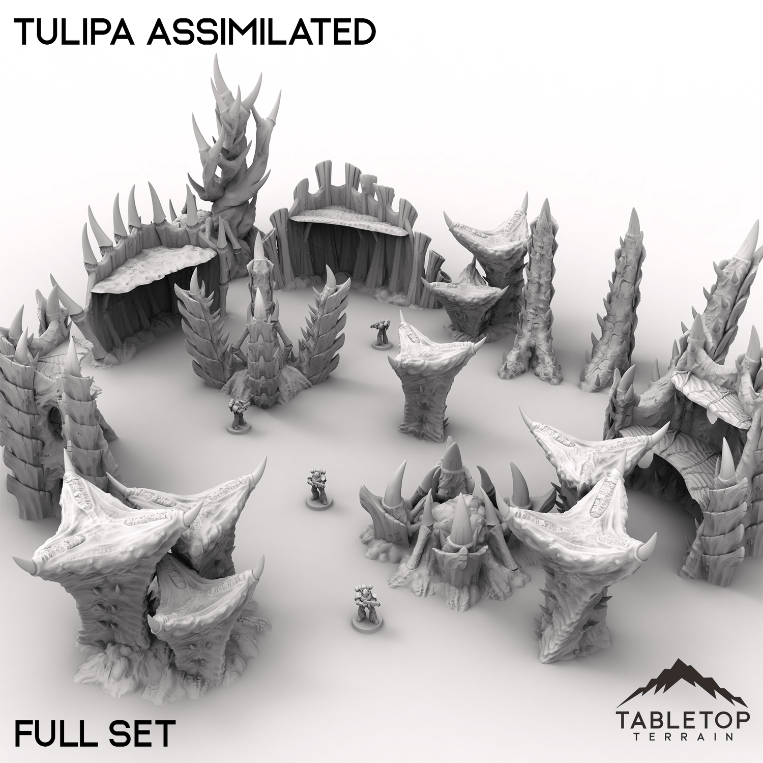 The world of Tulipa Assimilated evokes an eerie, organic landscape, twisted and reshaped by an alien presence. Gnarled platforms and jagged talon-like spikes rise from the ground, forming unnatural growths that could serve as cover or fortifications. The remnants of corner ruins hint at a lost civilization, now overtaken by creeping bioforms. Buy each piece individually, or the Full Set at a discount.