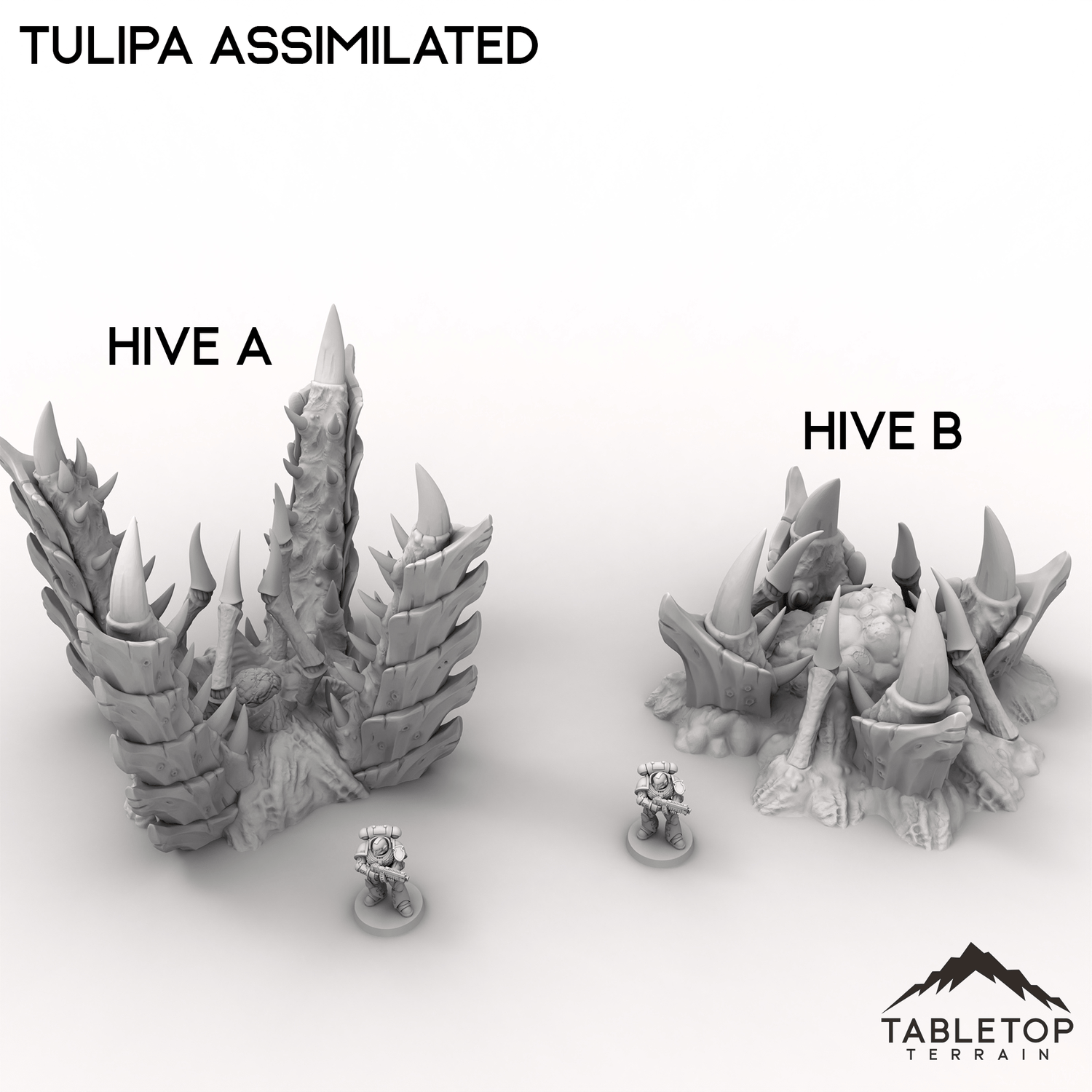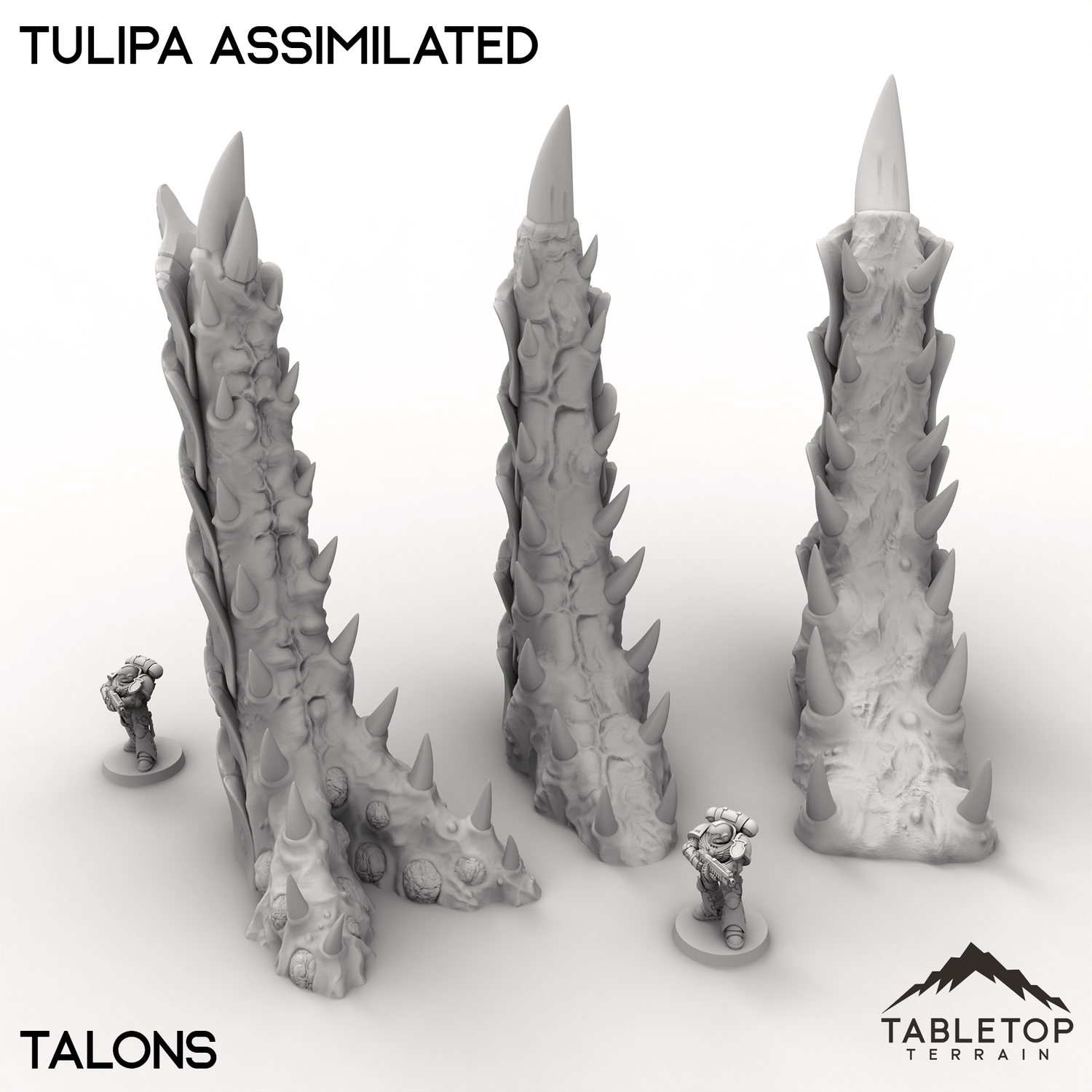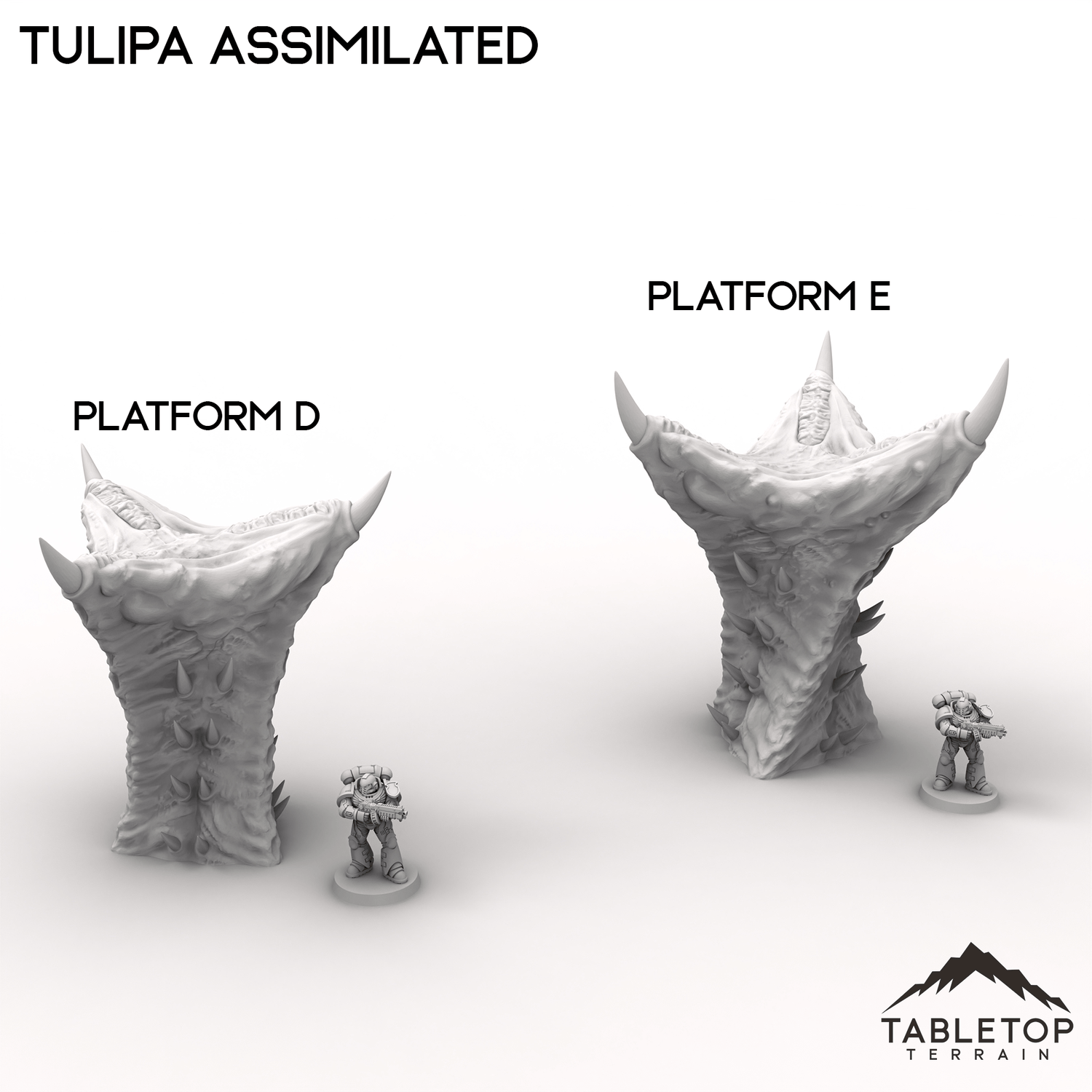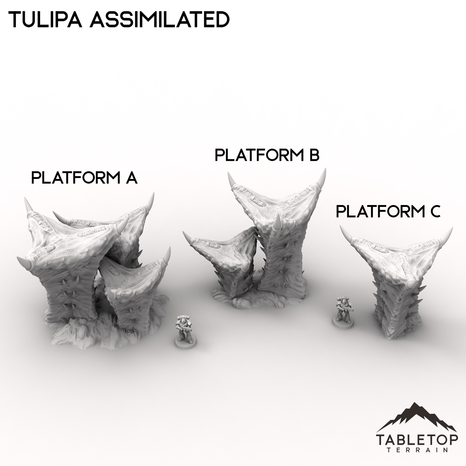 The world of Tulipa Assimilated evokes an eerie, organic landscape, twisted and reshaped by an alien presence. Gnarled platforms and jagged talon-like spikes rise from the ground, forming unnatural growths that could serve as cover or fortifications. The remnants of corner ruins hint at a lost civilization, now overtaken by creeping bioforms. Buy each piece individually, or the Full Set at a discount.