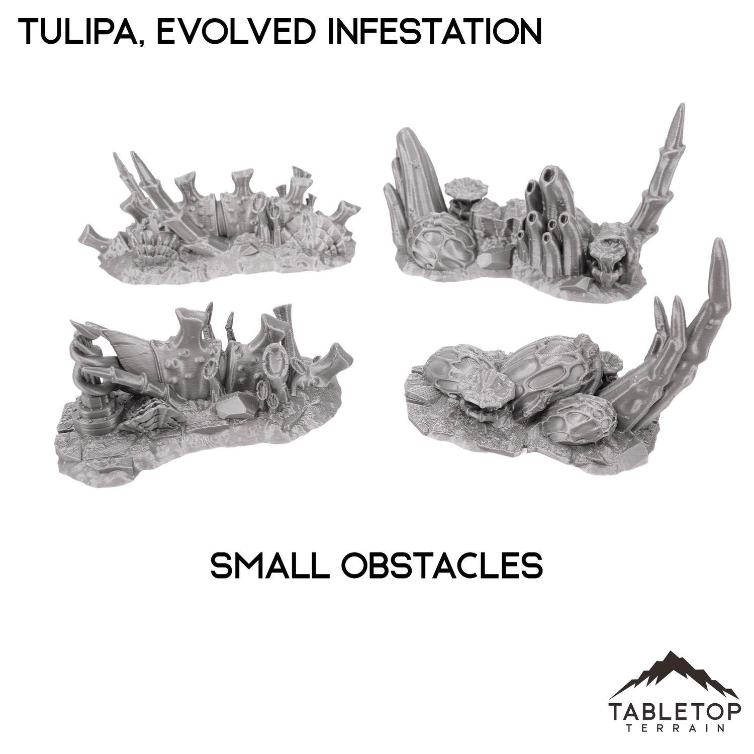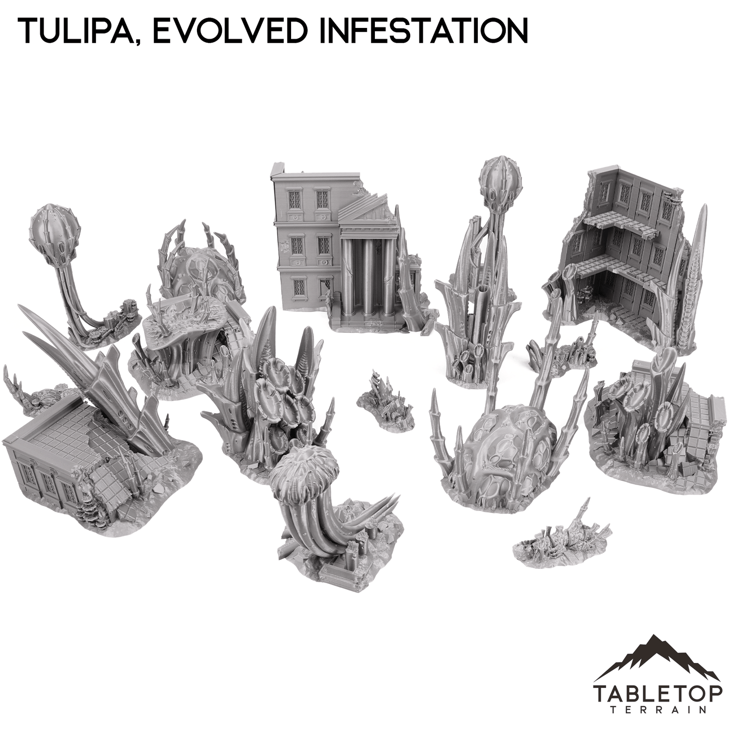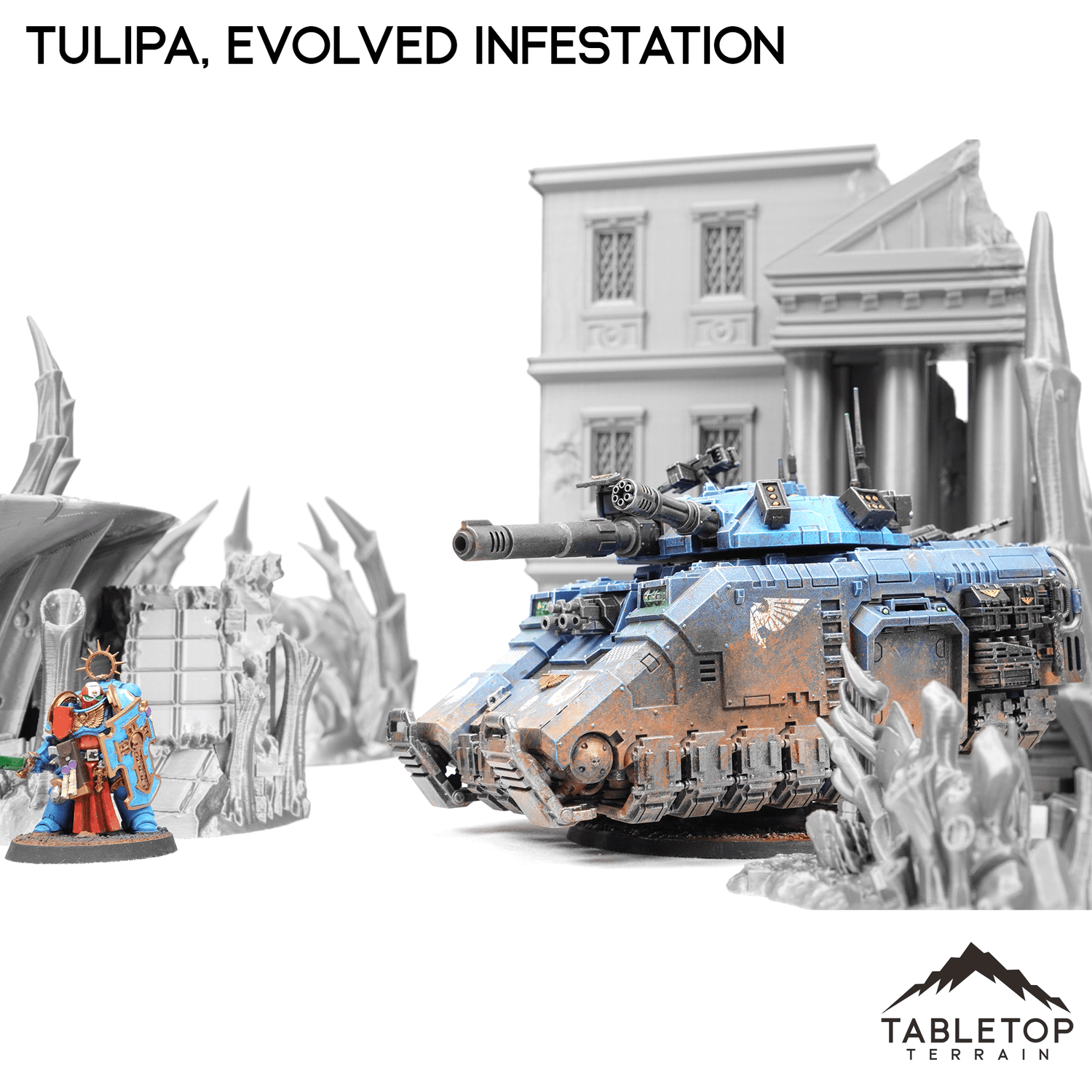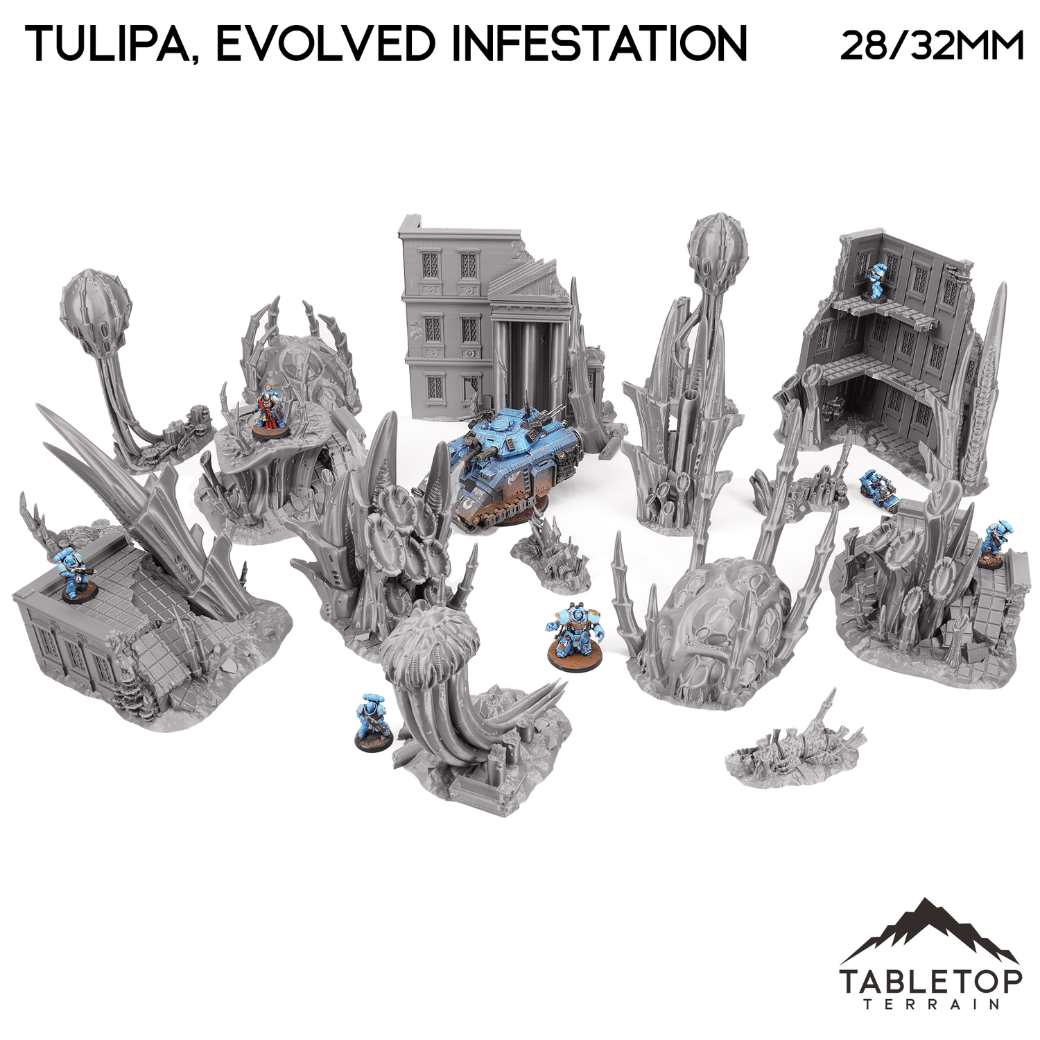 This thematic infected world terrain set represents a planet under siege from an alien invasion. It would work for a variety of bug armies. The full set fills up a 6x4 table with a lot of dynamic terrain elements including large line of sight blocking on the taller structures. Each item is available individually but if you purchase the full set it includes a built in discount.