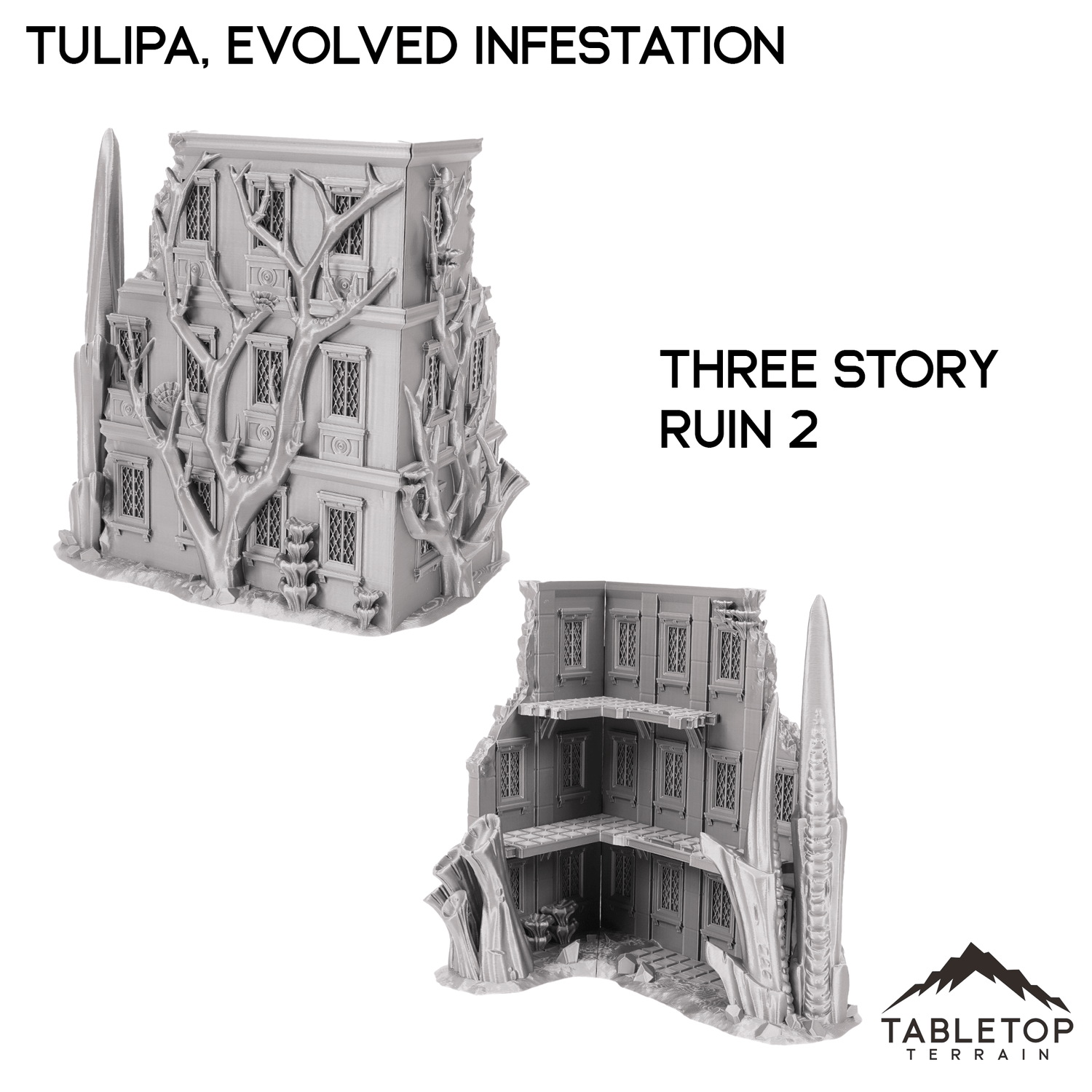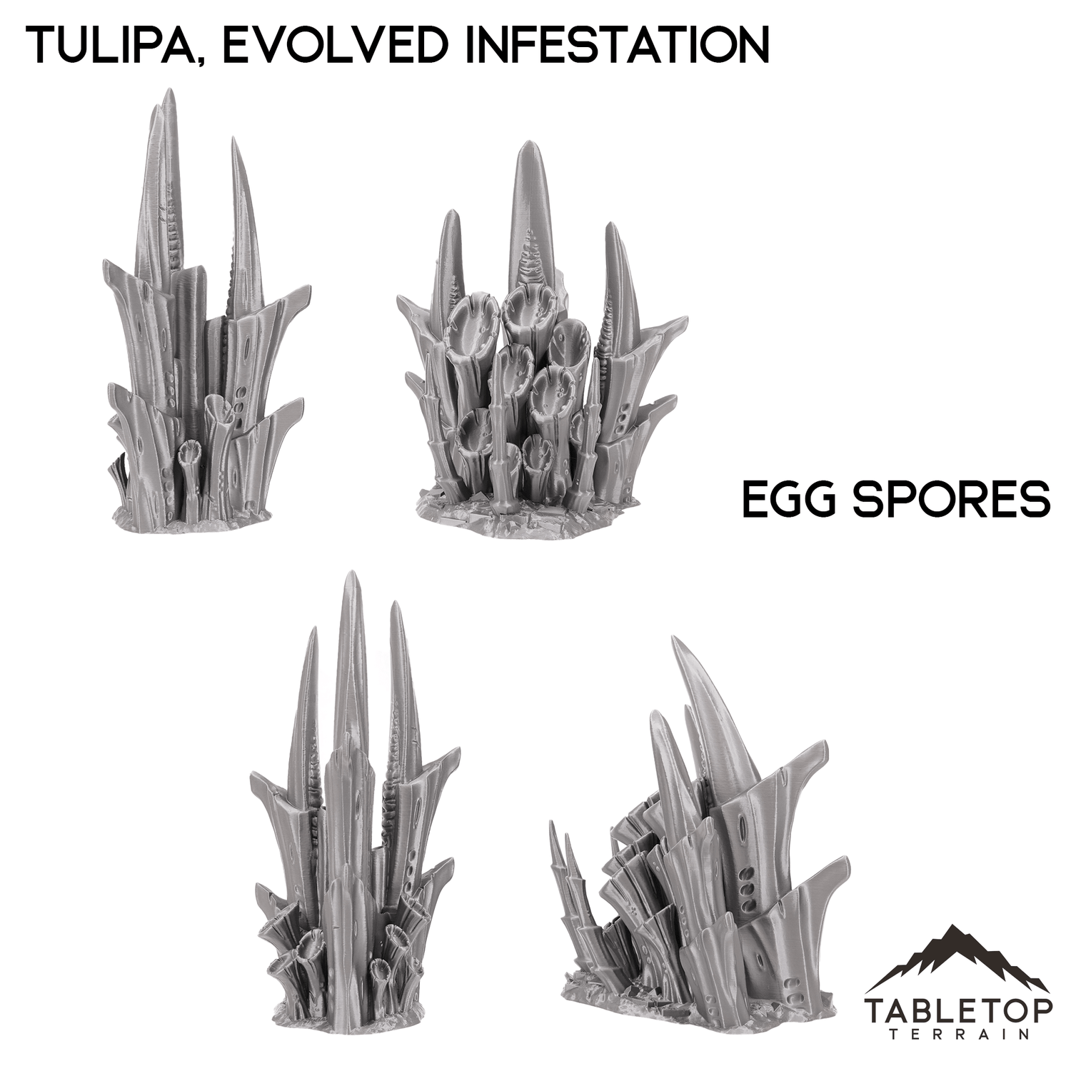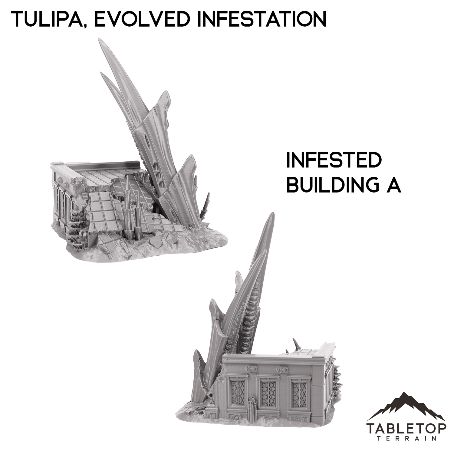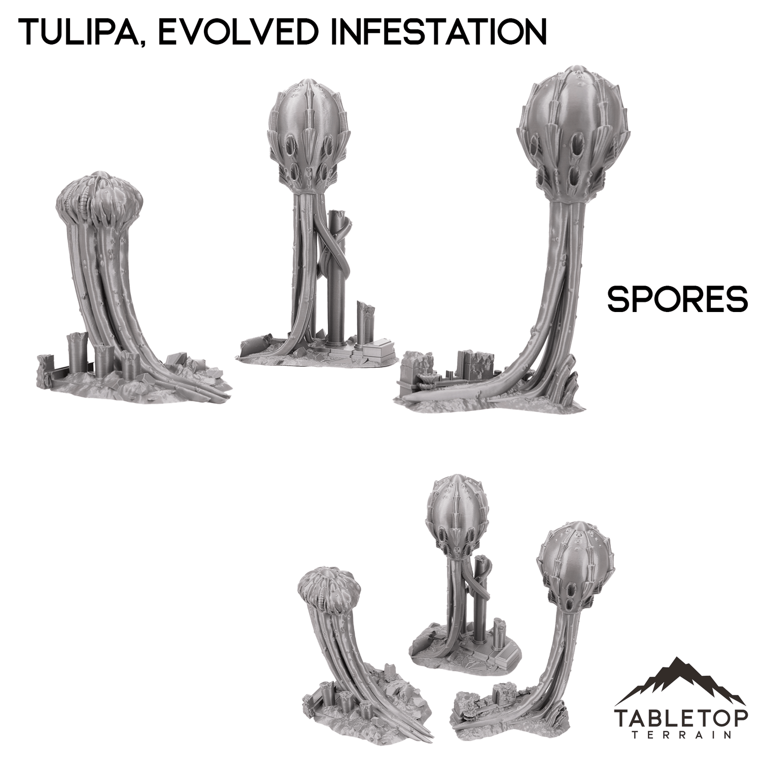This thematic infected world terrain set represents a planet under siege from an alien invasion. It would work for a variety of bug armies. The full set fills up a 6x4 table with a lot of dynamic terrain elements including large line of sight blocking on the taller structures. Each item is available individually but if you purchase the full set it includes a built in discount.