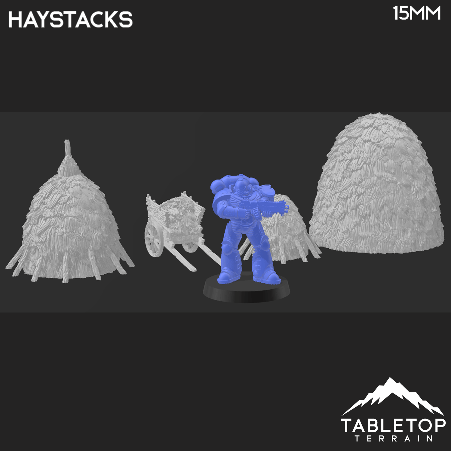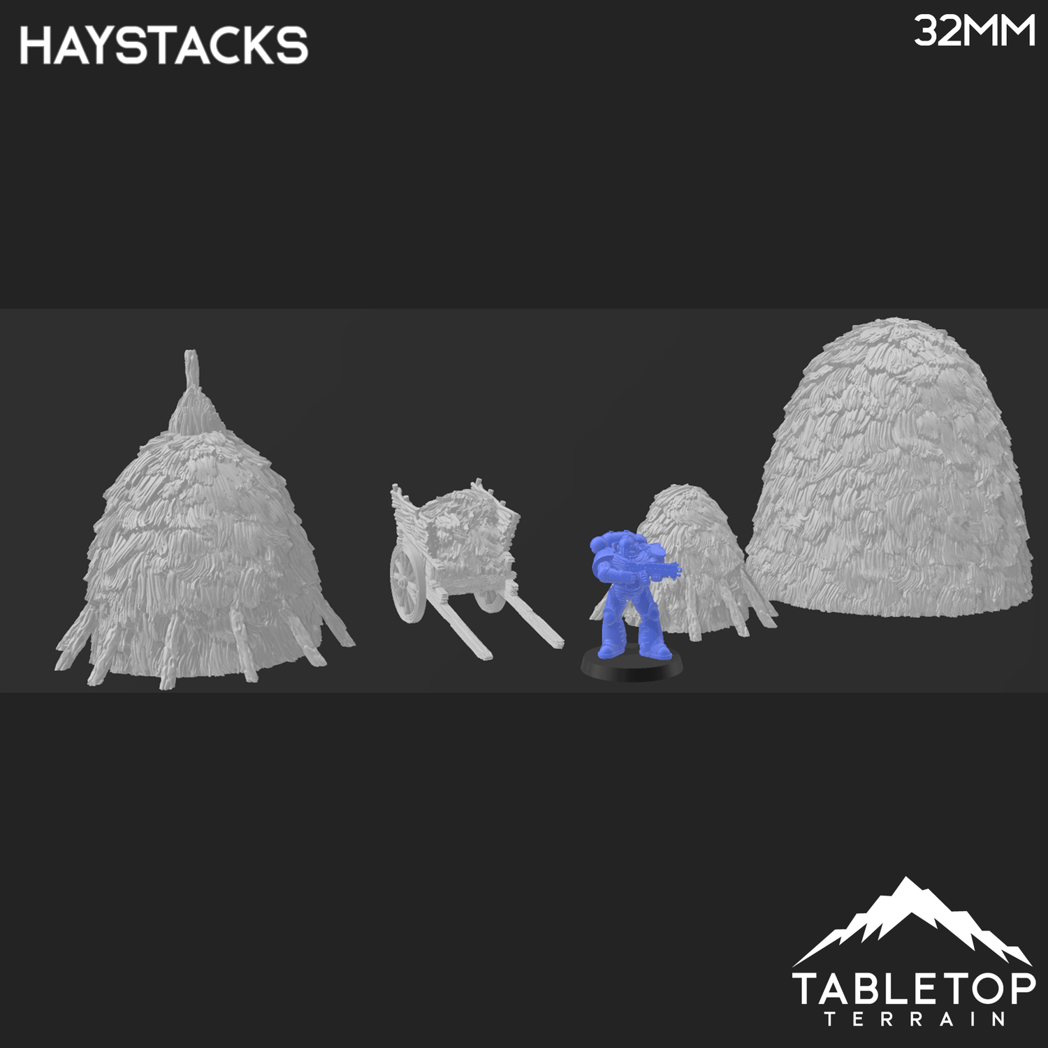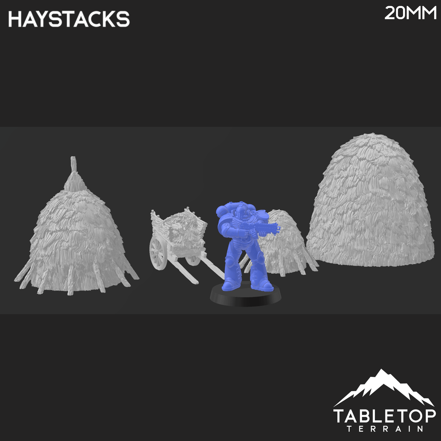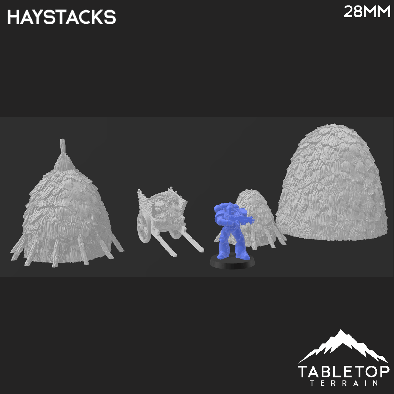 In 28mm scale, the largest haystack measures 89x89x83mm / 3.5x3.5x3.3 inches and the smallest haystack measures 52x53x38mm / 2.1x2.1x1.5 inches.