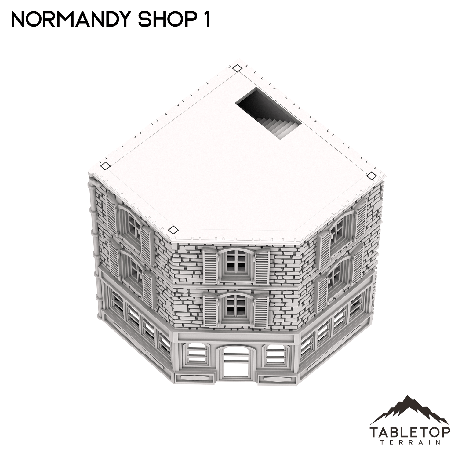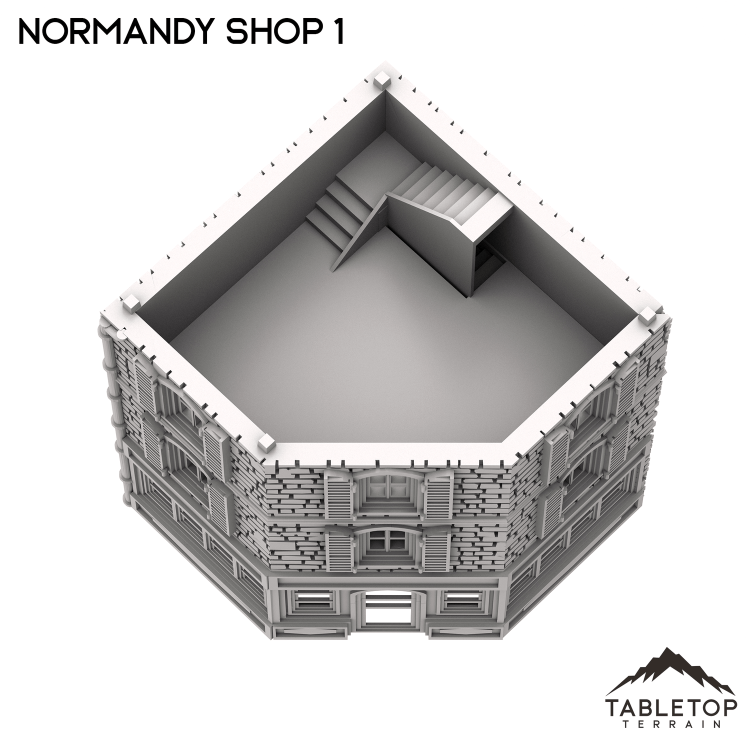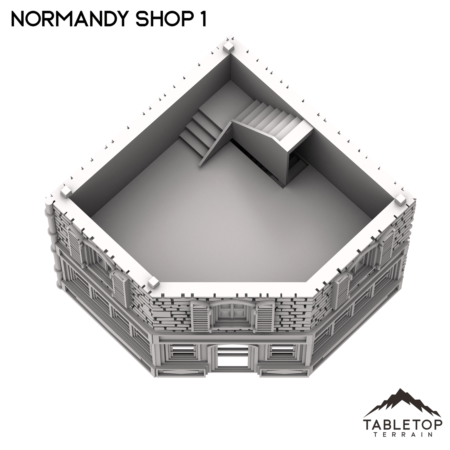 This Normandy Shop is a multi-floor stackable building with removable roof and enough room for miniature placement inside each level. View our "Normandy Town Square Pack" to see the full city street with a built-in discount on the entire pack.