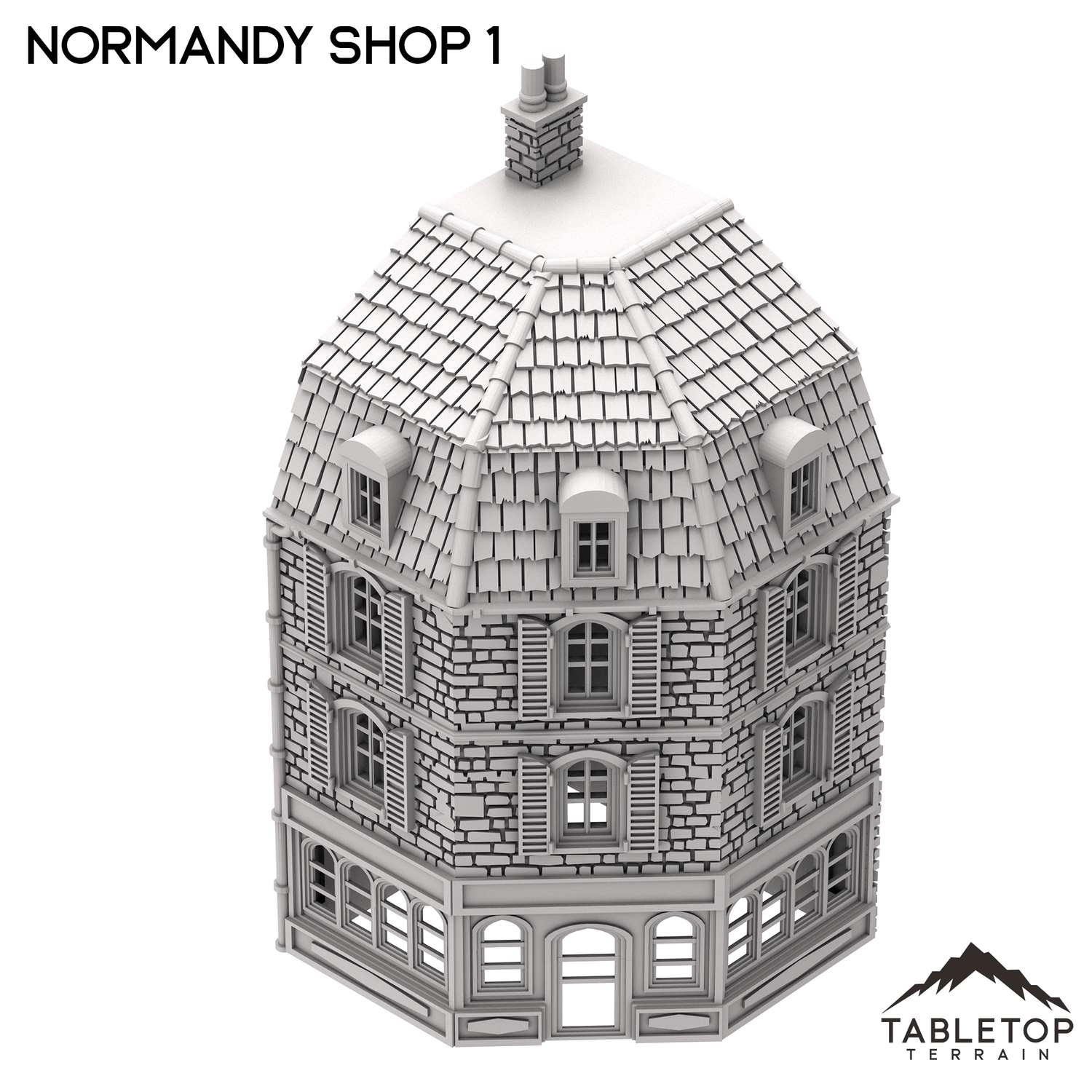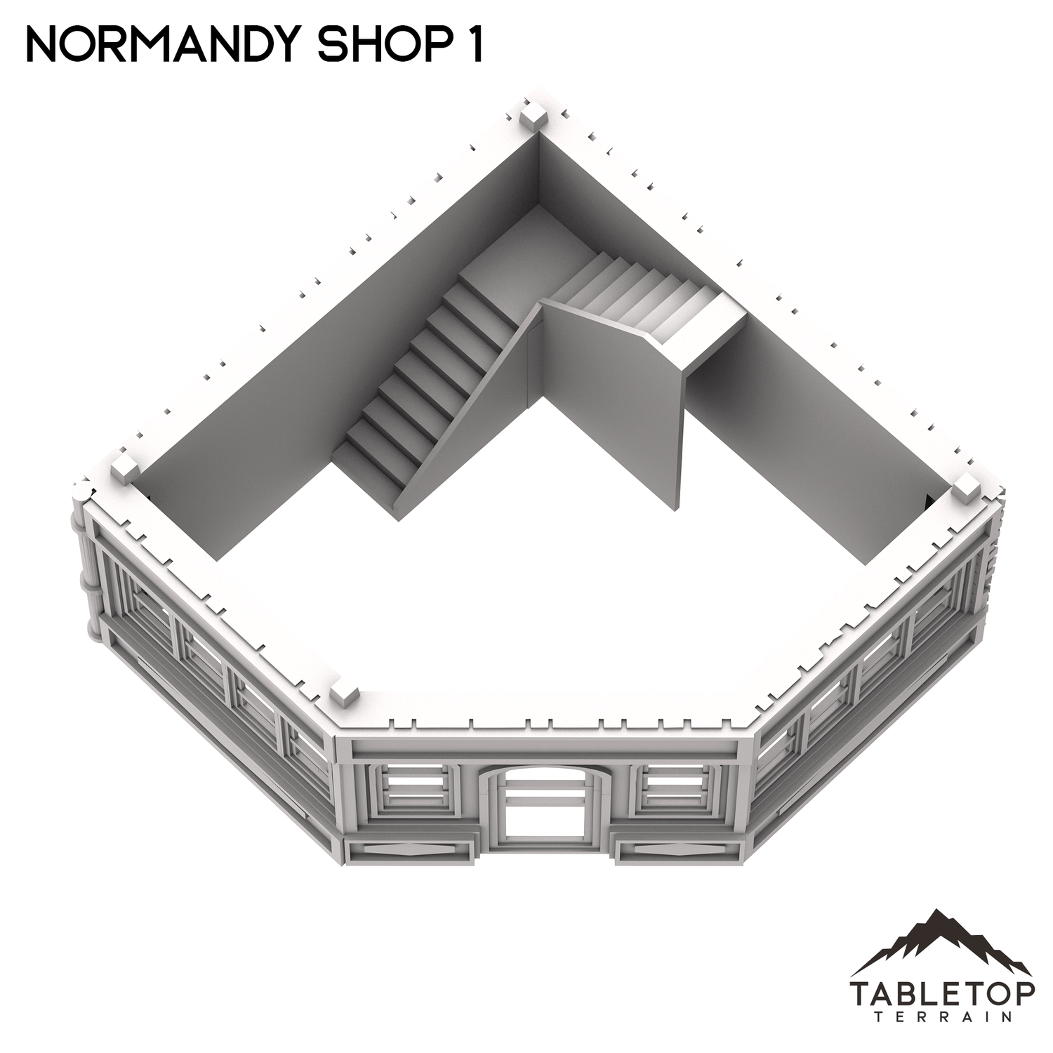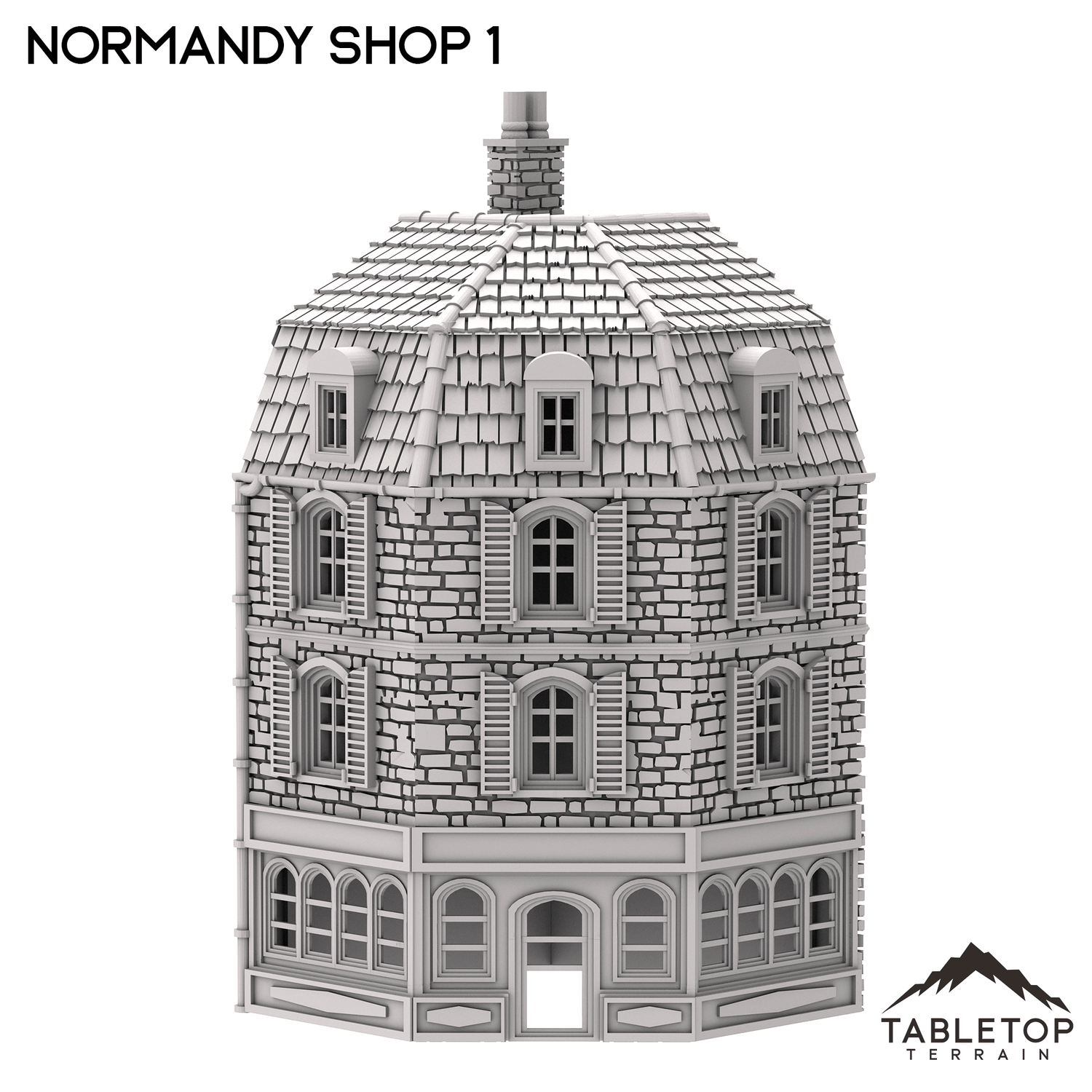 This Normandy Shop is a multi-floor stackable building with removable roof and enough room for miniature placement inside each level. View our "Normandy Town Square Pack" to see the full city street with a built-in discount on the entire pack.