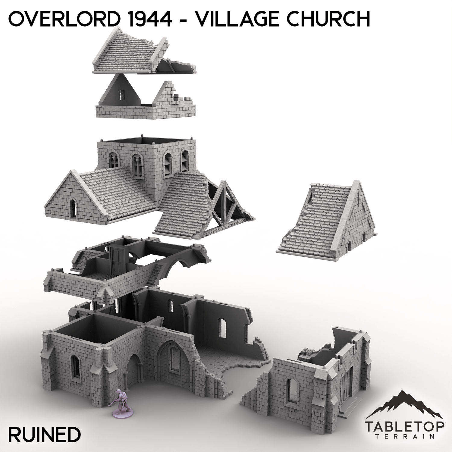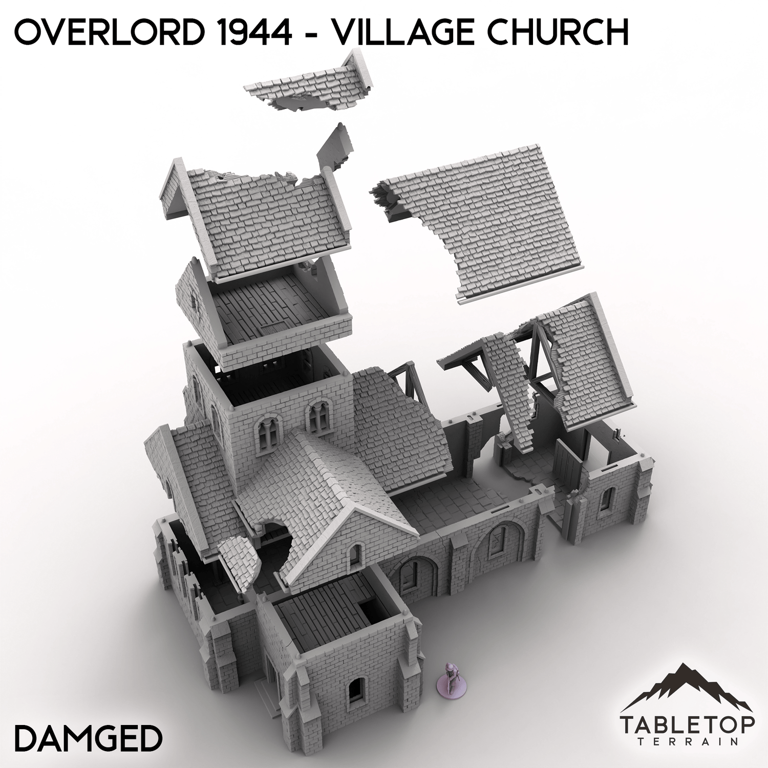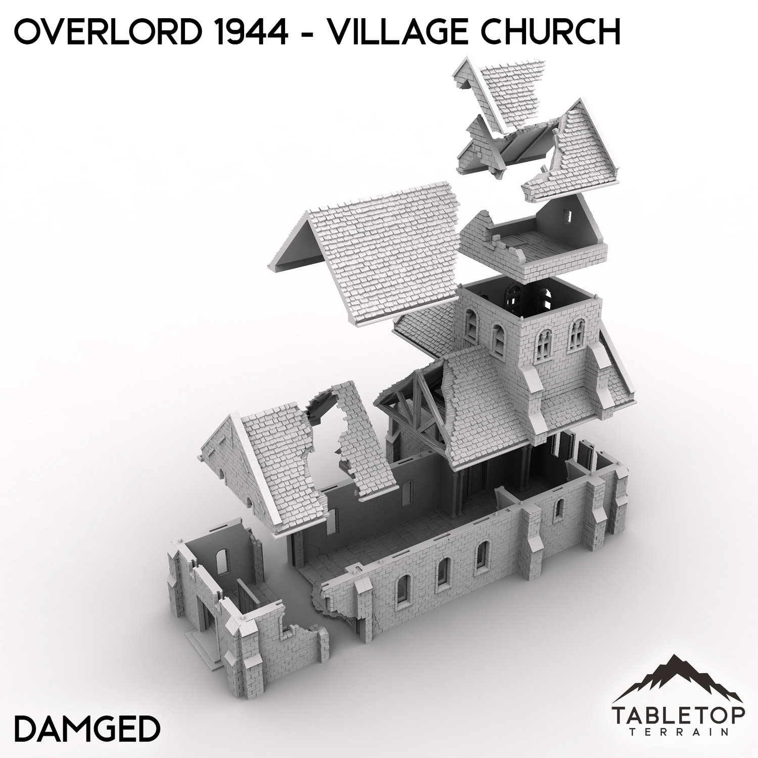 It comes in intact, battle damaged, and ruined versions for tabletop play. The battle damaged model features sections designed to be removed as the game progresses. The ruined version shows the aftermath with large sections of walls and roofs collapsed.