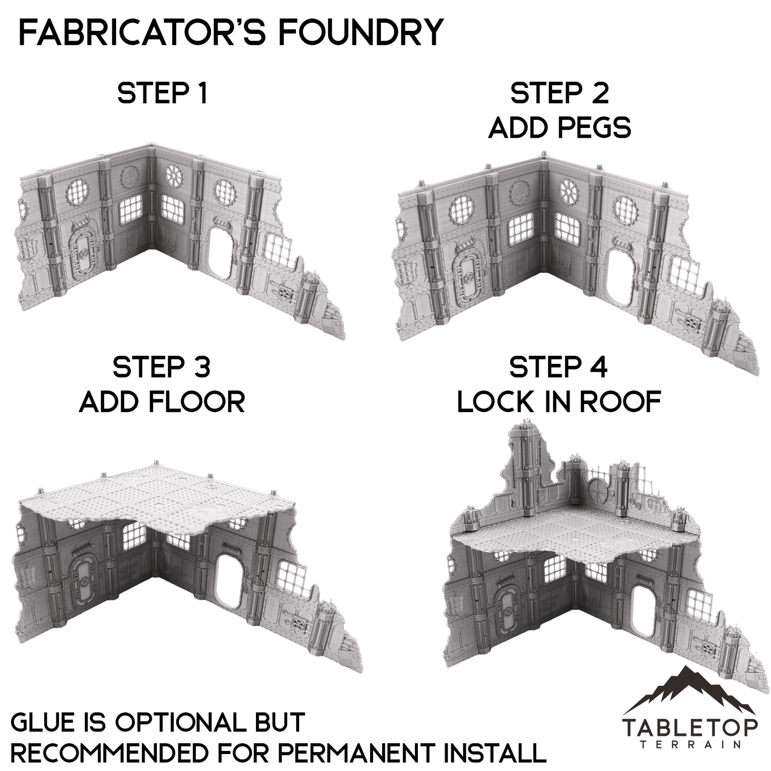 Each ruin has an upper, lower, and floor piece and can be assembled with super glue or included peg fasteners. For a permanent solution, we recommend gluing the pieces + floors together.