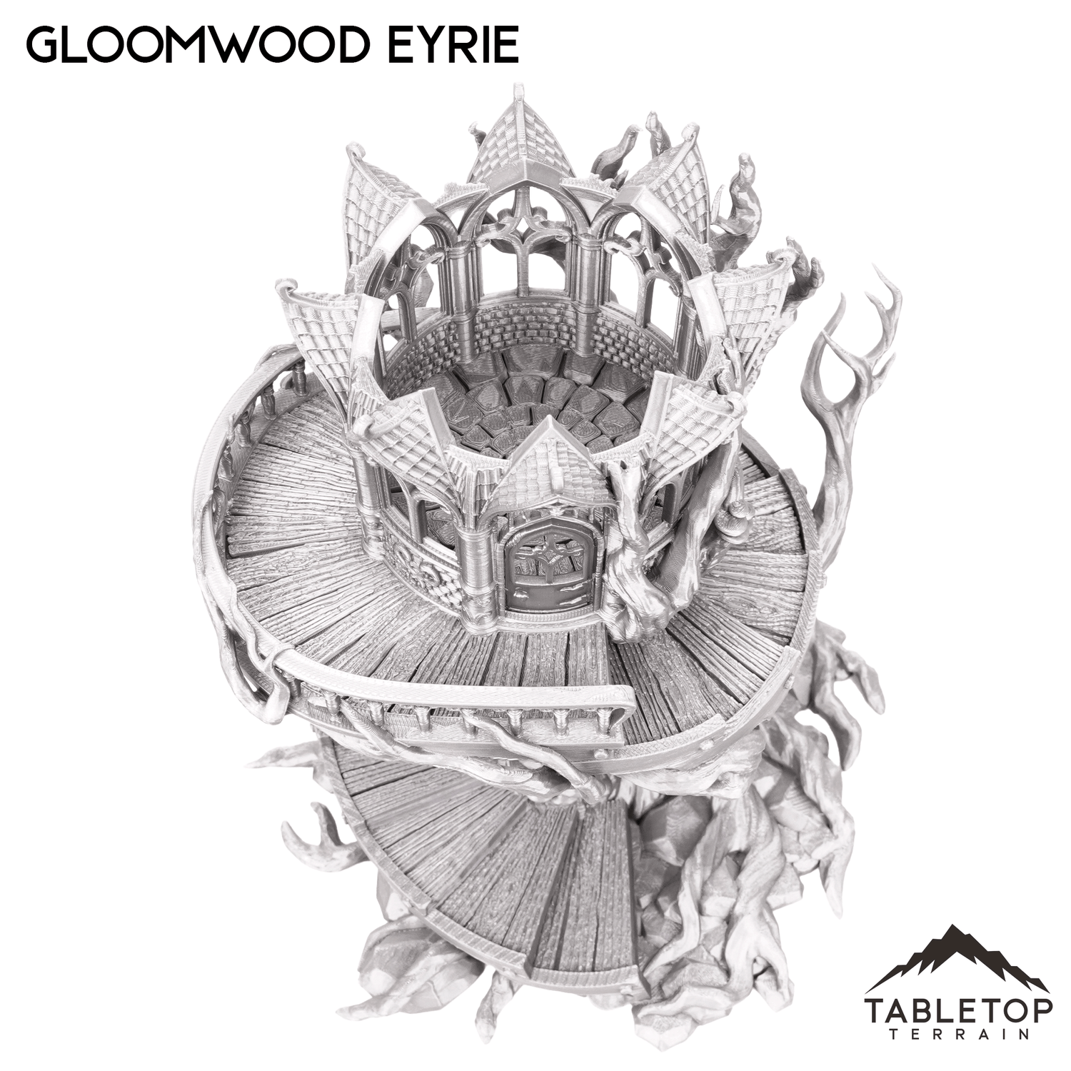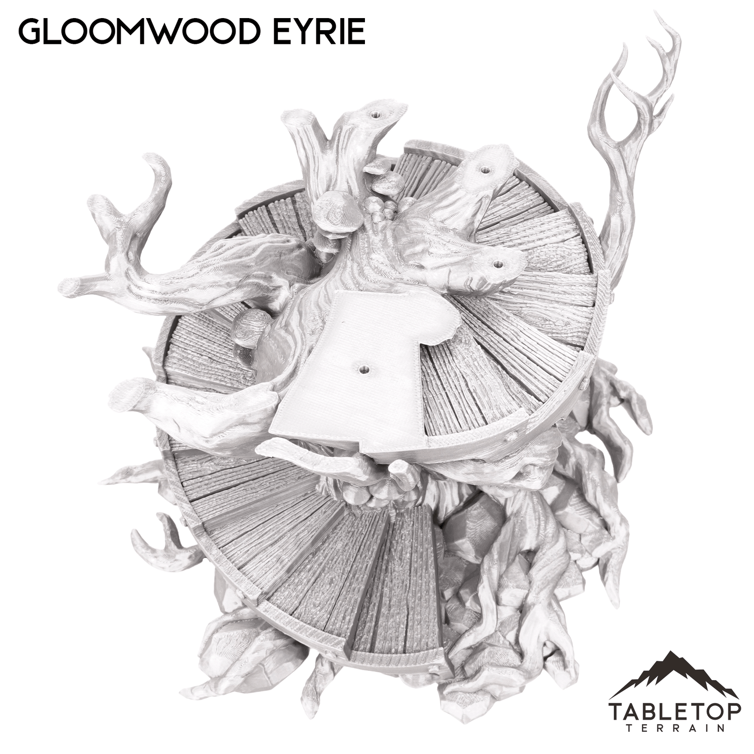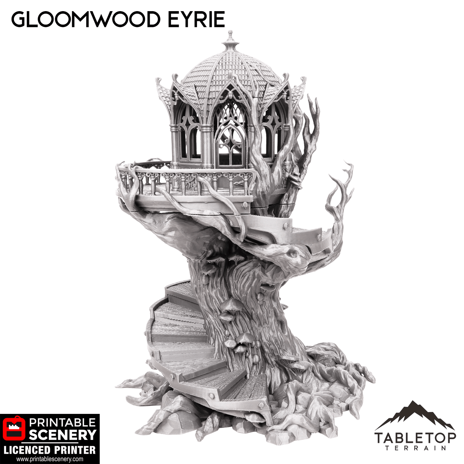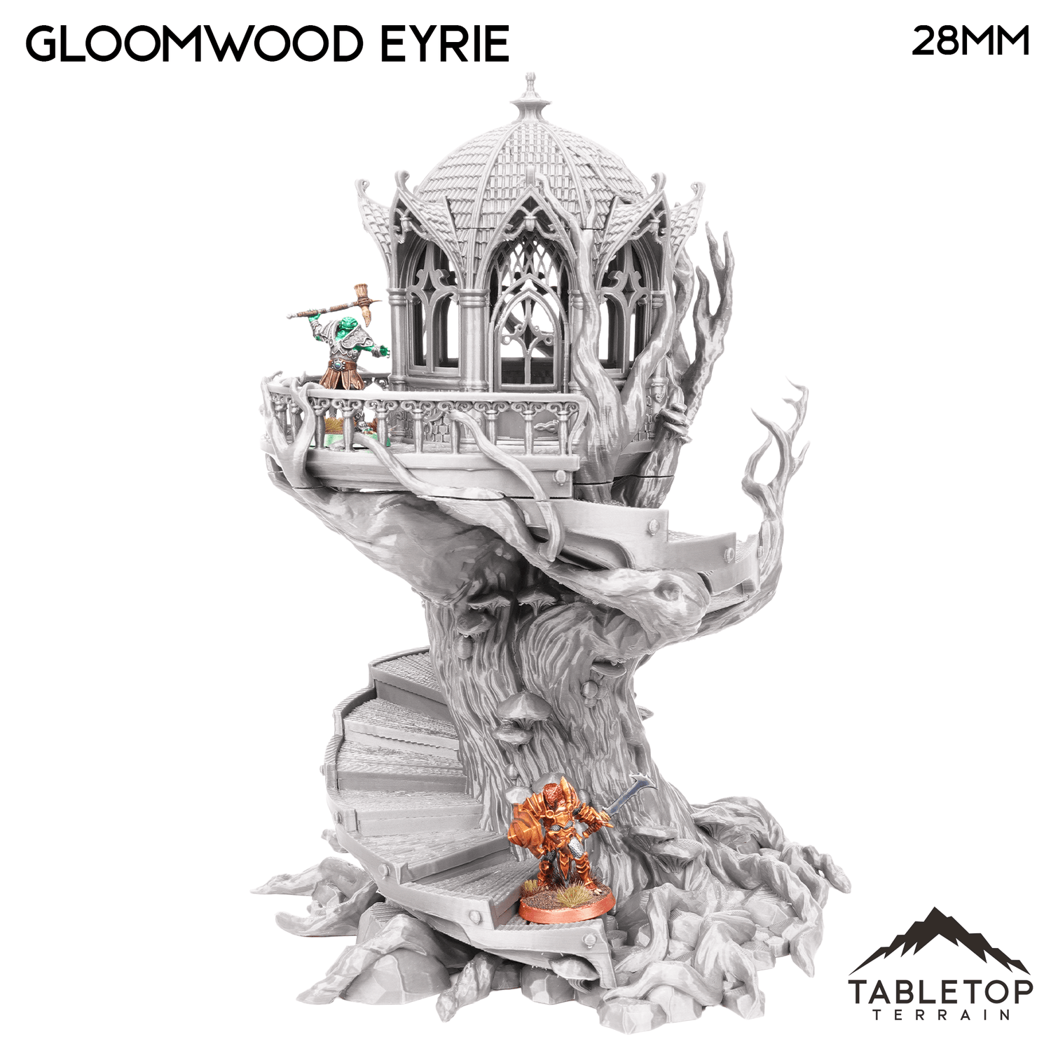 The Gloomwood Eyrie is an Elven, fantasy styled treehouse that features a removable roof and floor, along with a functioning door. The eyrie would be perfect for fantasy games such as Dungeons and Dragons (DND), Age of Sigmar (AoS), Pathfinder, Frostgrave, or Conquest.