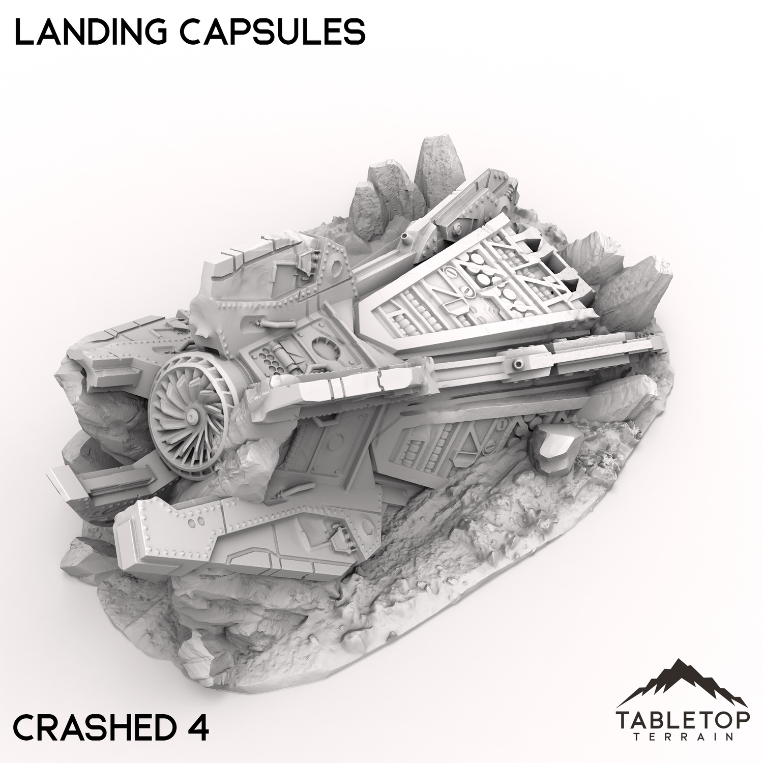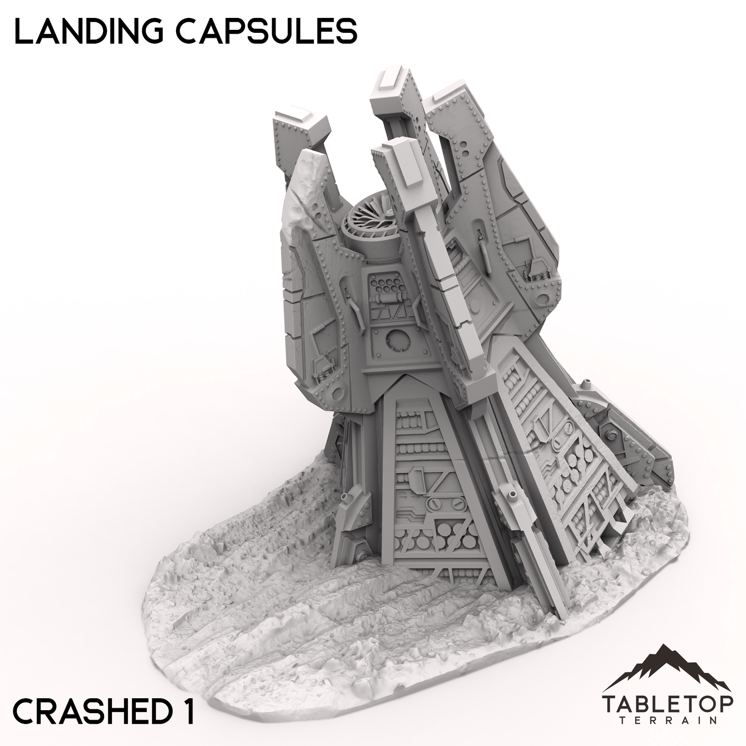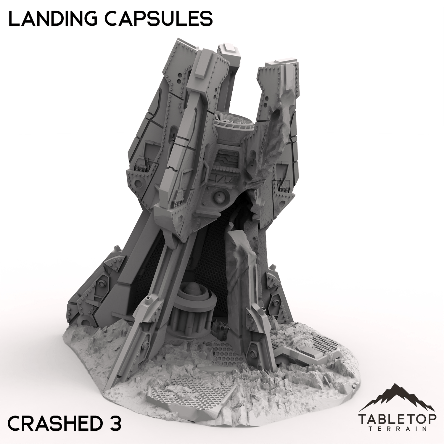 These landing capsules, resembling drop pods, have crash-landed with intense impact, embedding themselves deep into the terrain. Their reinforced metal shells, scorched from atmospheric entry, now serve as makeshift cover or strategic entry points on the battlefield. Ideal for sci-fi or futuristic tabletop scenarios, these landing capsules add a dynamic element to the environment, marking the arrival of reinforcements, a daring escape, or the start of an invasion. You can buy each piece individually or the whole set at a discount.