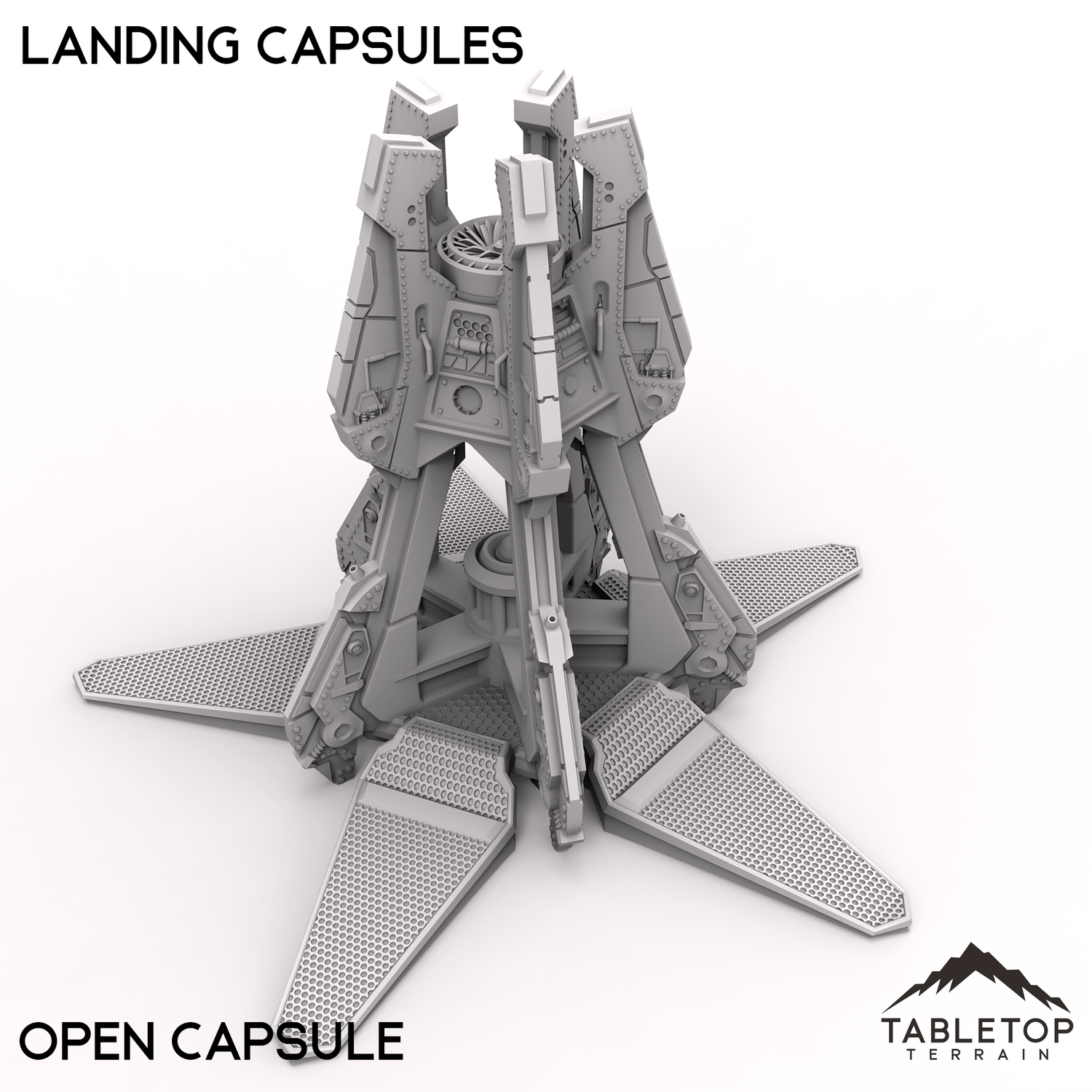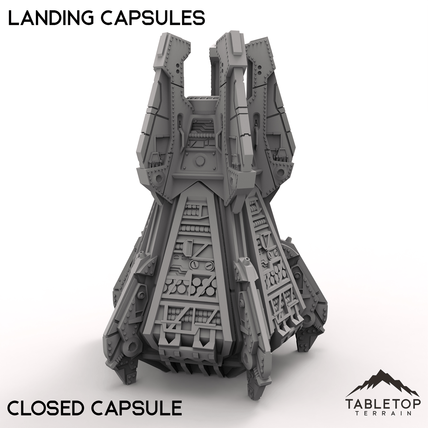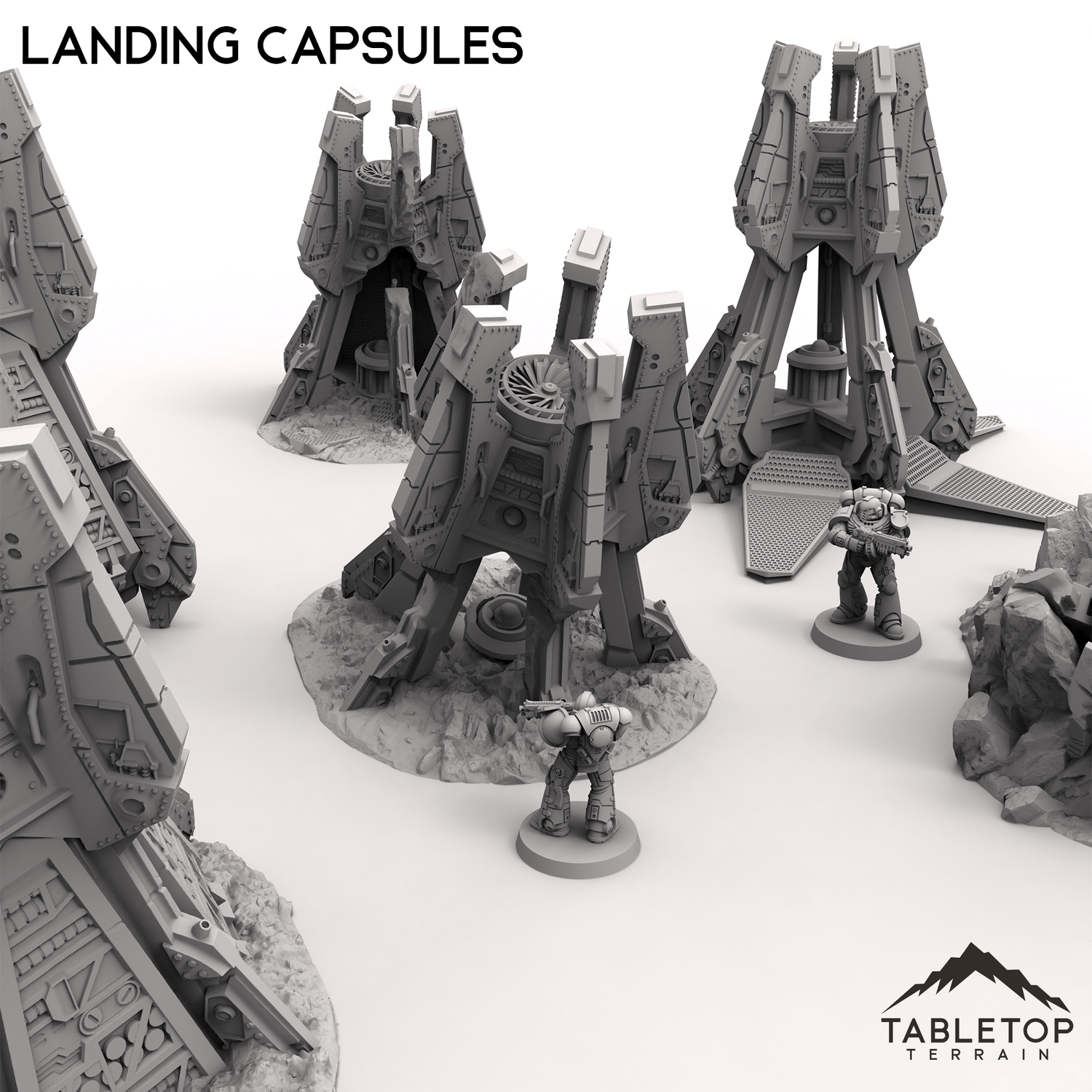 These landing capsules, resembling drop pods, have crash-landed with intense impact, embedding themselves deep into the terrain. Their reinforced metal shells, scorched from atmospheric entry, now serve as makeshift cover or strategic entry points on the battlefield. Ideal for sci-fi or futuristic tabletop scenarios, these landing capsules add a dynamic element to the environment, marking the arrival of reinforcements, a daring escape, or the start of an invasion. You can buy each piece individually or the whole set at a discount.
