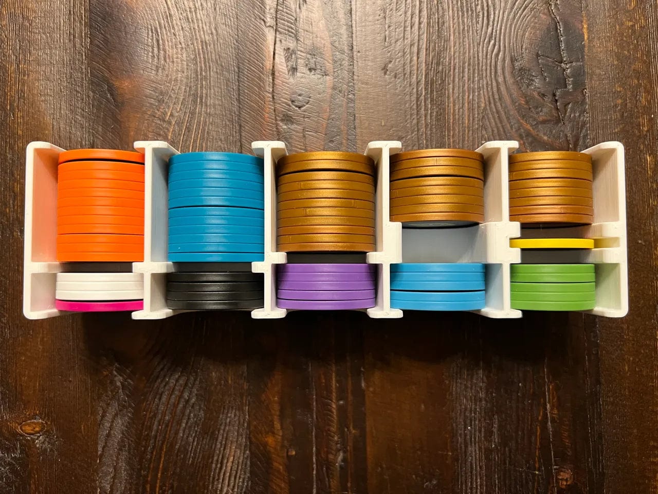-A chip tray to hold the all the chips you use during the game, other than the bot and captain chips, which are in the setup trays above. I designed this tray so each chip type is directly accessible from either the front or the back of the tray. No need to sift through rows of chips to get what you need. The only exception is the first player chip, which is in the middle of a row. But you only need to get that one out during setup.