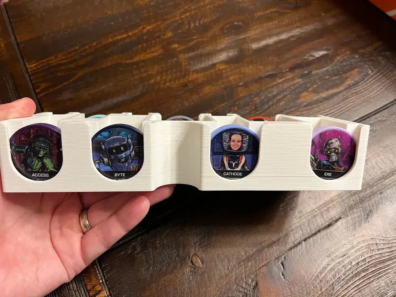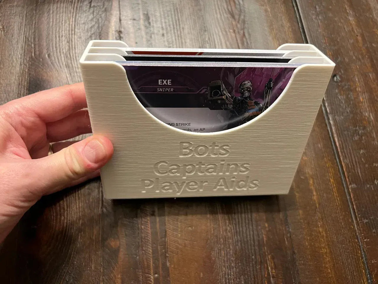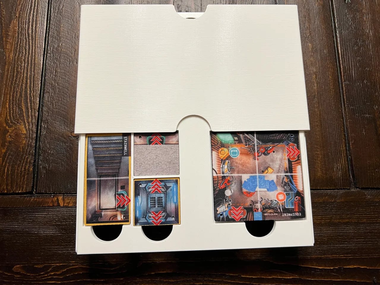 -Two large card holders. One holds the missions separated by corporation, with an extra slot for the adaptive missions. The second card holder is for the bots, captain, and reference cards. I bought four sets of reference cards, and I designed the tray so they all fit. You can also fit the original smaller reference cards in there, too.