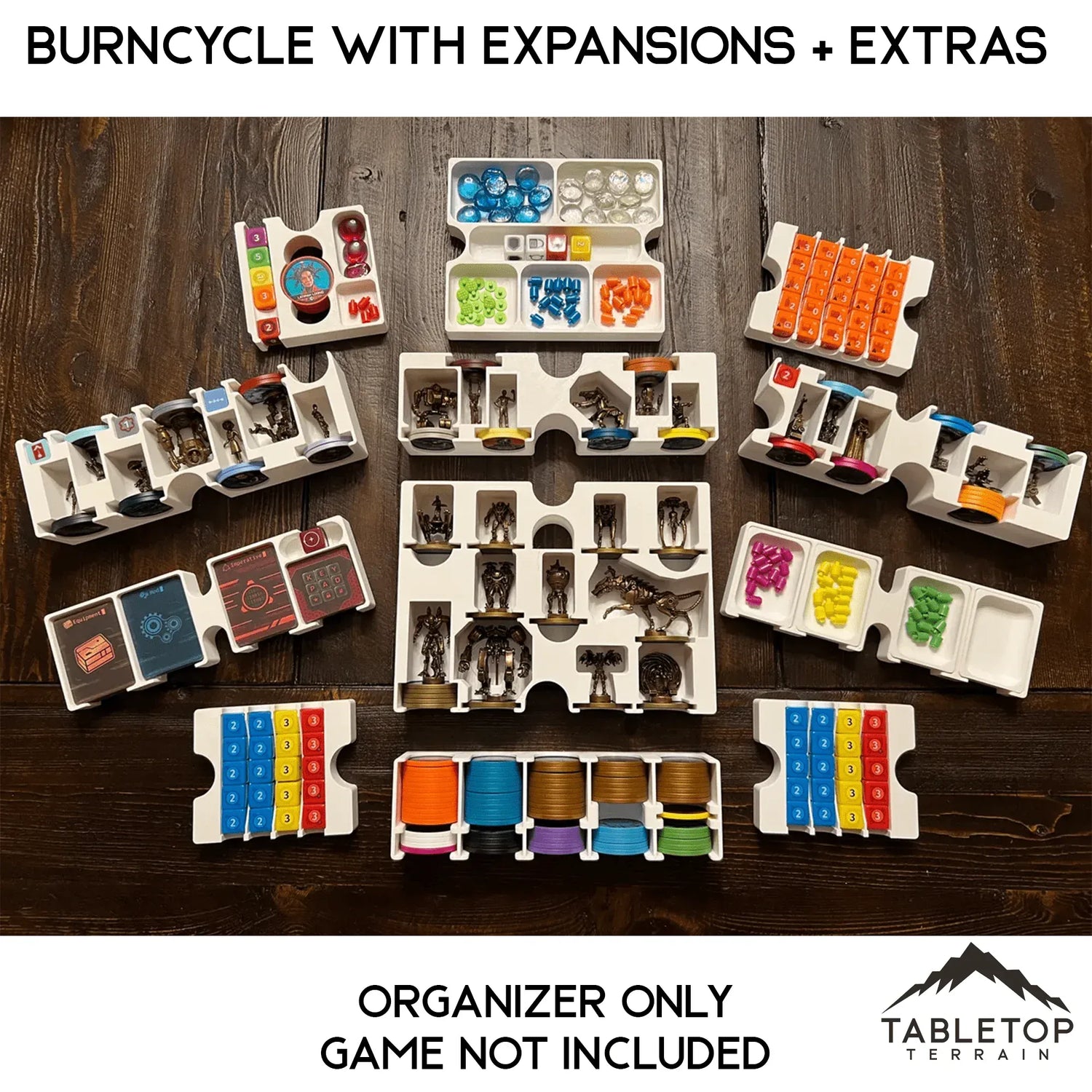 Designed by JS5002 on Printables. We have agreement with him to sell his designs in exchange for a royalty. -https://www.printables.com/model/682123-burncycle-insert-organizer-holds-all-expansions-an