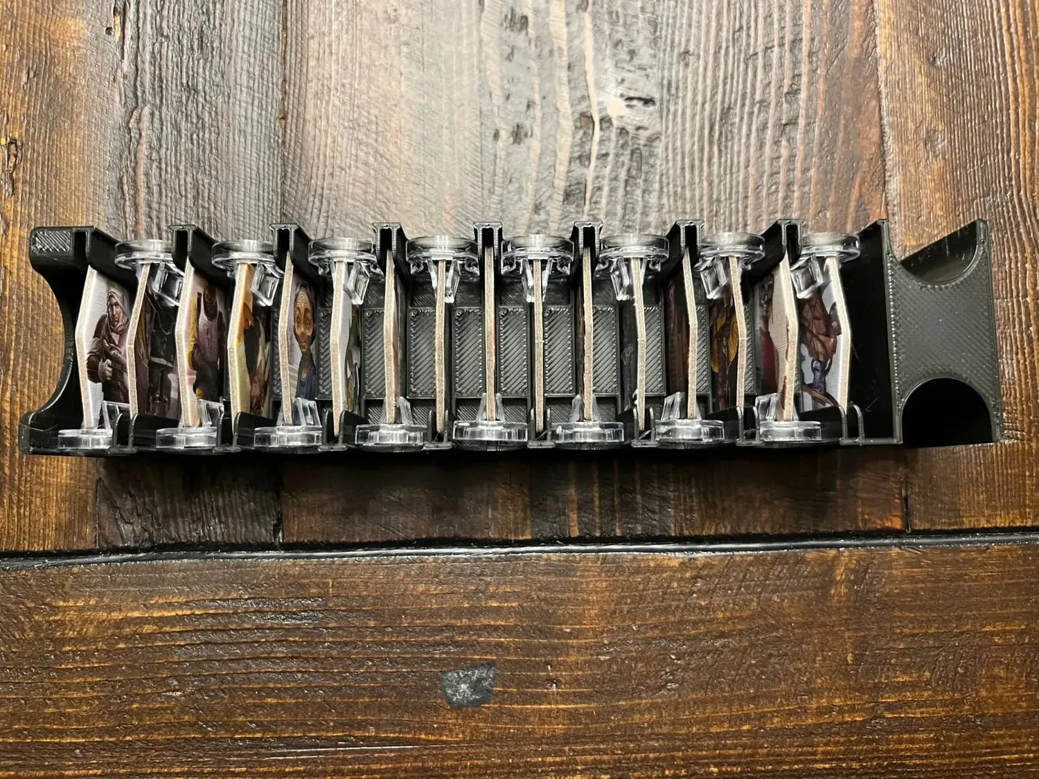* Market card trays that can be placed on the table and used during the game. I included a slight lip on the tops of these when they are lying flat on the table. This lip allows you to place the top card of each stack face up on the tray and it should stay in place. The market decks have different thicknesses, so I made a thicker market tray to hold the three thicker decks and a thinner market tray for the rest.