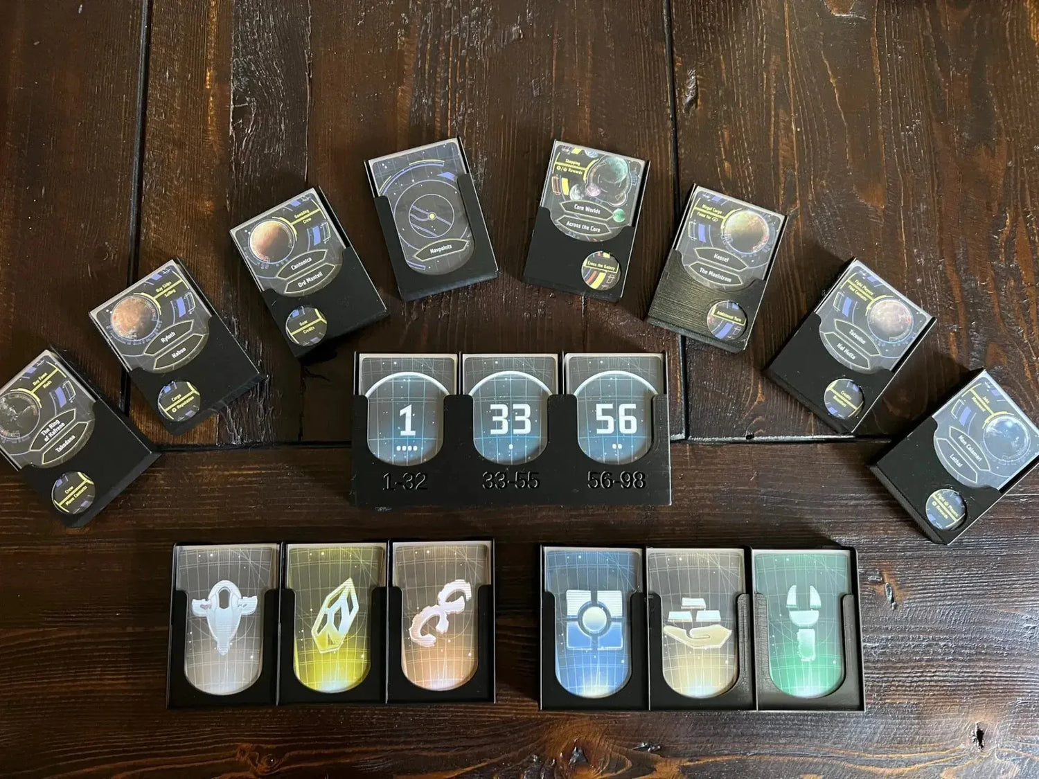 * Separate holders for the planet cards – just pull them out of the box and place them on the table near their planet on the curved main board. The planet cards have text identifying the types of things you may encounter when visiting, and I didn’t want to obscure that information. I included circular cutouts in the lower left / right corners of the planet card trays so this information remains visible.