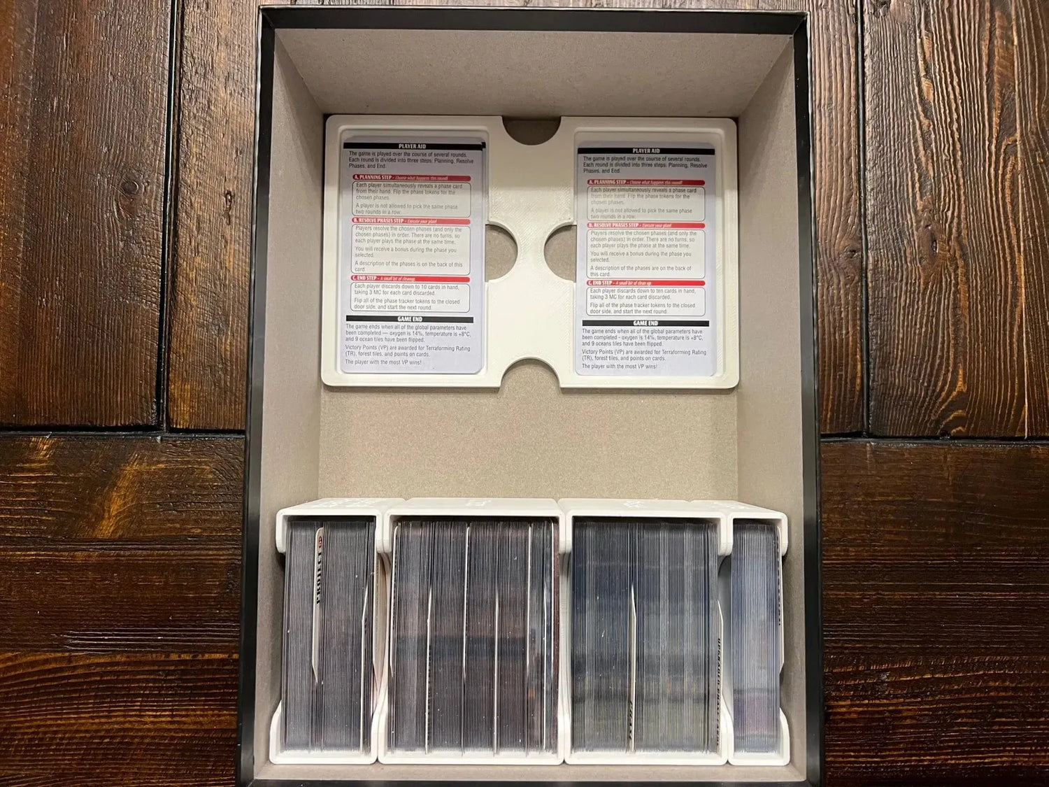 This is an insert / organizer for Terraforming Mars: Ares Expedition, along with the Discovery, Foundations, and Crisis expansions, in the larger Kickstarter expansion box. It has no lid lift, supports premium sleeves on the cards (Dragon Shield matte sleeves shown in the images), supports vertical storage, and was designed to aid setup and teardown. Here are some features of the insert.