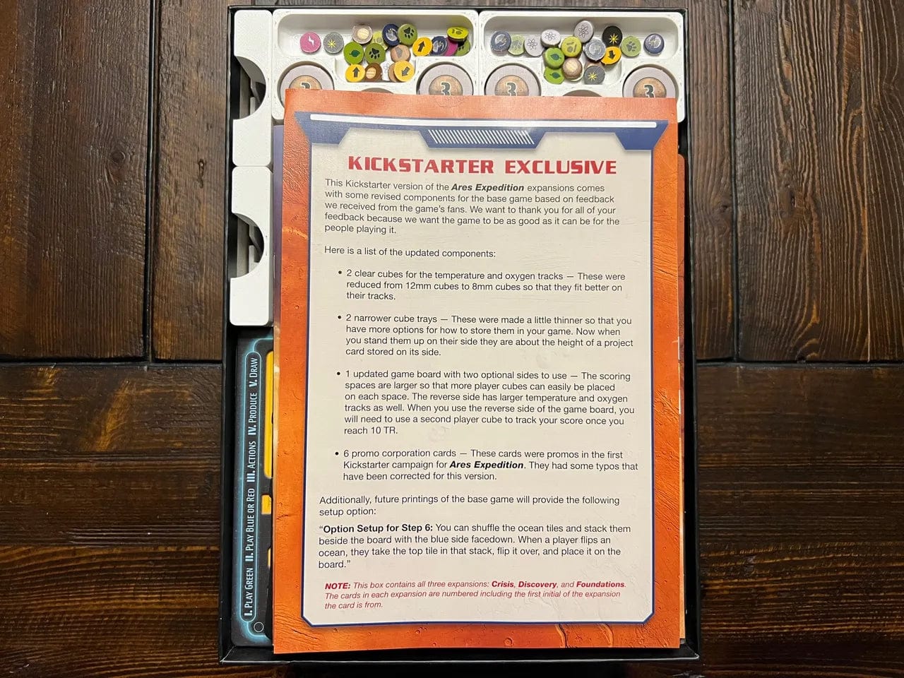 - Holds the expansion Kickstarter extras, including the reduced size clear cubes for the temperature and oxygen tracks, updated game board with larger tracking locations on one side (this replaces the original main board), and six promo corporation cards. It also holds the Kickstarter extras from the original Ares Expedition Kickstarter.