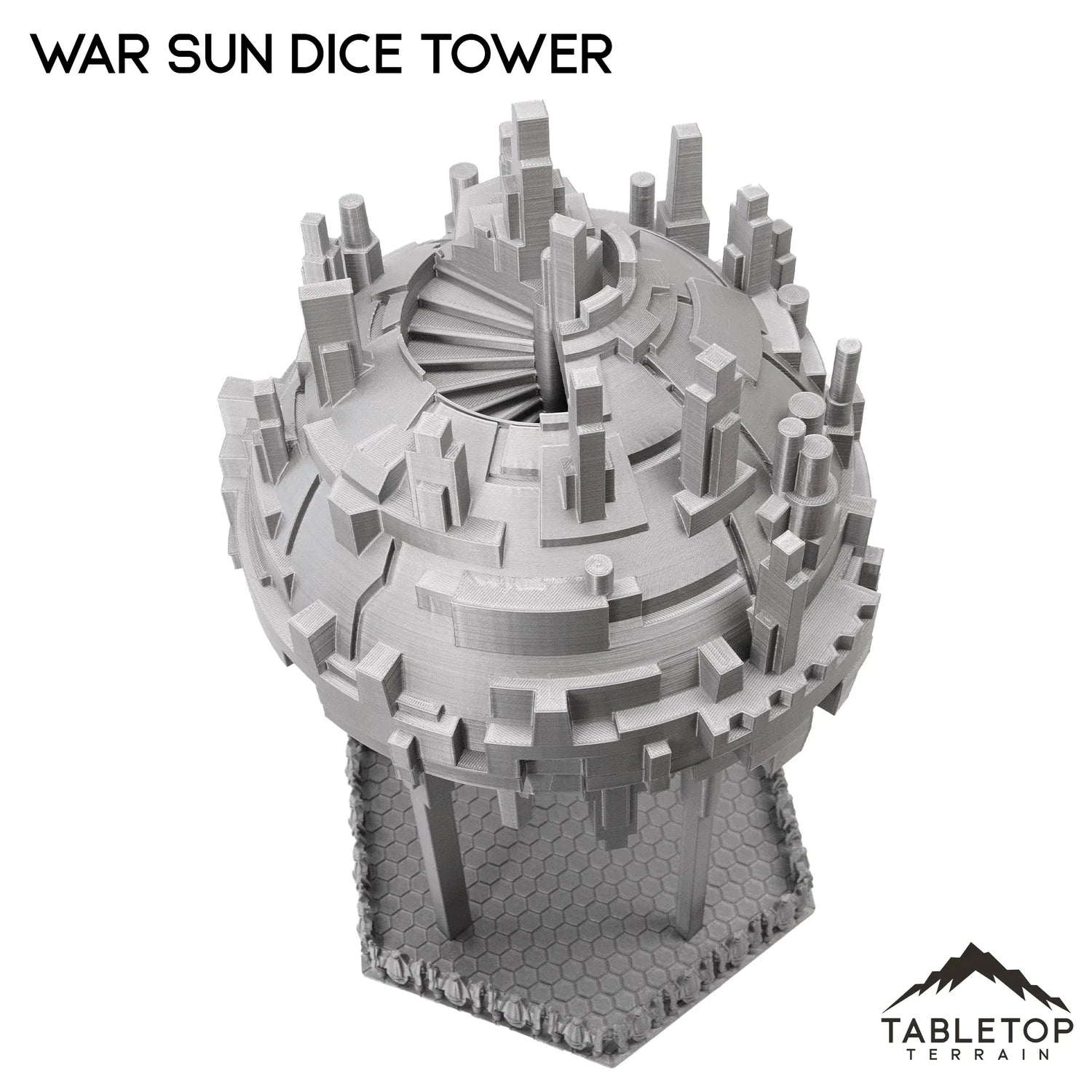 This is a massive dice tower in the shape of a War Sun from Twilight Imperium 4. The dice enter the tower at the top and topple down to the bottom to where you can see their result in the ring of fighters.