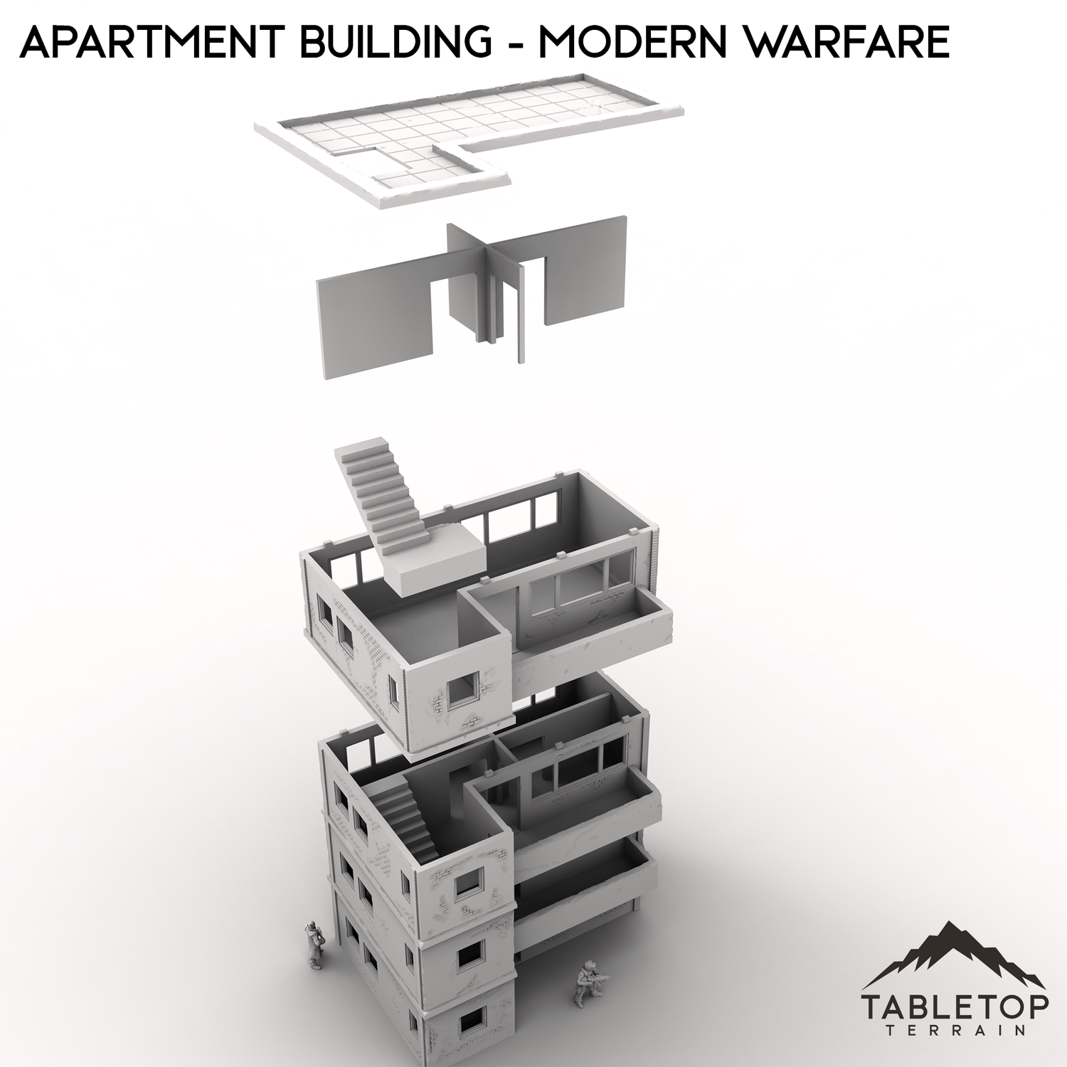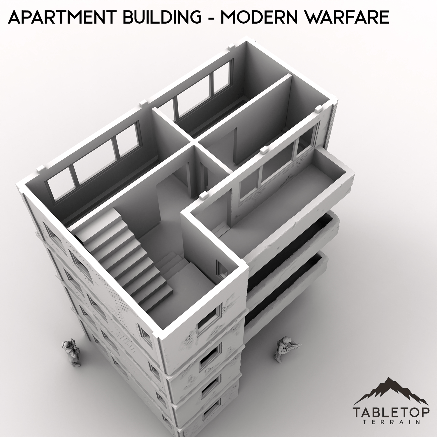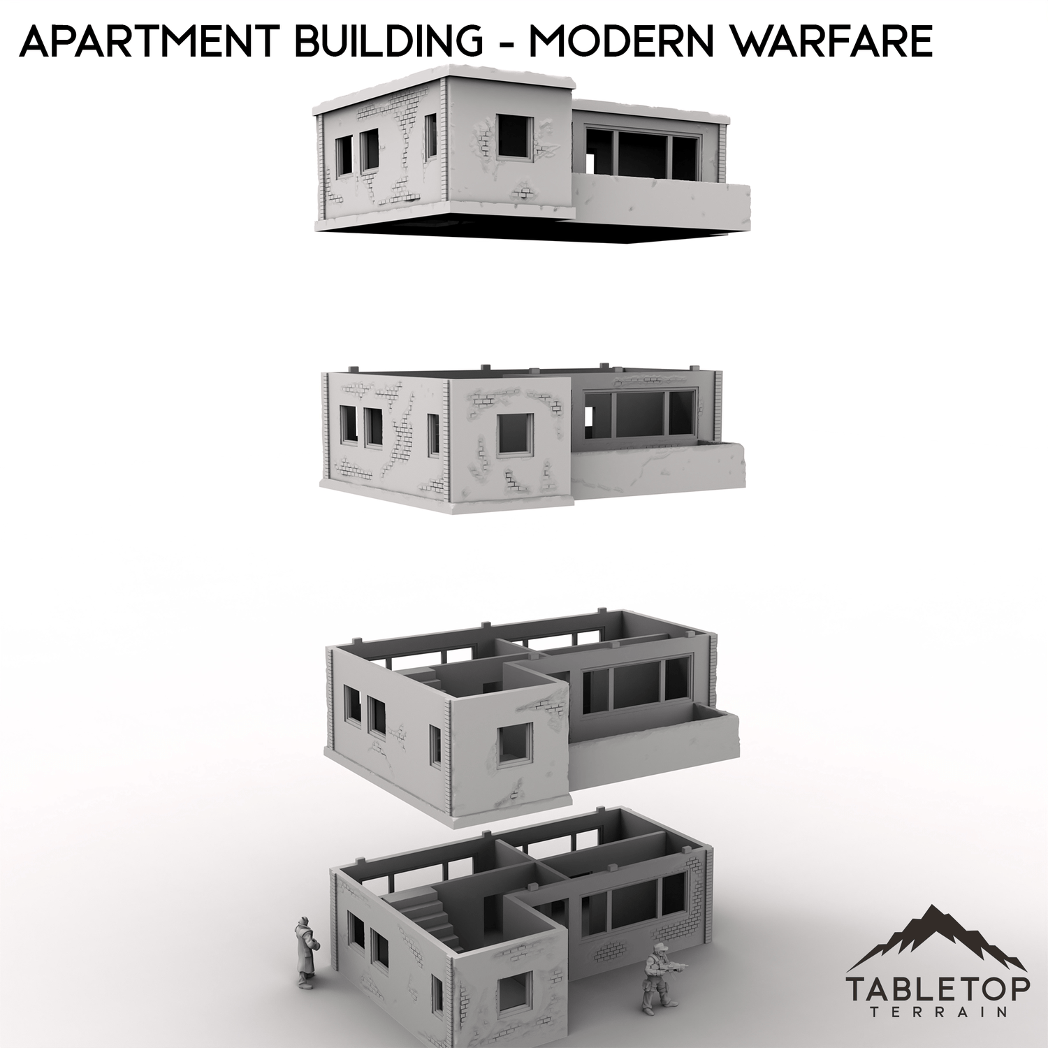 This stackable Apartment Building is designed for modern urban combat. It features four stackable floors, a removable roof, stairwells, and optional internal room dividers.