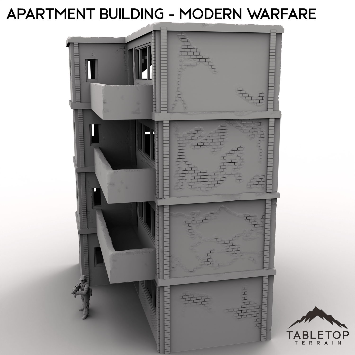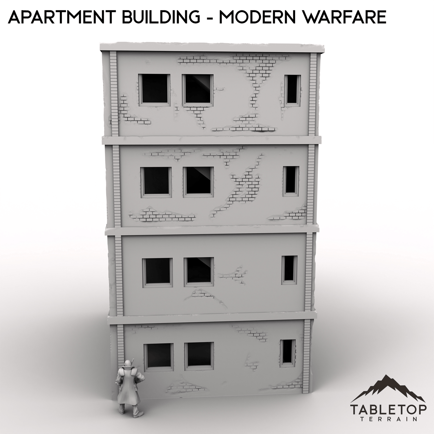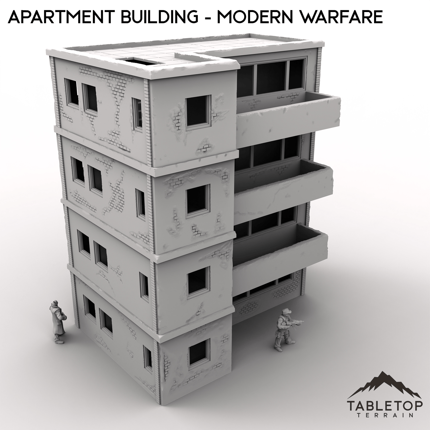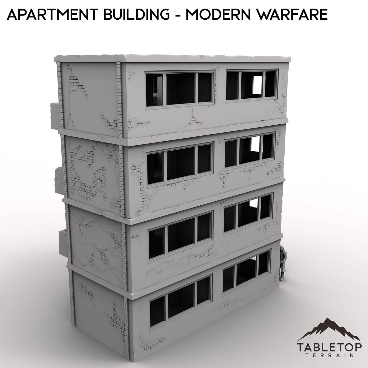 This stackable Apartment Building is designed for modern urban combat. It features four stackable floors, a removable roof, stairwells, and optional internal room dividers.