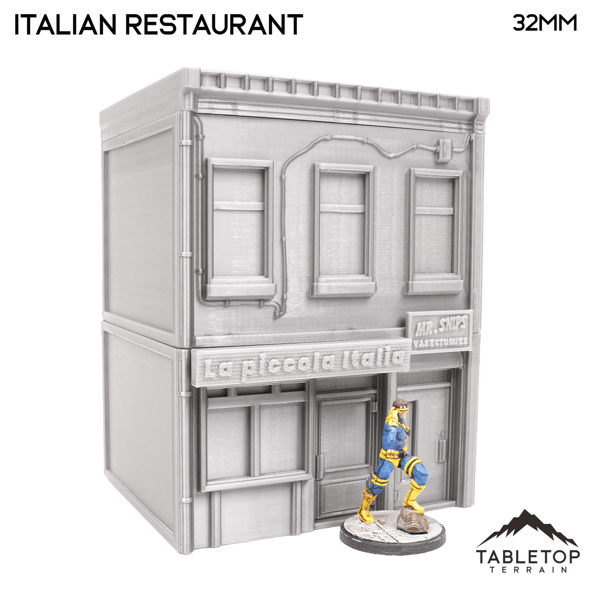 In 32mm scale, the Bleecker Street Italian Restaurant measures 113x104x144mm / 4.4x4.1x5.7 inches.