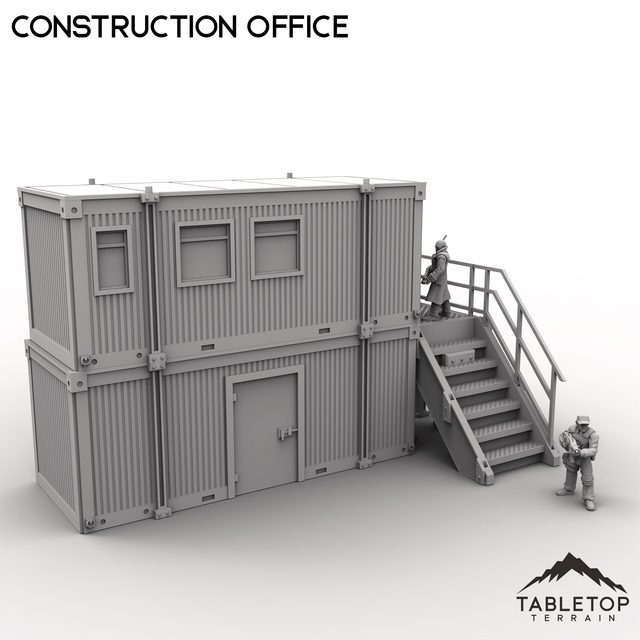 The Construction Office is a small two story office you might see on the job-site. Each level has a built in floor with a removable roof as well. There is an external staircase and railing to reach the upper level. The set is designed for urban hero tabletop games, but can work with any genre.