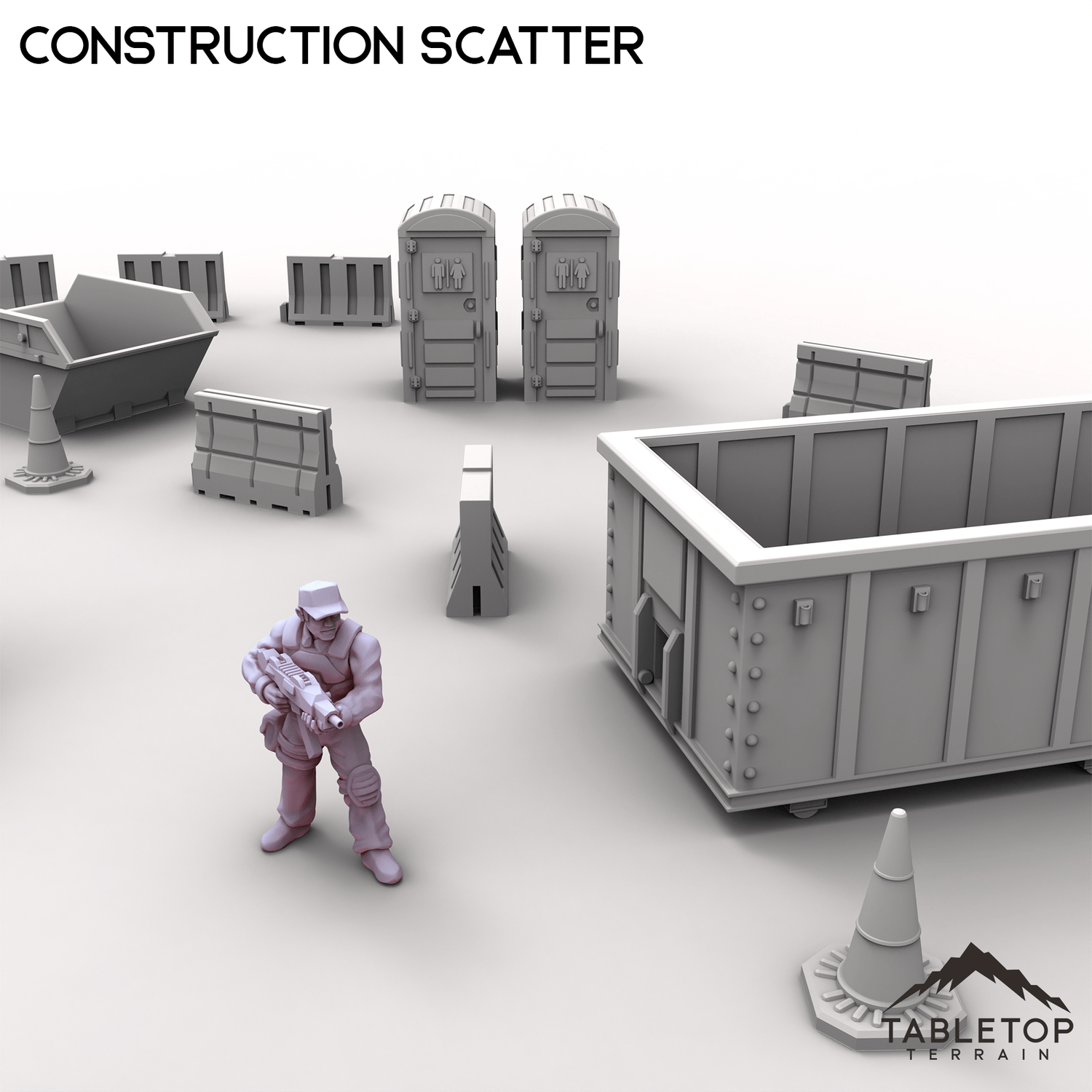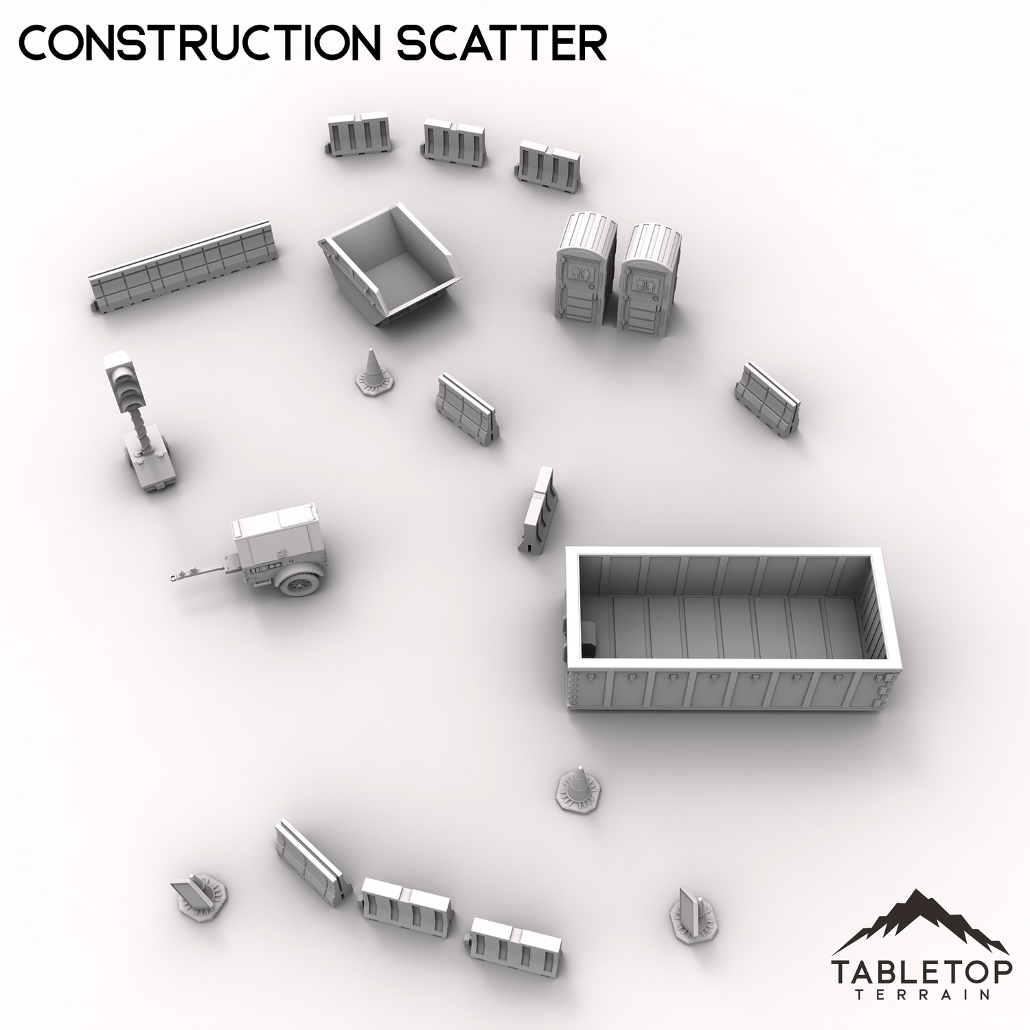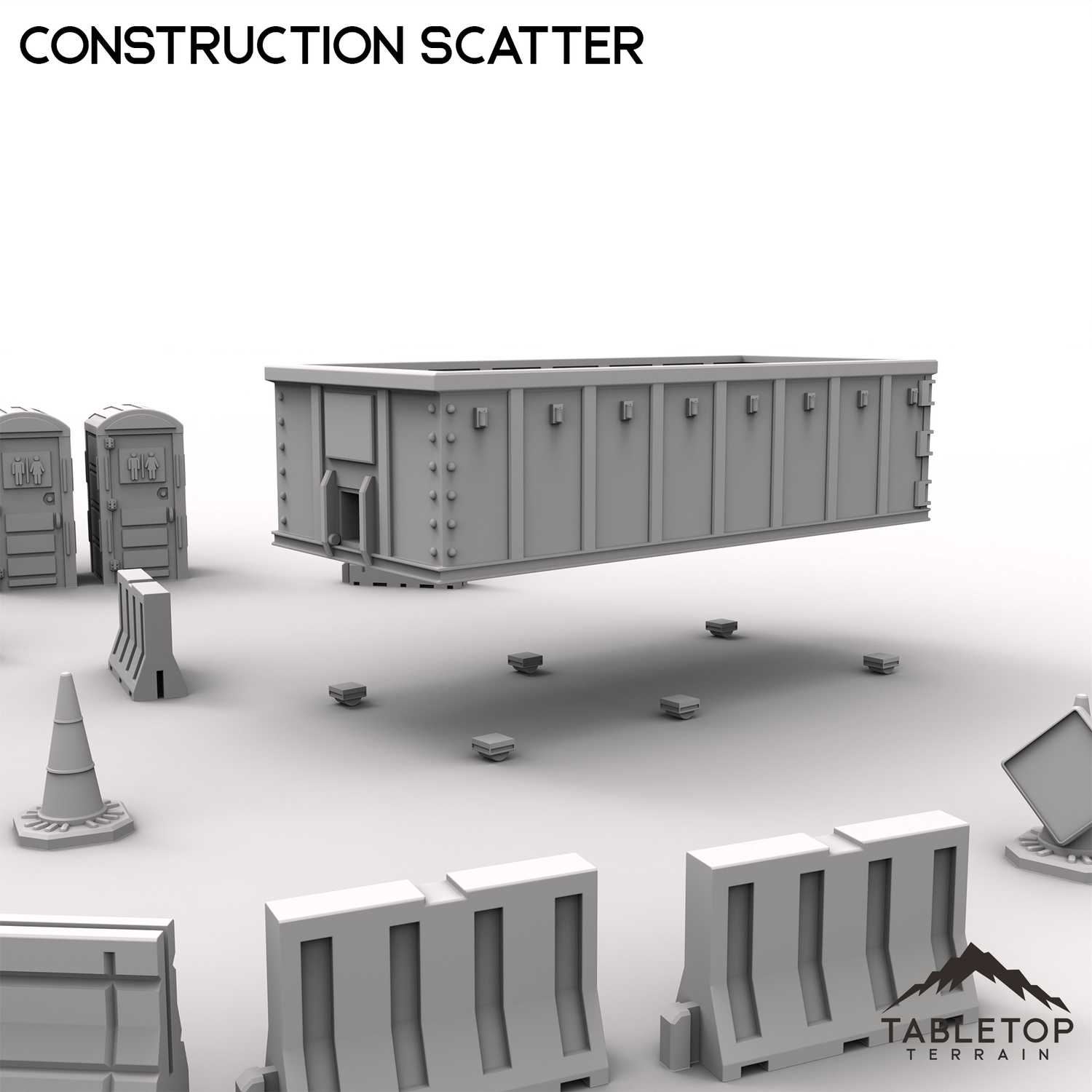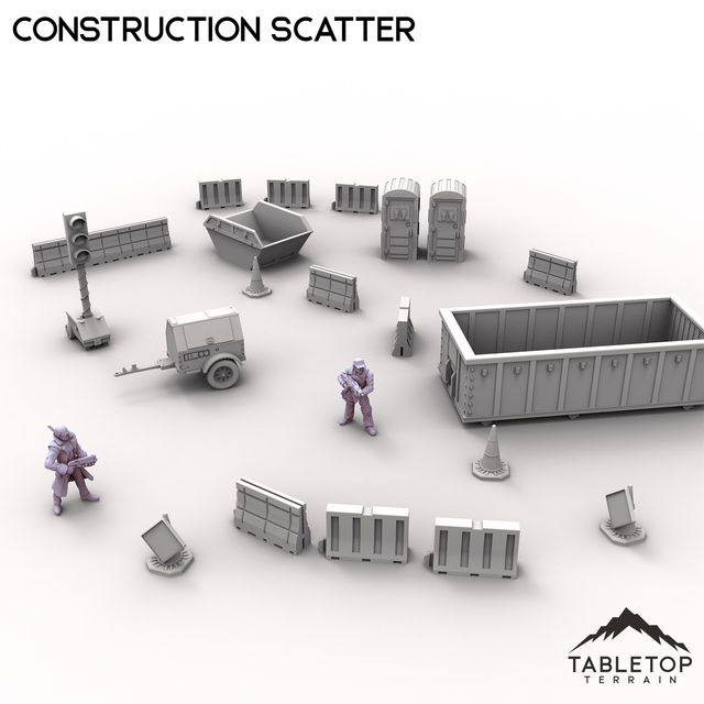 The Construction Scatter set is a collection of useful urban themed items for your tabletop. A mix of cones, dumpsters, lights, a portable generator on a functional axle, 2 portable restrooms, and a set of walls that can be clicked together or used one-by-one for different layouts. The set is perfect for urban hero tabletop games, but could work with other genres such as cyberpunk or sci-fi games.