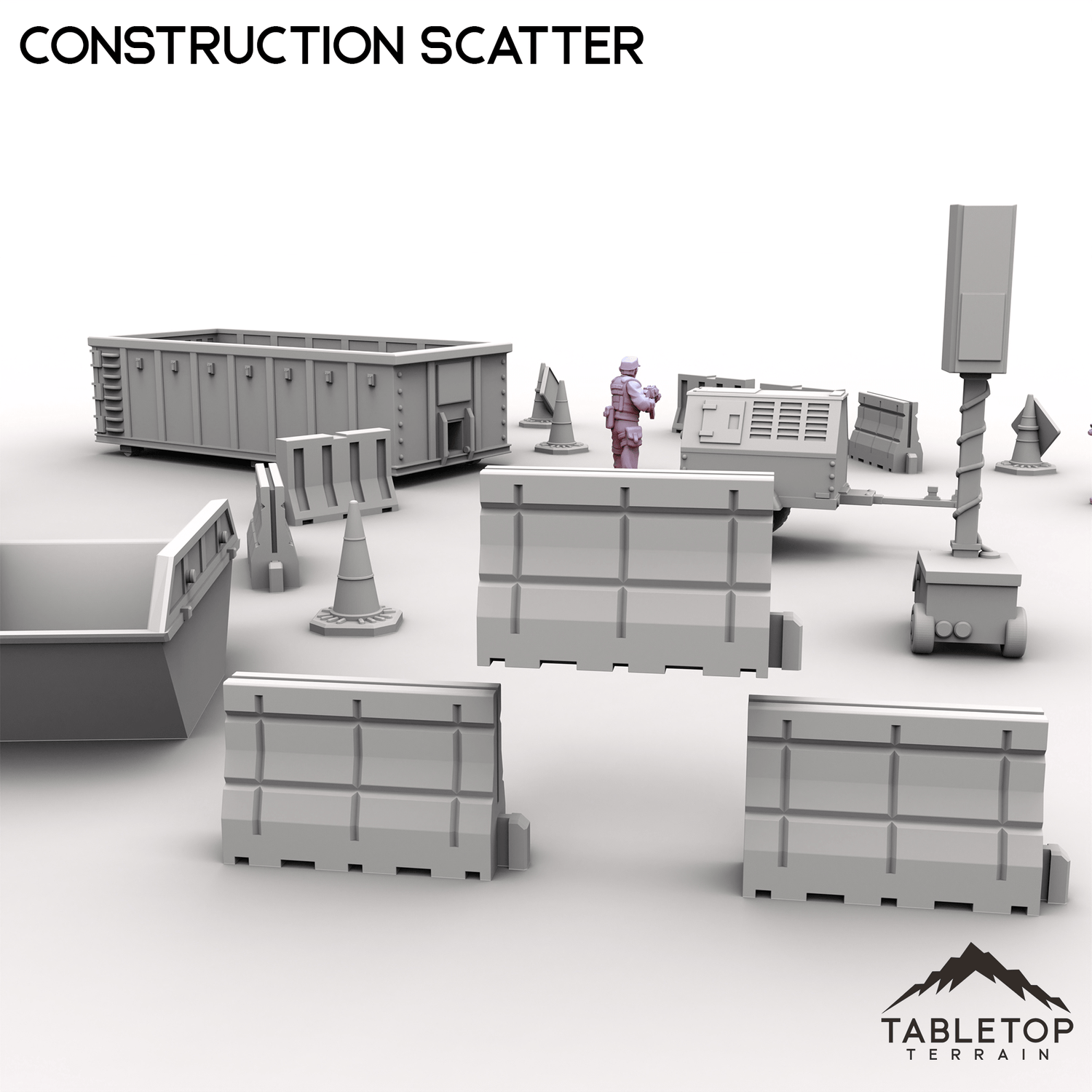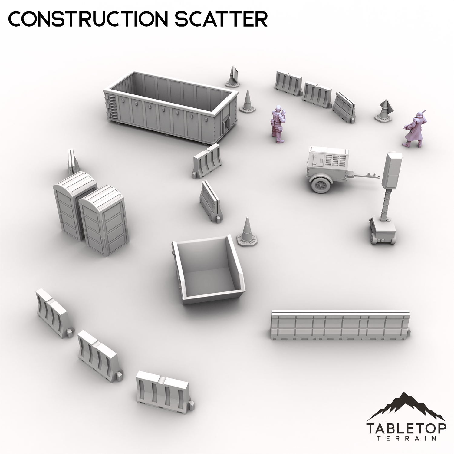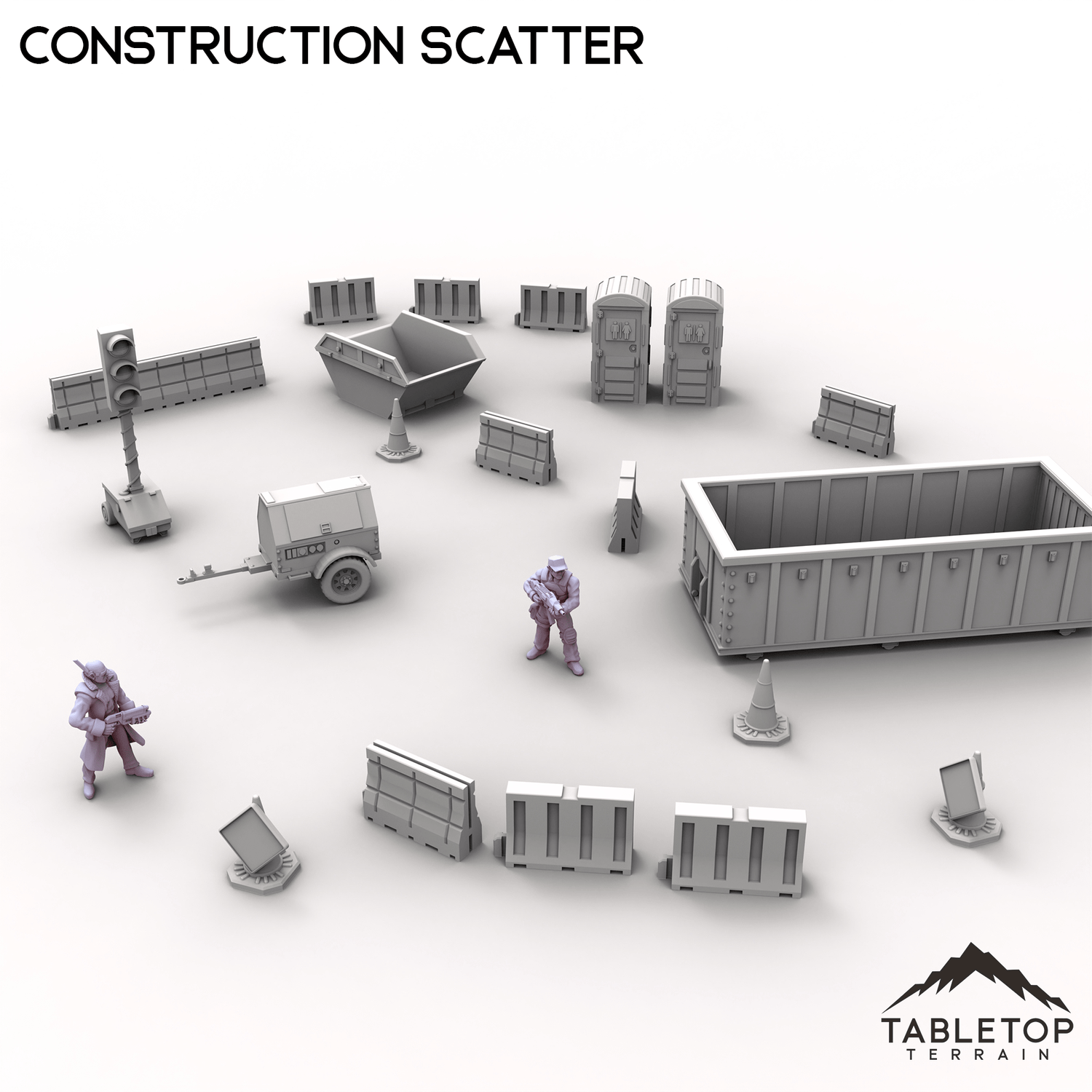 The Construction Scatter set is a collection of useful urban themed items for your tabletop. A mix of cones, dumpsters, lights, a portable generator on a functional axle, 2 portable restrooms, and a set of walls that can be clicked together or used one-by-one for different layouts. The set is perfect for urban hero tabletop games, but could work with other genres such as cyberpunk or sci-fi games.